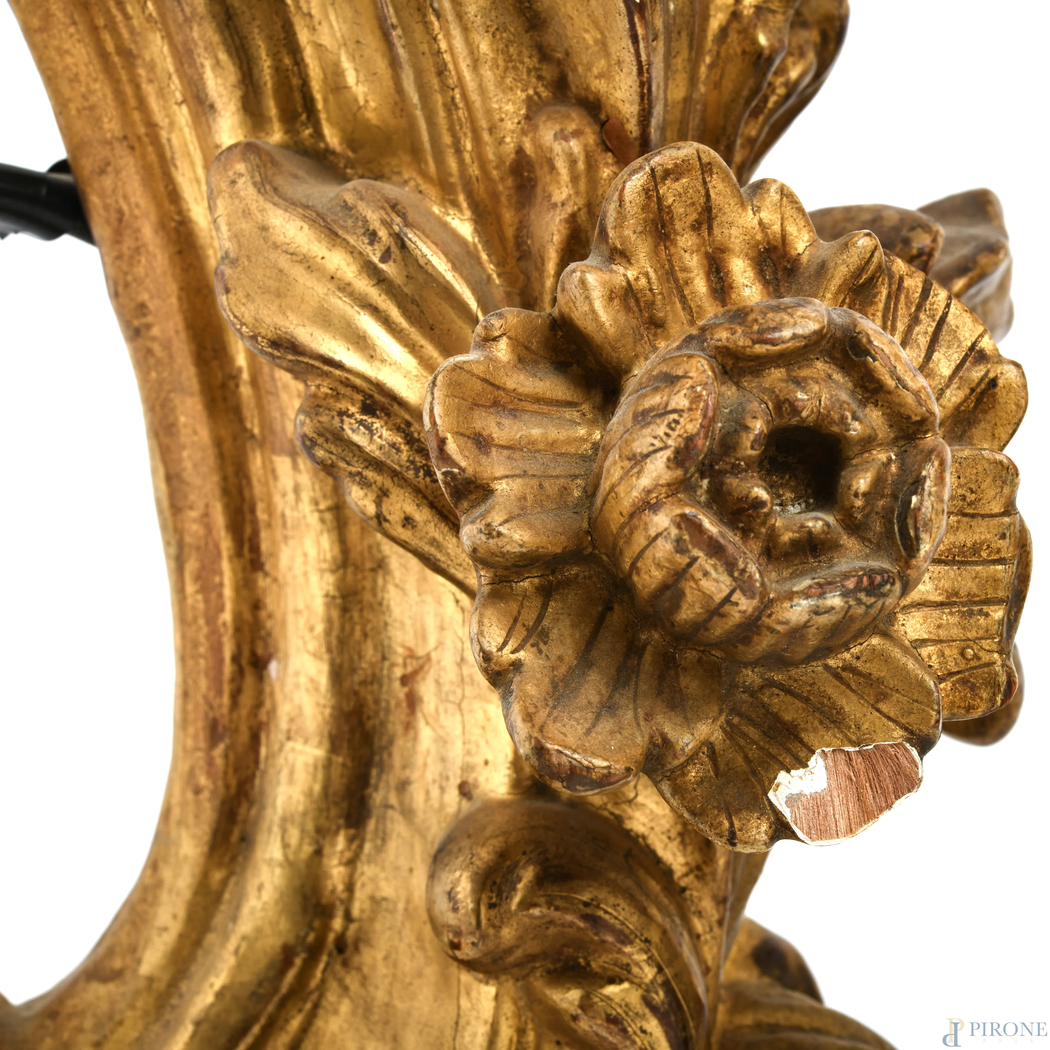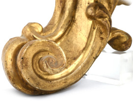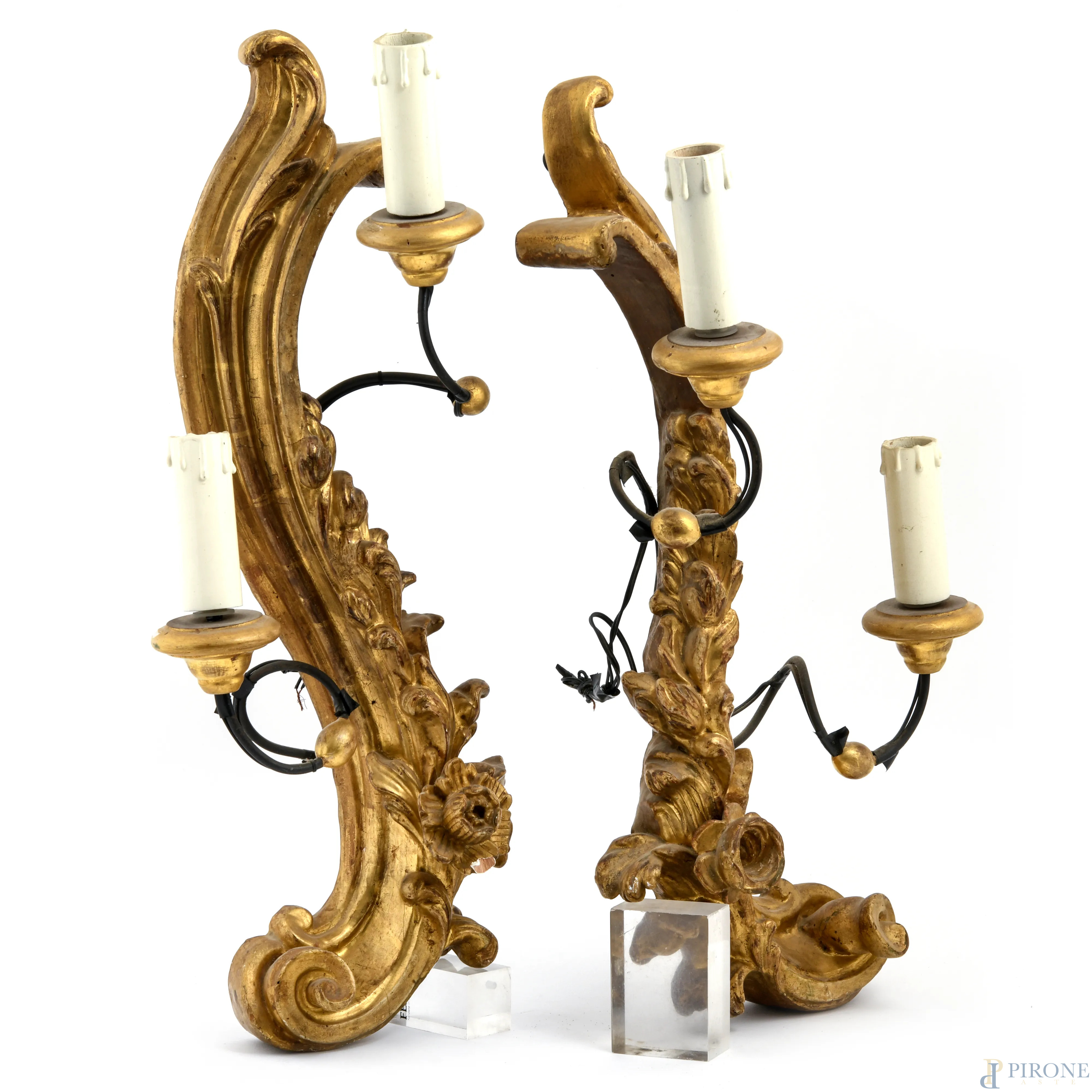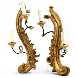 Coppia di appliques a due luci in legno intagliato e dorato a motivi vegetali e floreali, XIX secolo, cm 61x27x16, (segni di usura del tempo, cadute di doratura, scalfiture, difetti)