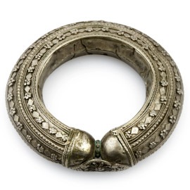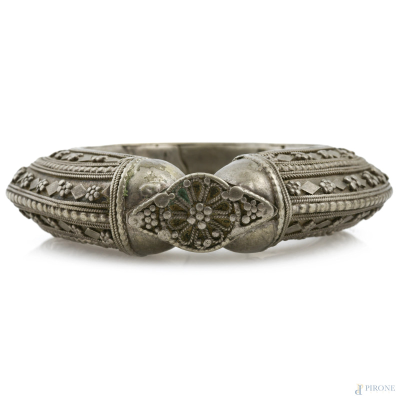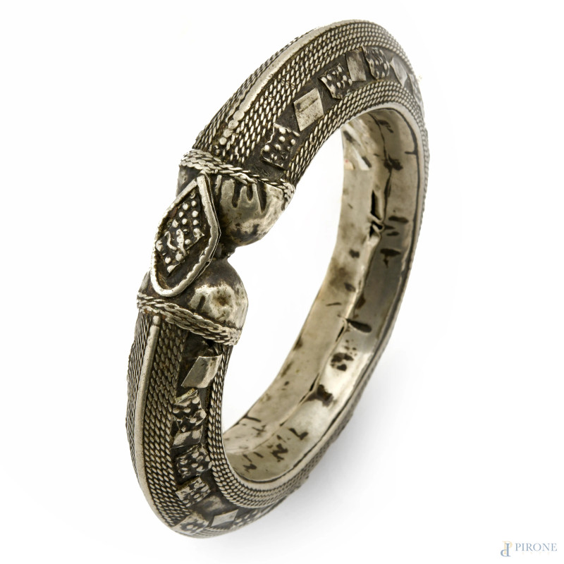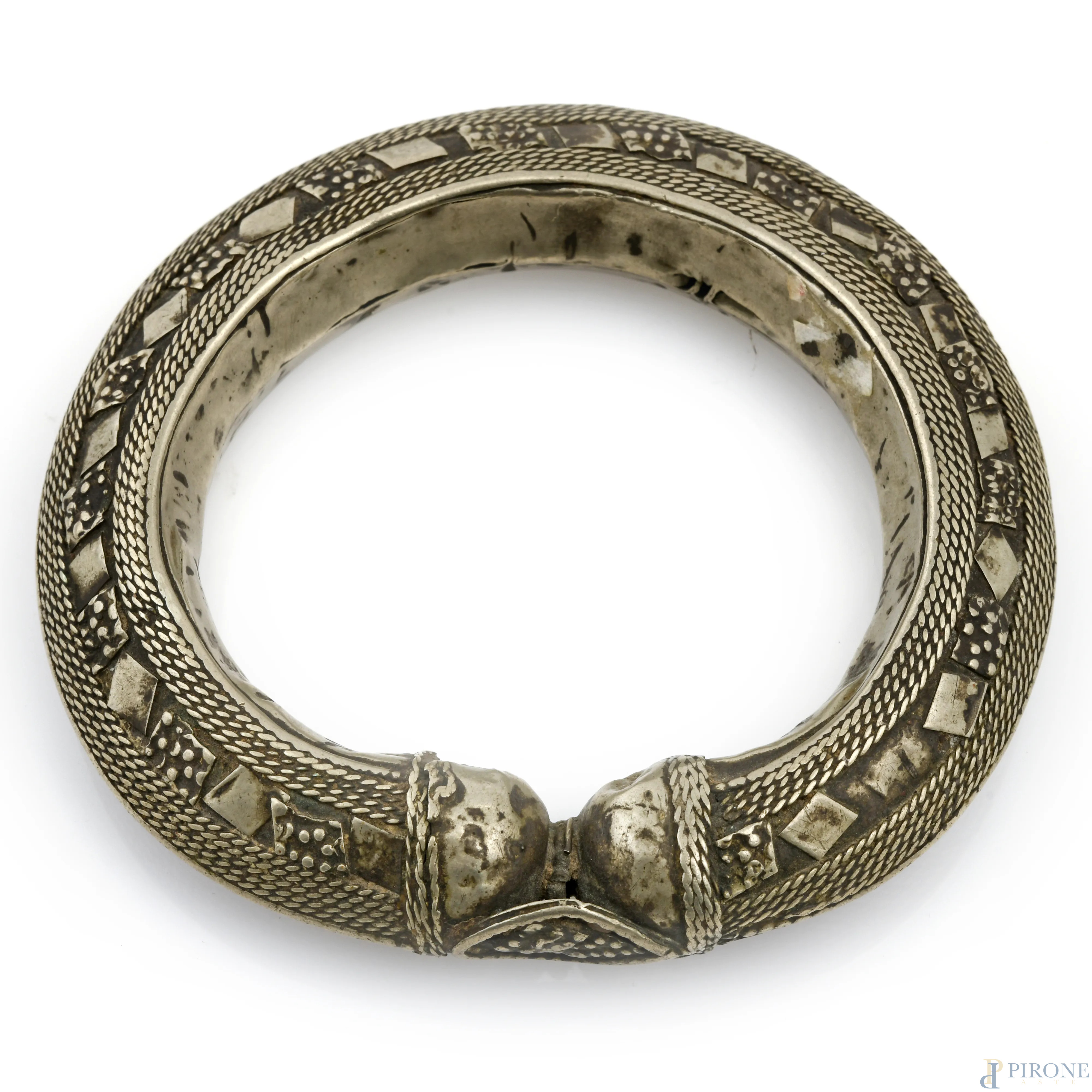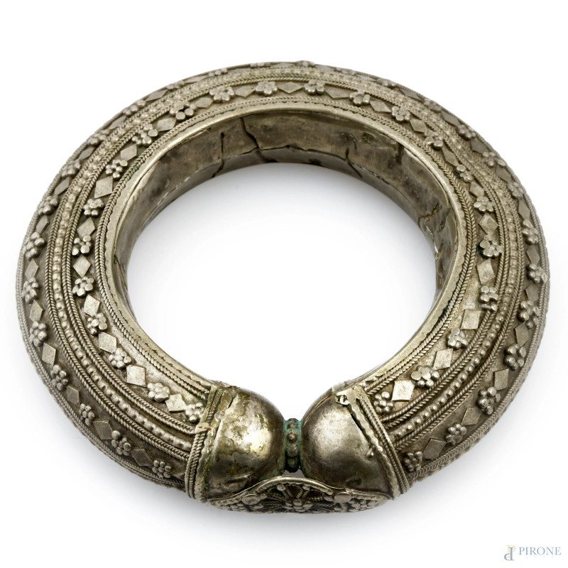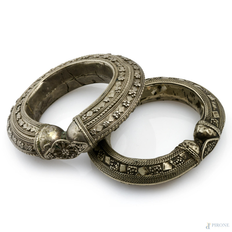 Coppia di bracciali etnici in metallo argentato, XX secolo, diametro massimo esterno cm 12, (segni di usura)