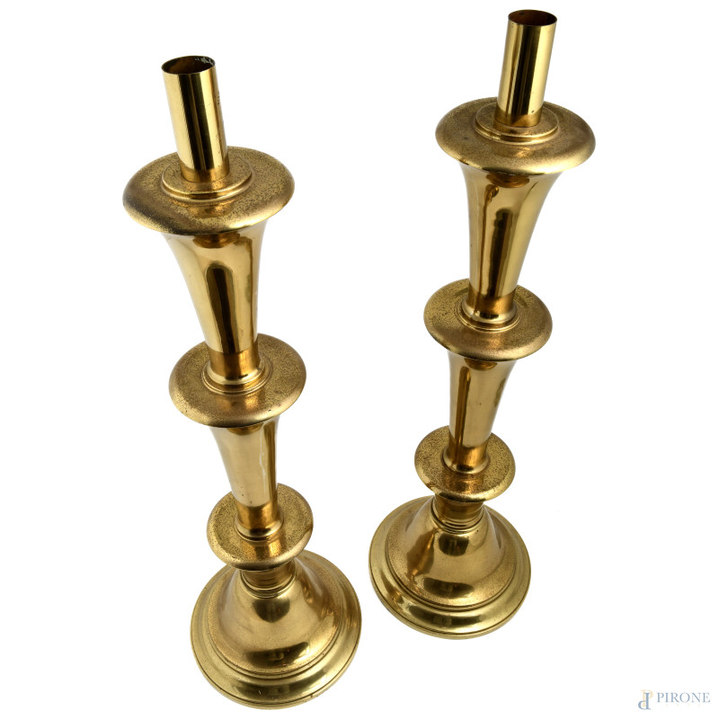 Coppia di candelieri Decò in ottone, XX secolo, altezza cm 80, (segni di usura, difetti)