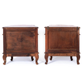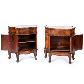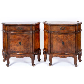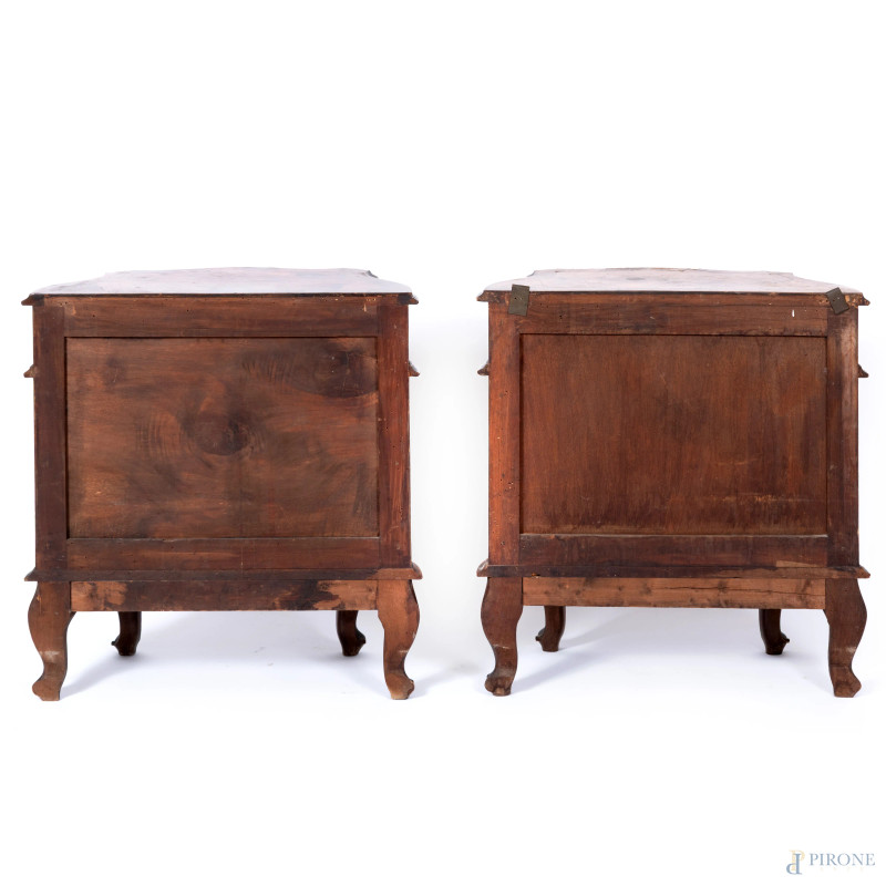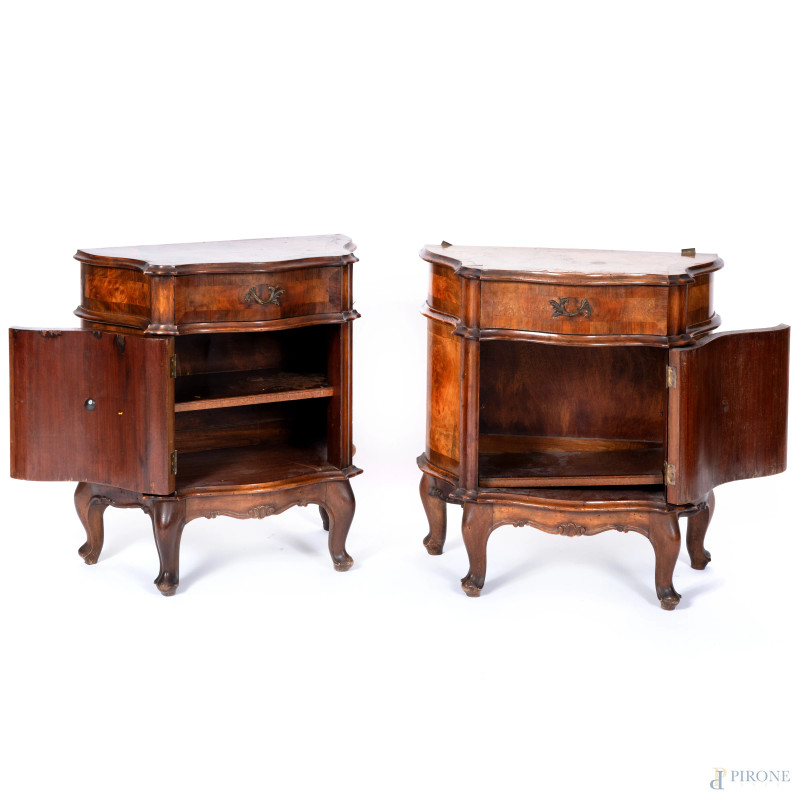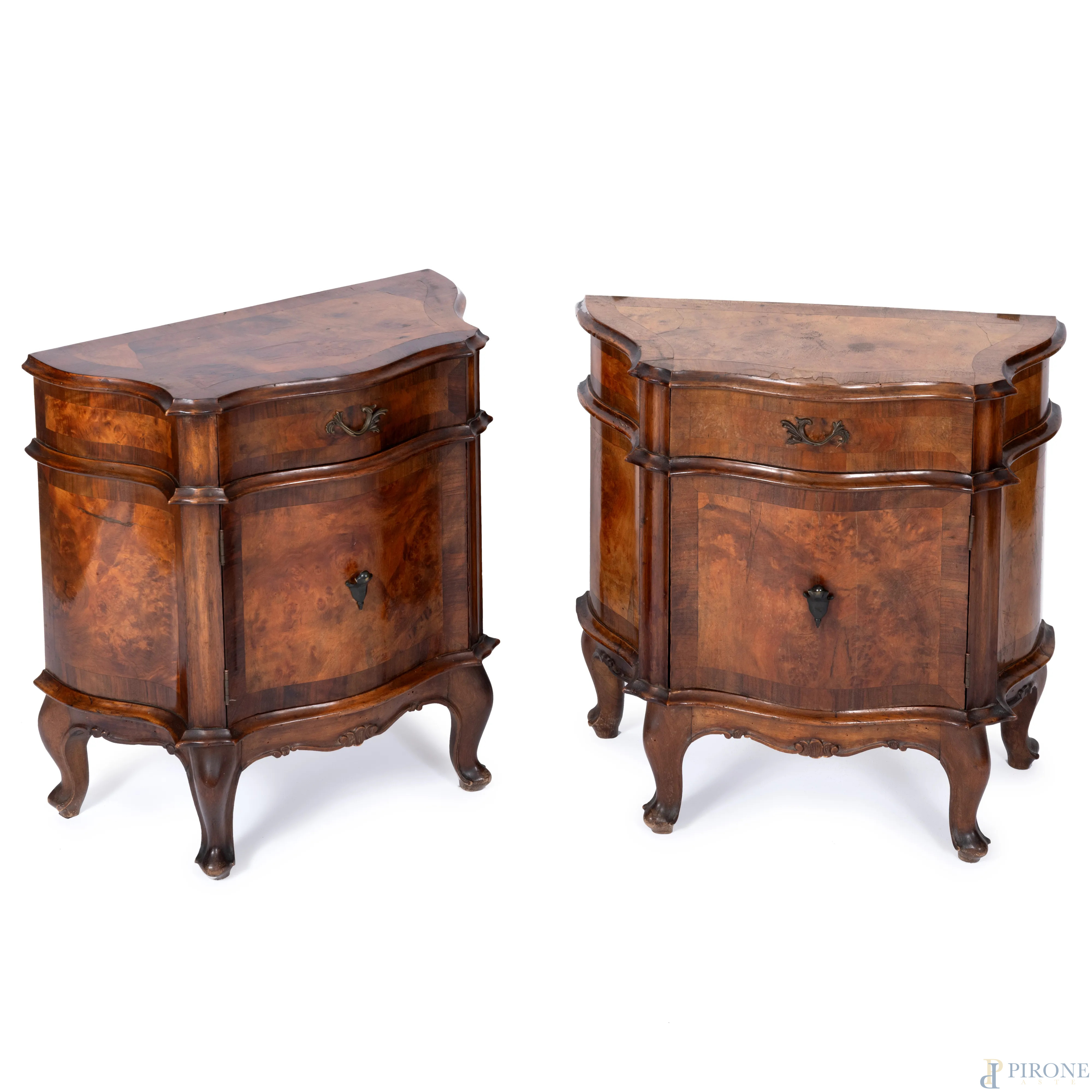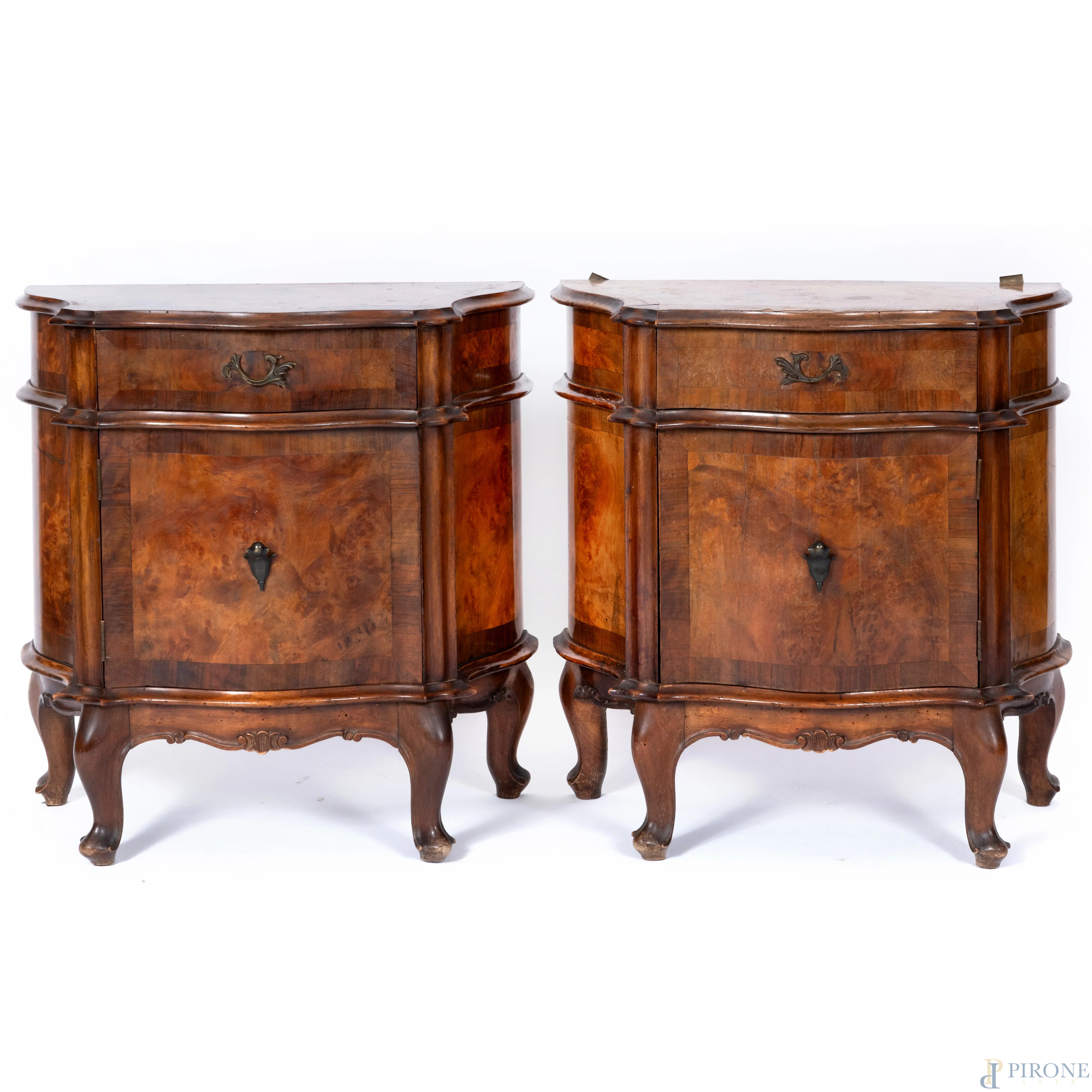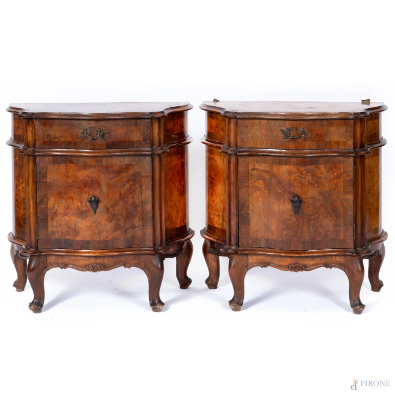 Coppia di comodini impiallacciati in noce e radica di noce ad uno sportello sormontato da cassetto dal profilo mosso, XX secolo, cm 67x64x30, (segni di usura, sollevamenti e perdita di impiallacciatura, fessurazioni, difetti)