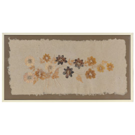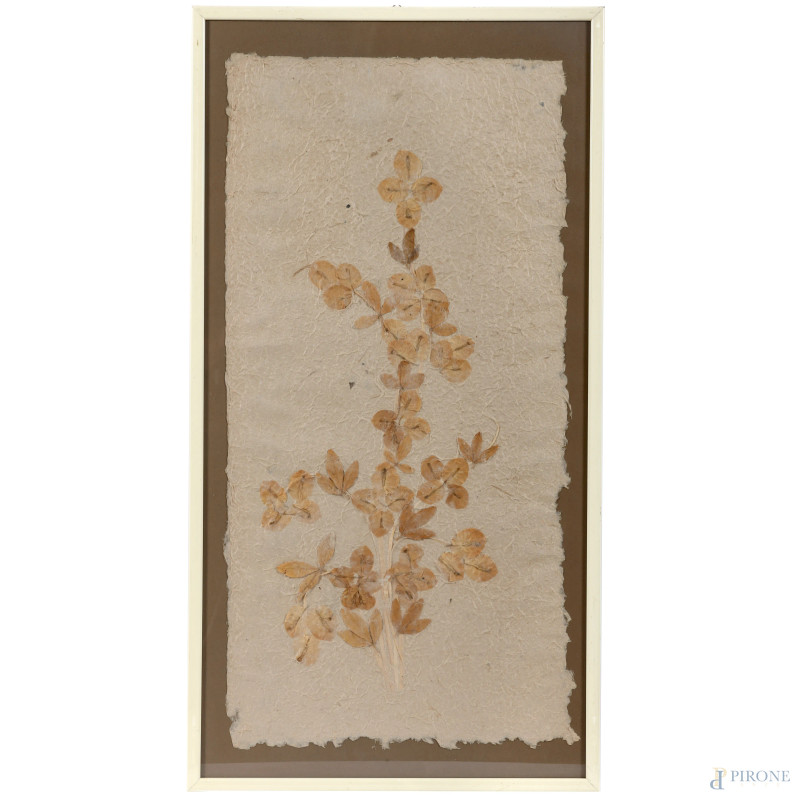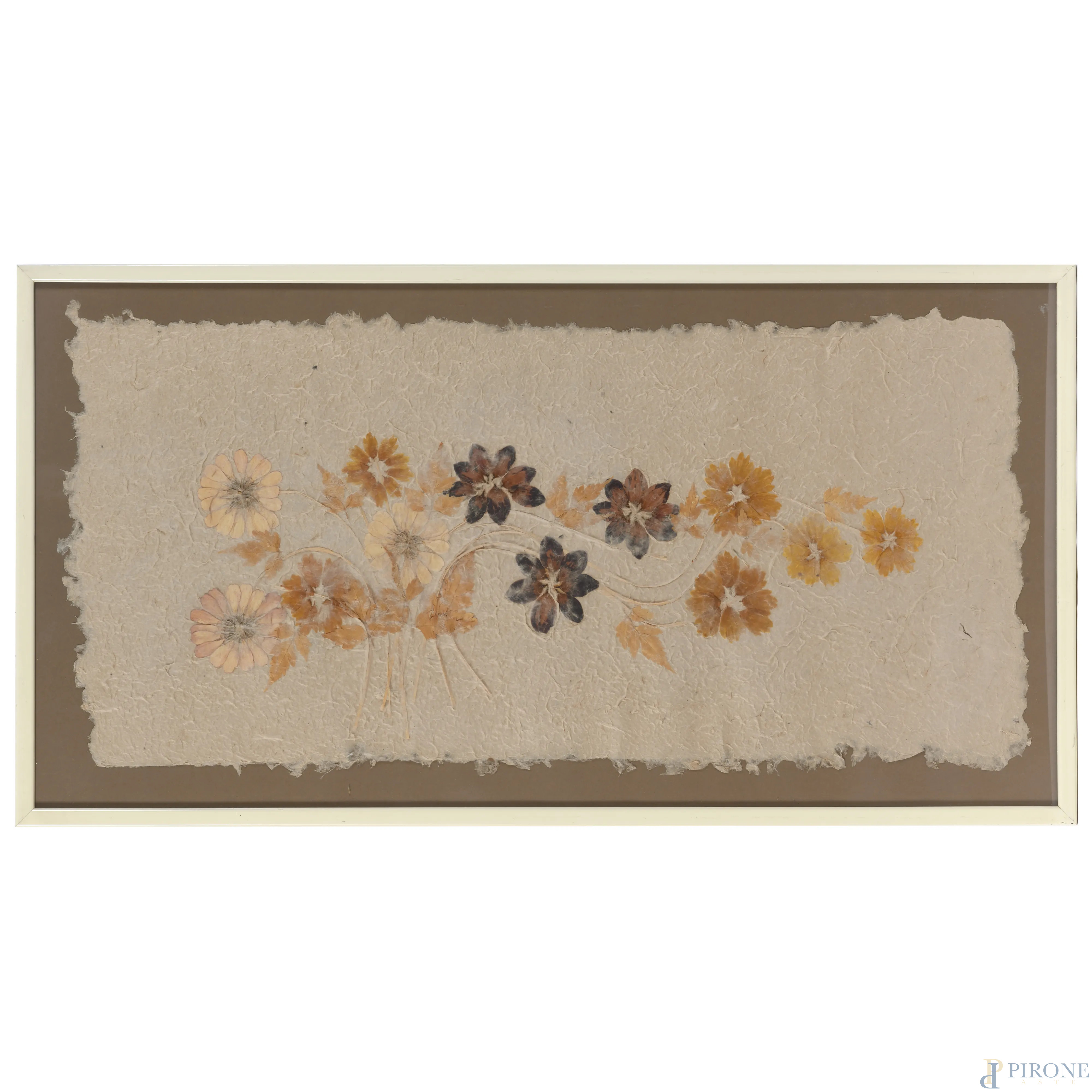 Coppia di composizioni floreali, XX secolo, fiori essiccati su carta, cm 70x36 circa, entro cornice