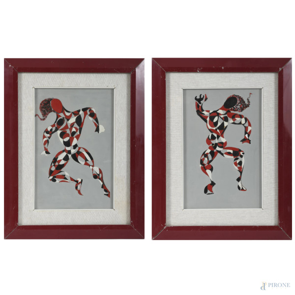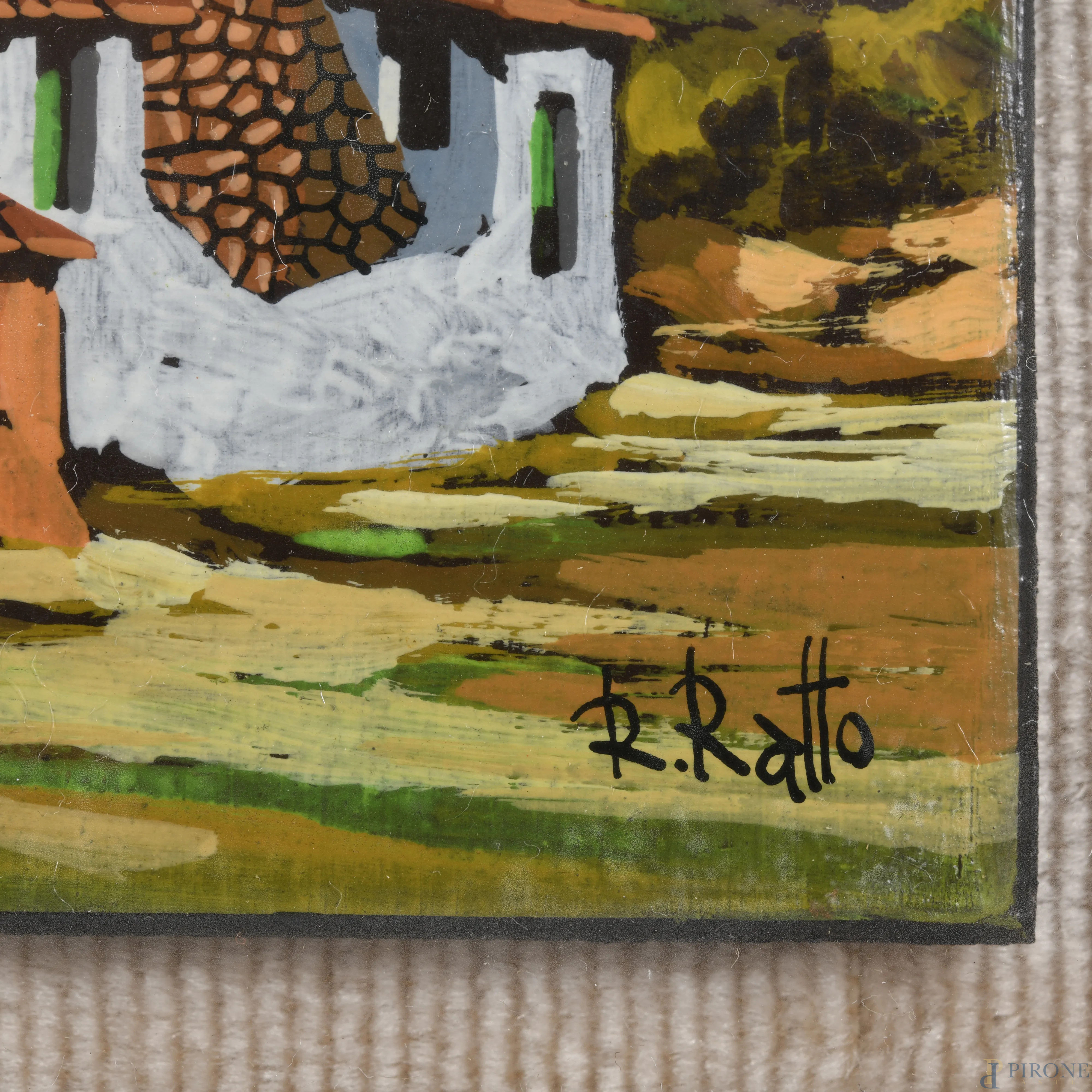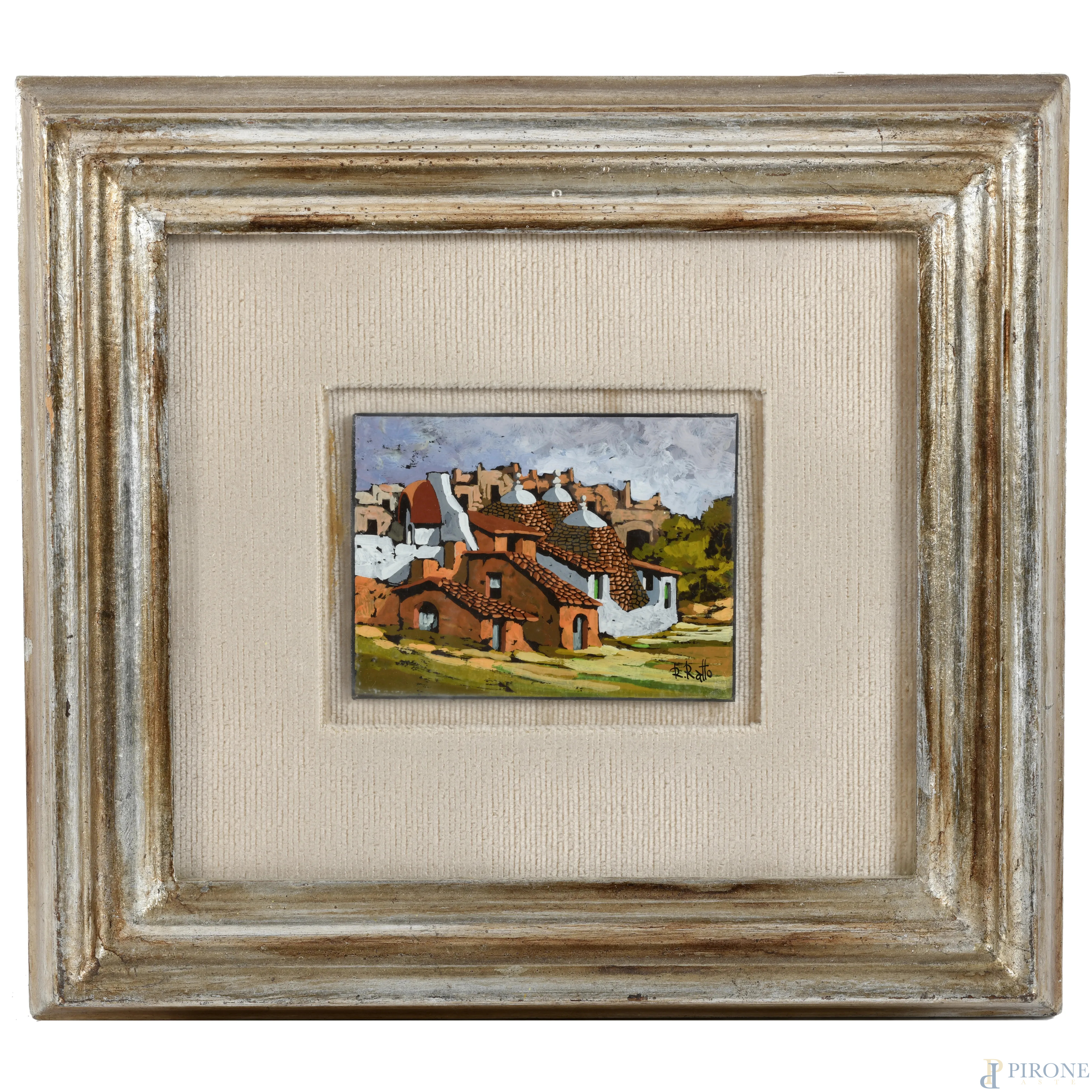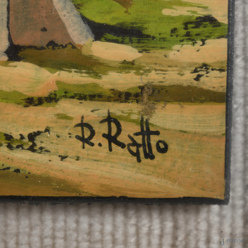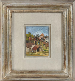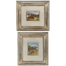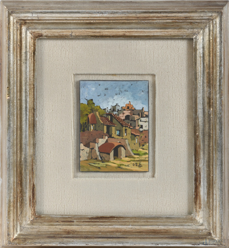 Coppia di dipinti raffiguranti scorci di paese, XX secolo, olio su compensato, misure massime cm 12x9, firmati in basso a destra, entro cornice