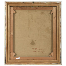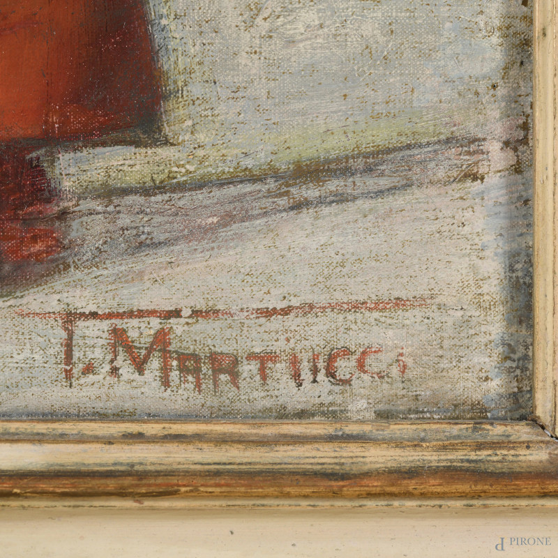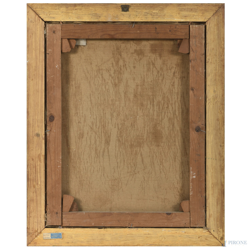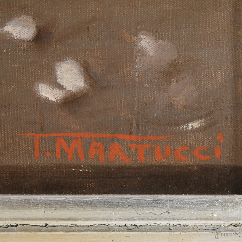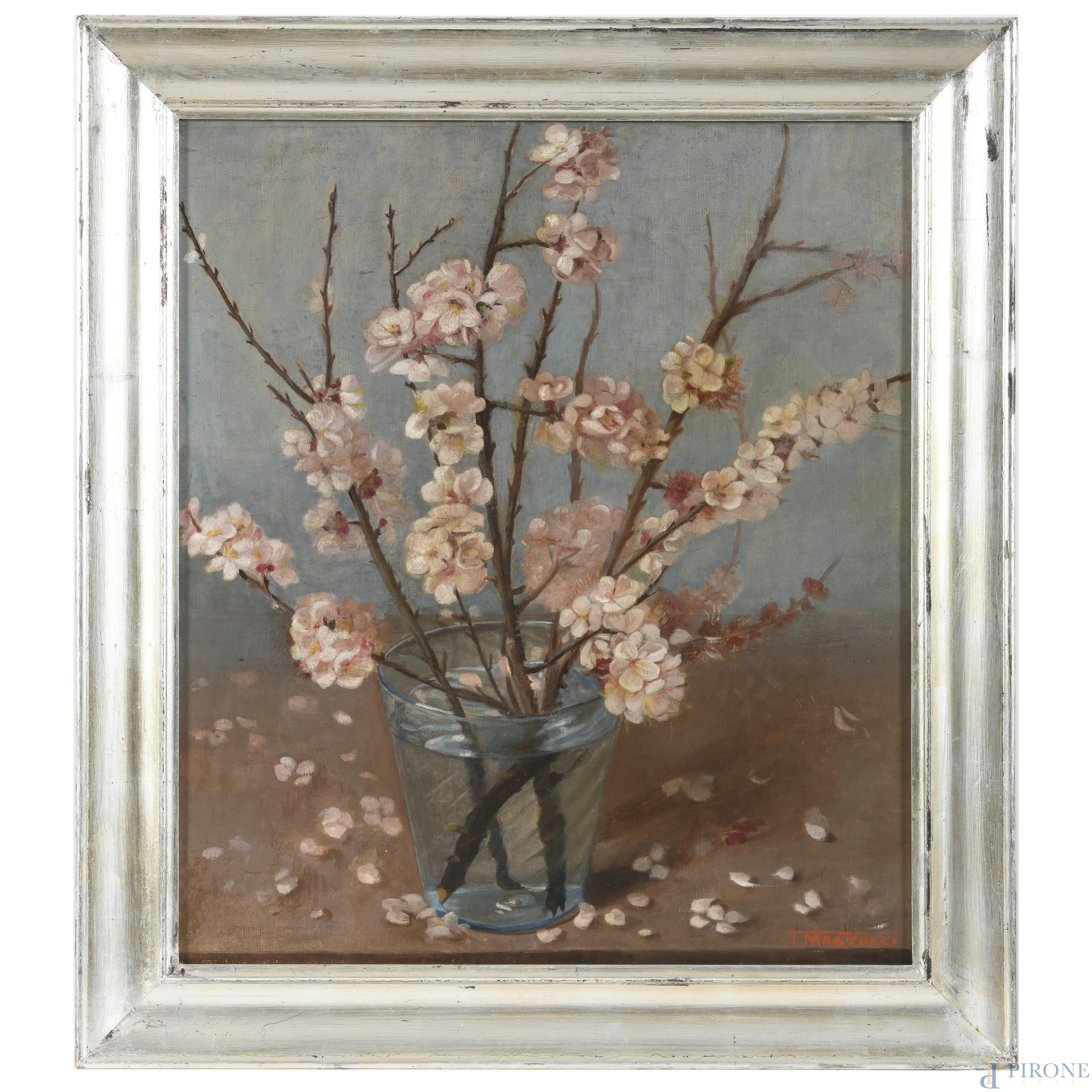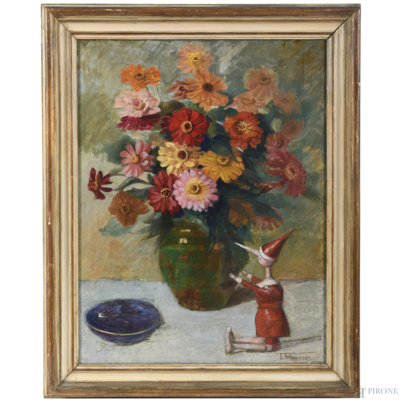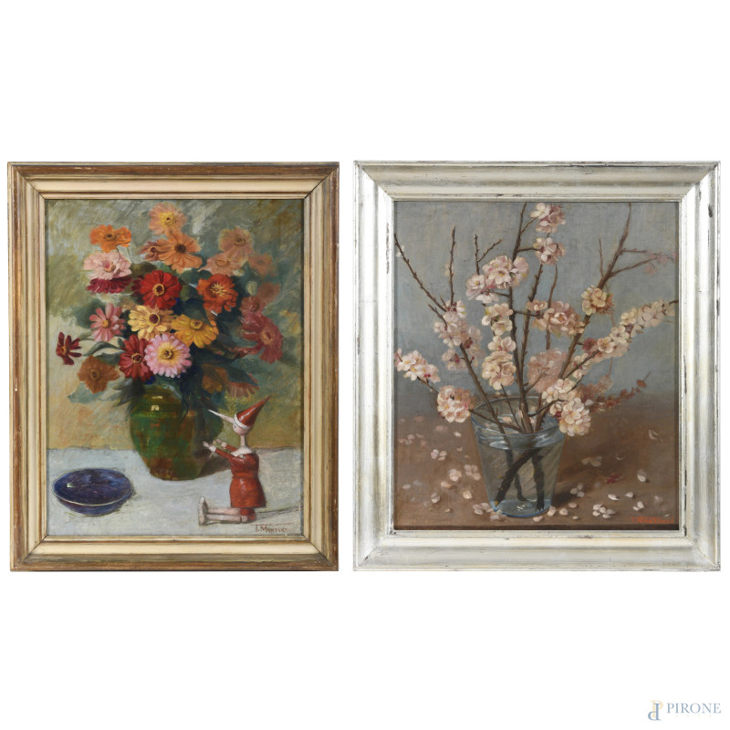 Coppia di dipinti raffiguranti vasi di fiori, olio su tela, misure massime cm 58x51, firmato in basso a destra, entro cornice, (cadute di colore, abrasioni, tela da ritensionare)