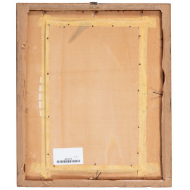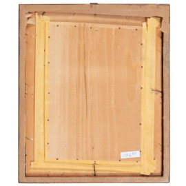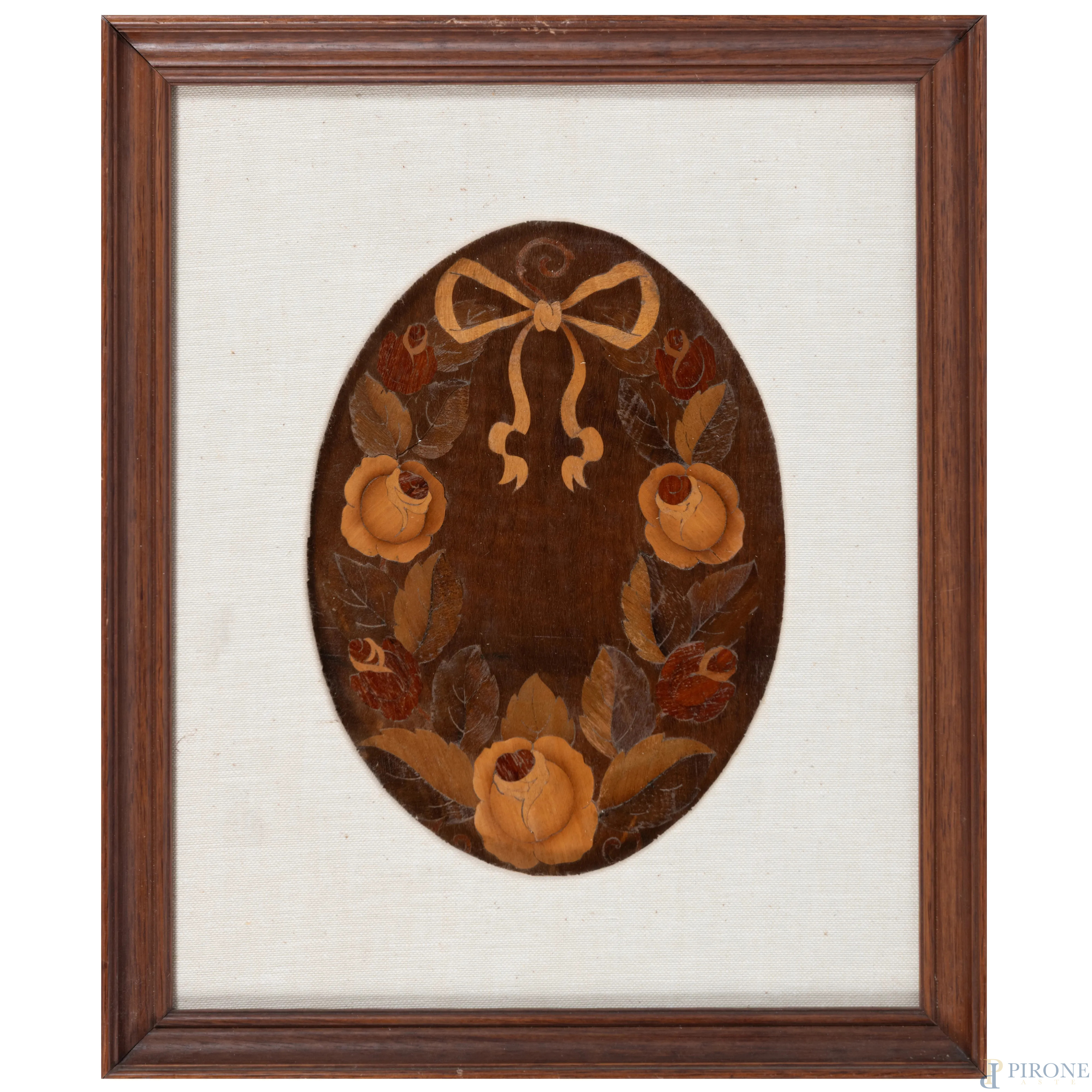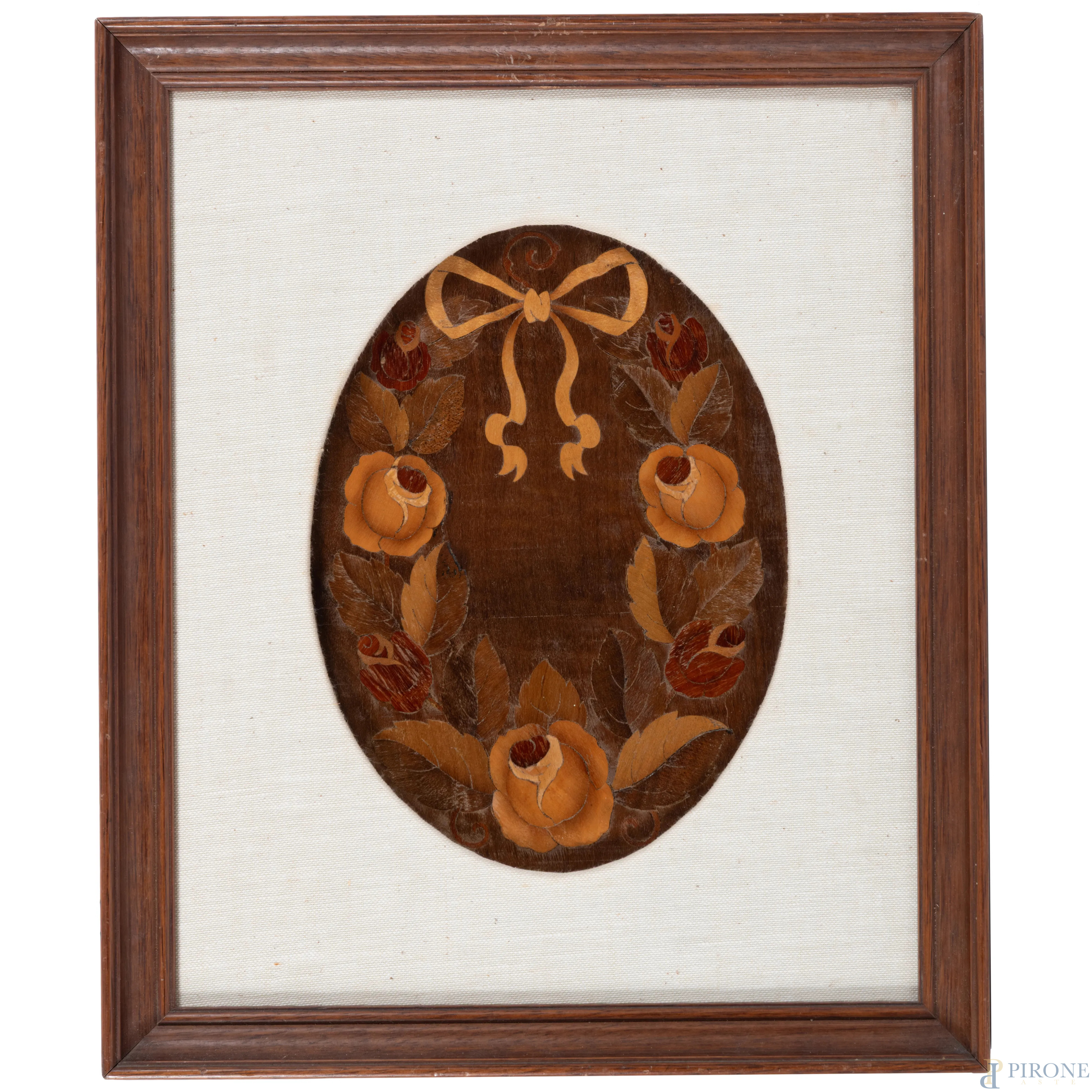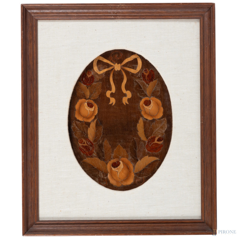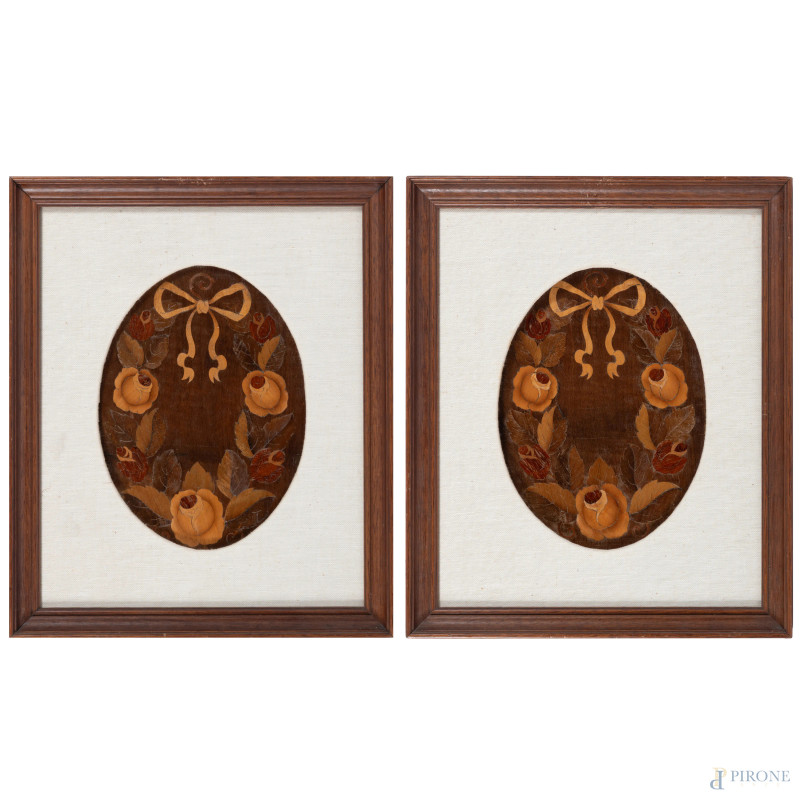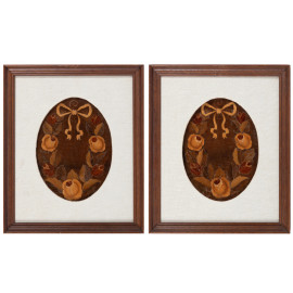 Coppia di festoni, XX secolo, intarsio e pirografo su legno, cm 28x19,5, entro cornice, (segni di usura)
