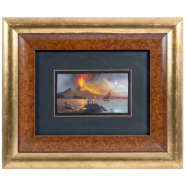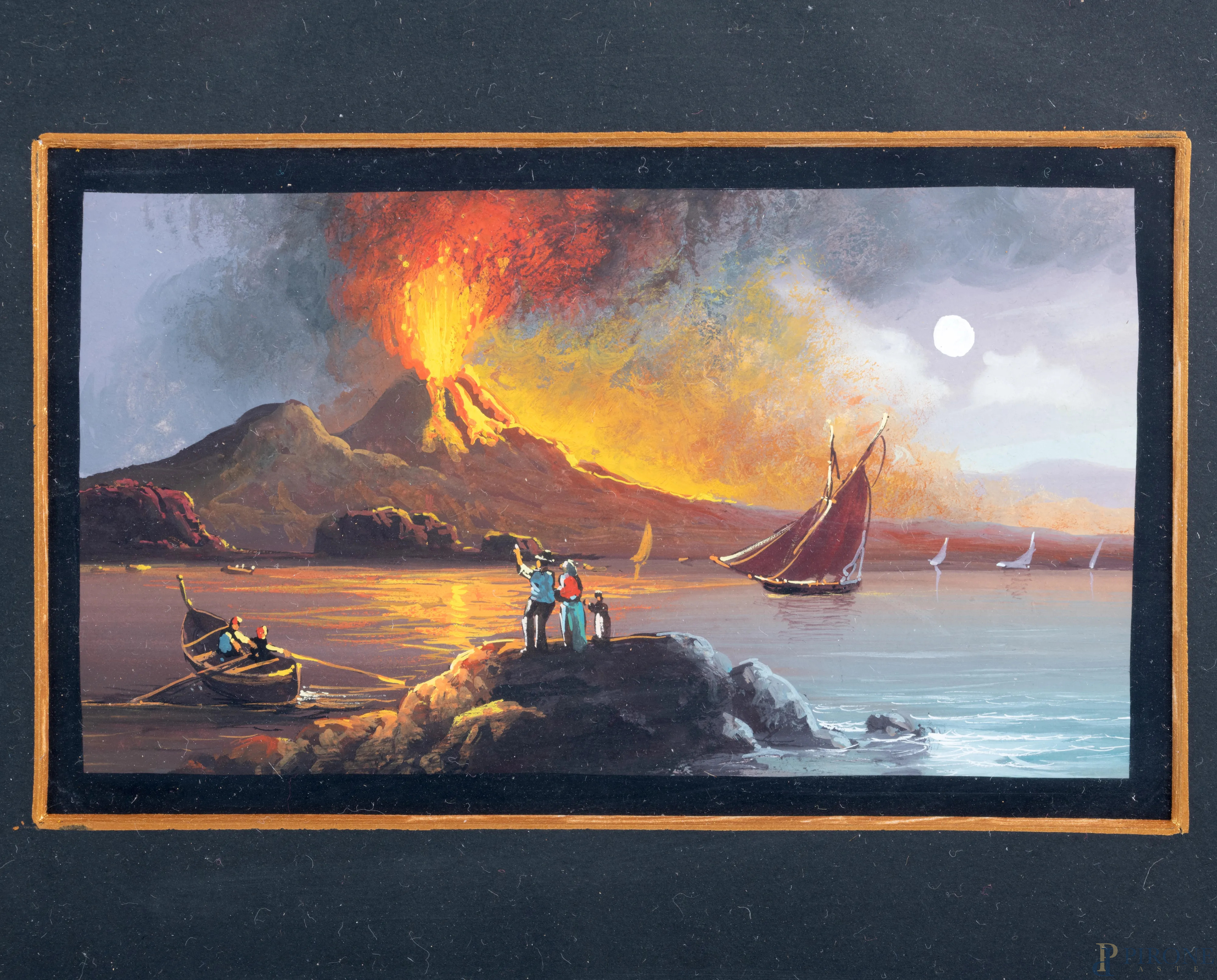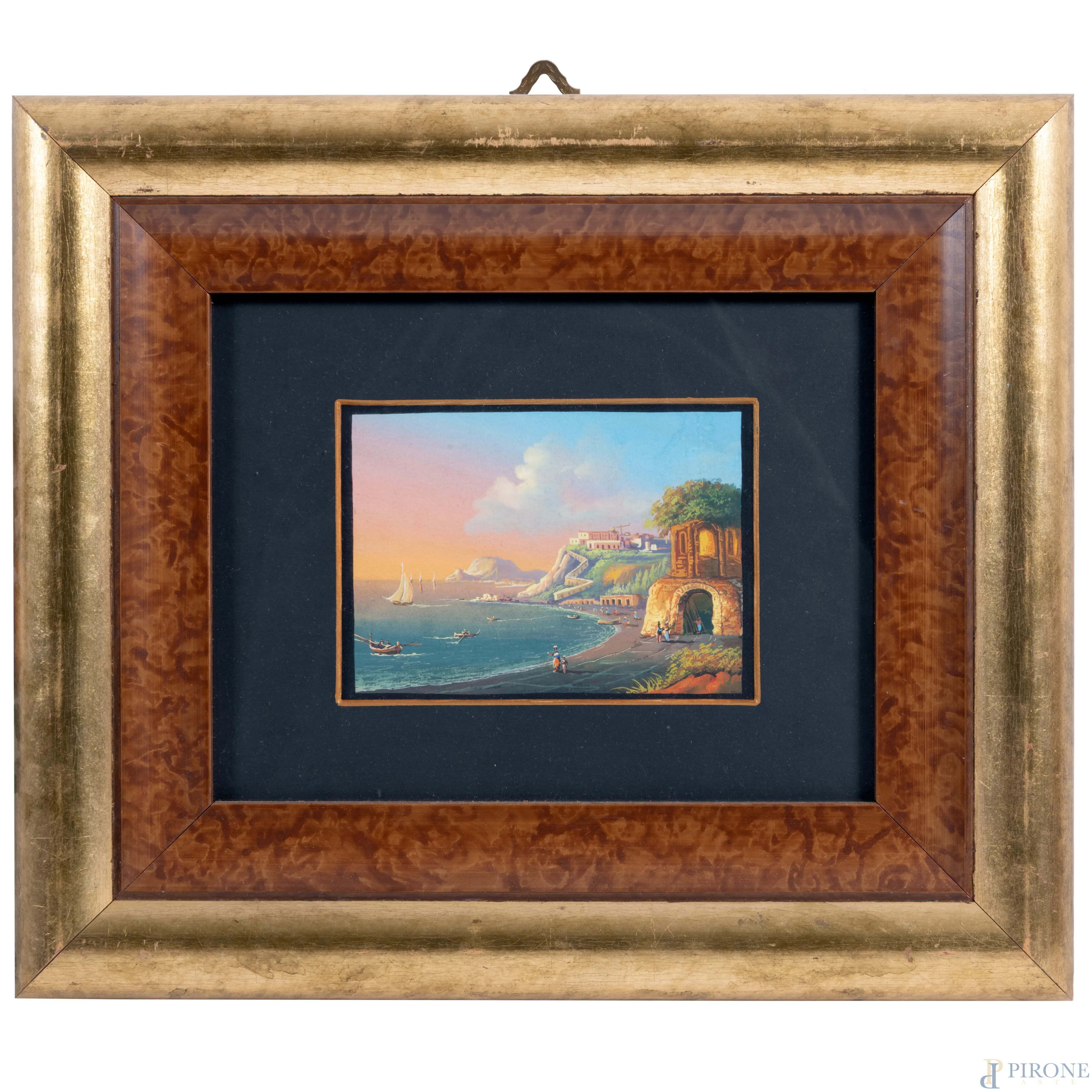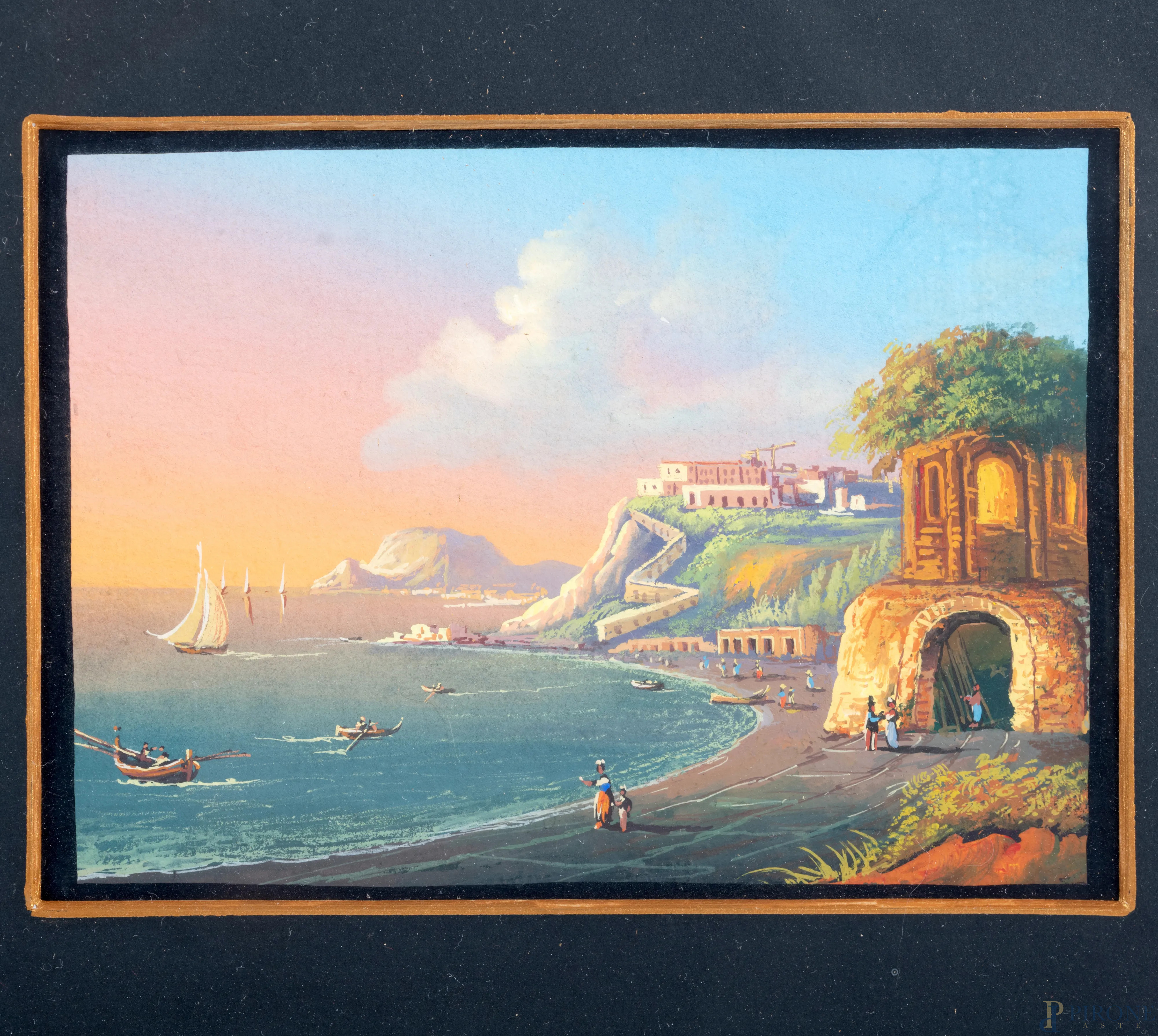 Coppia di gouaches raffiguranti vedute di Napoli, XX secolo, misure massime cm 17x22 compreso passepartout, entro cornice