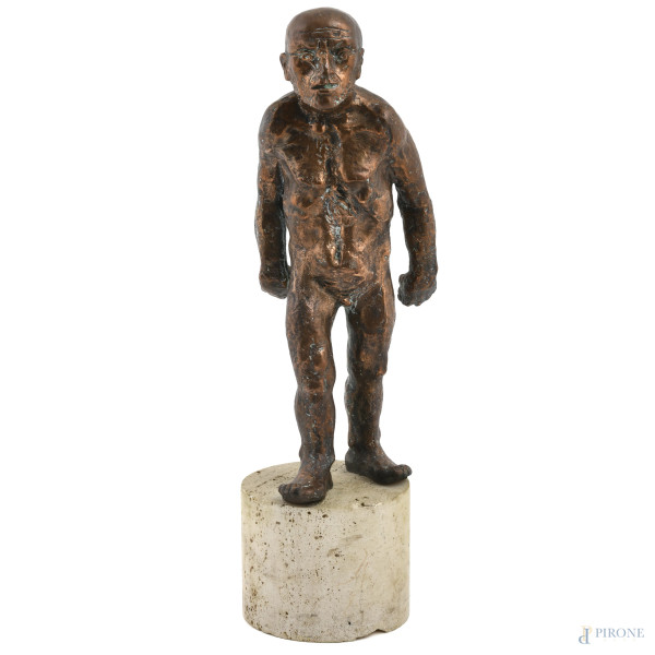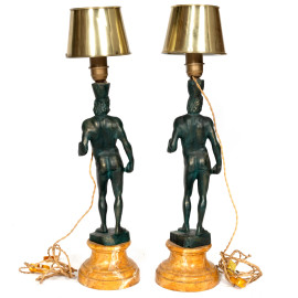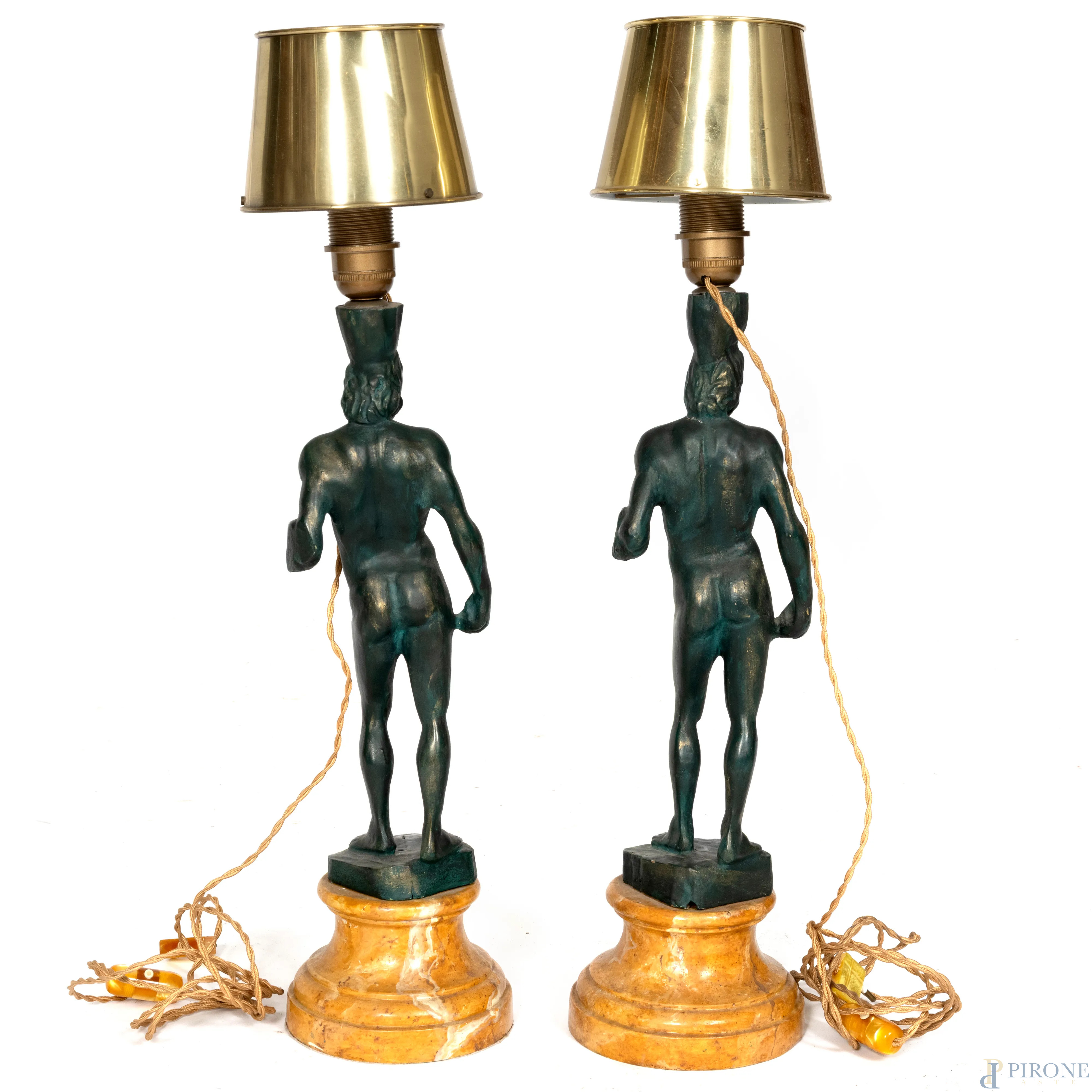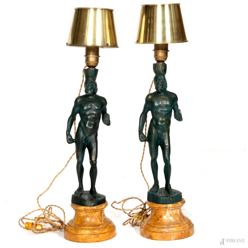 Coppia di lampade da tavolo in legno tinto marmo e bronzo con struttura a guisa dei bronzi di Riace, XX secolo, altezza cm 63,5, (segni di usura,c adute di colore, da revisionare)