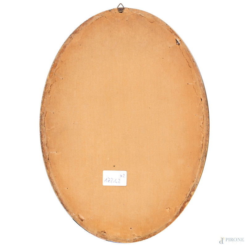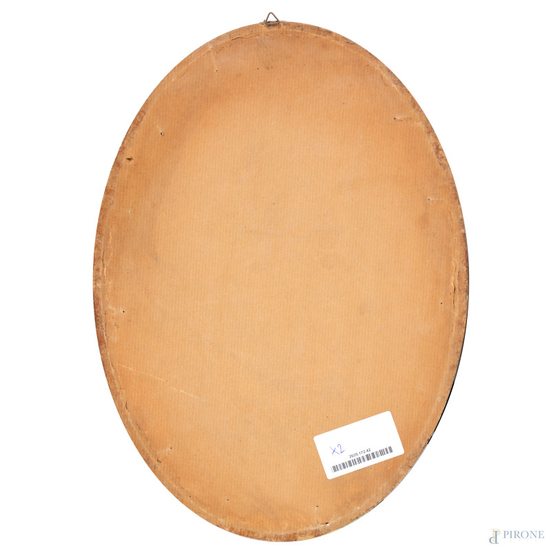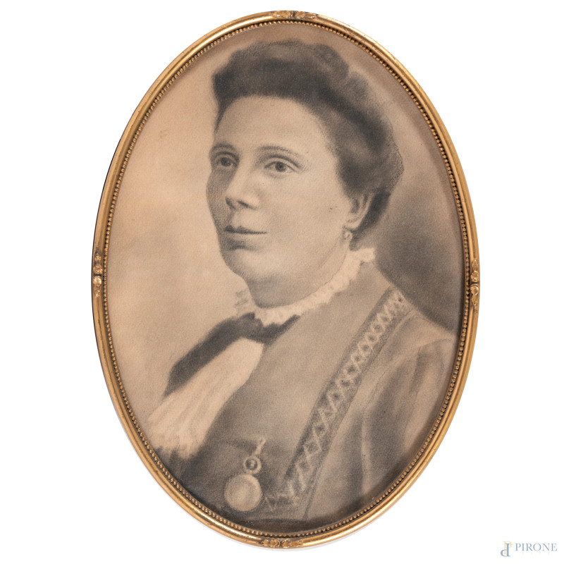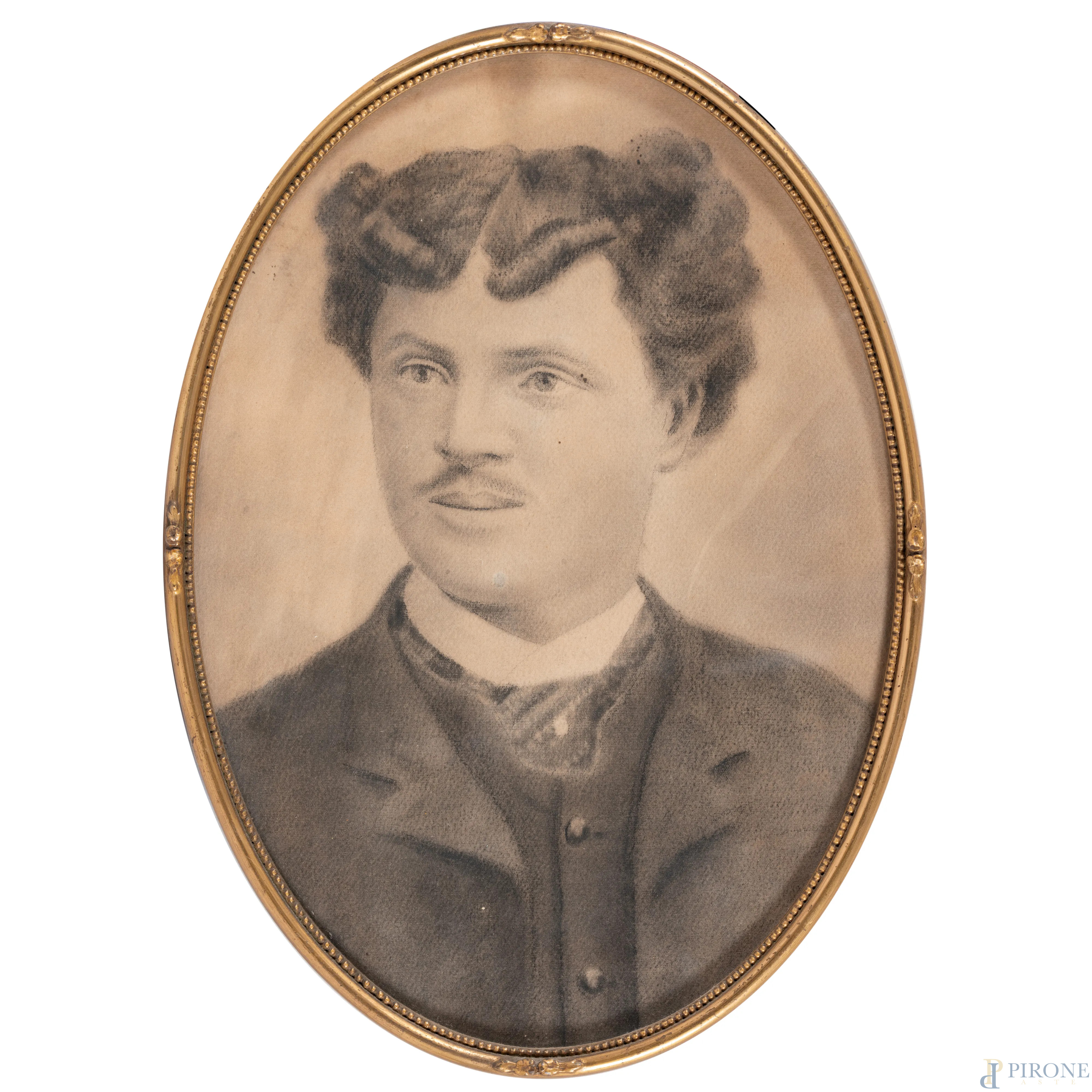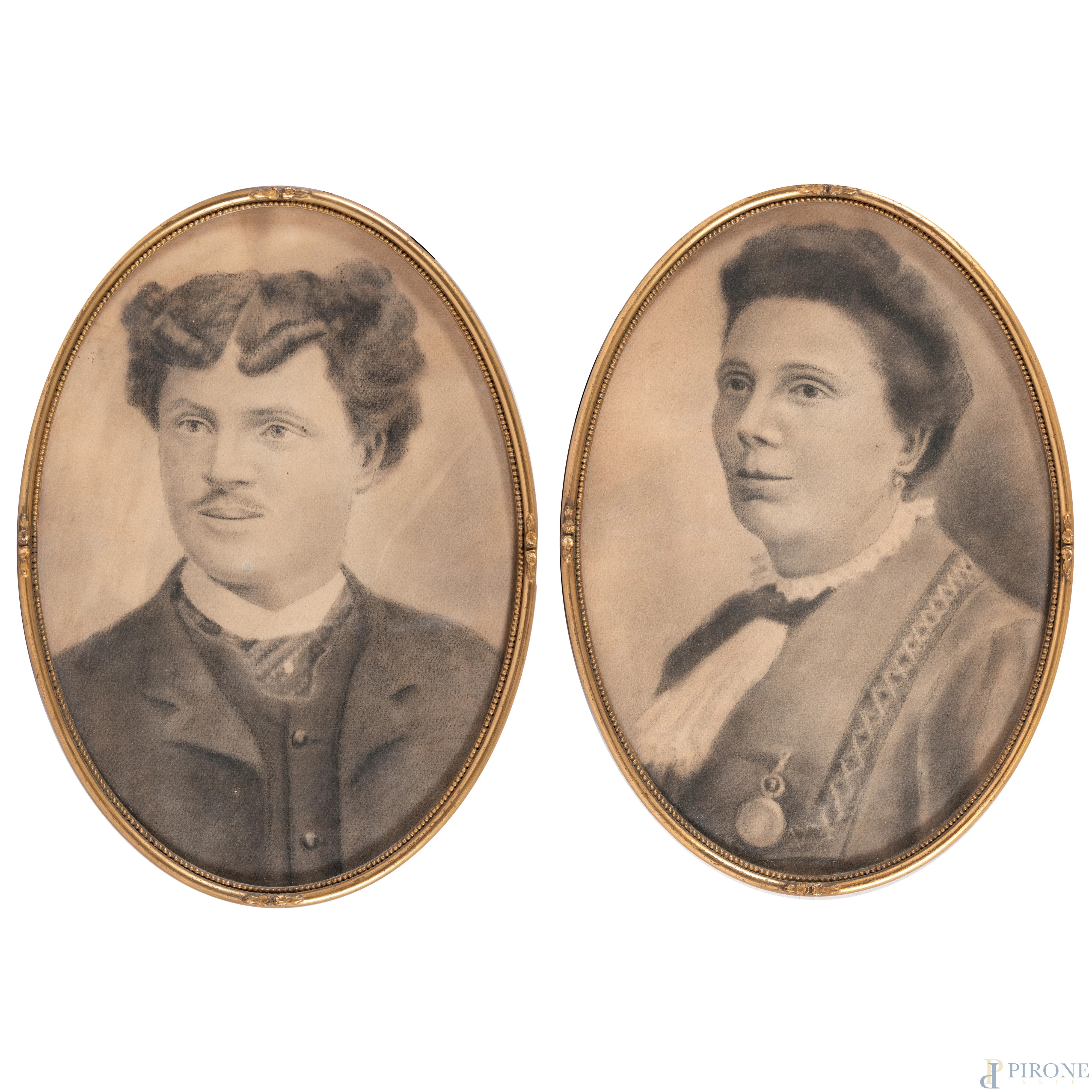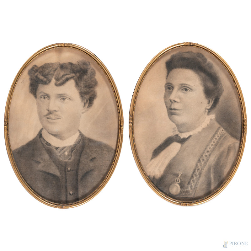 Coppia di ritratti, XX secolo, matita su carta a serto ovale, cm 34x24, entro cornice