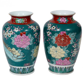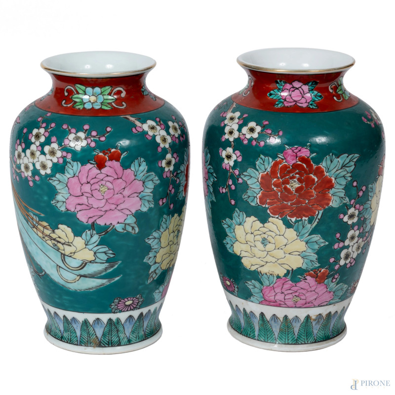 Coppia di vasi cinesi in porcellana con decoro policromi a pavoni tra rami fioriti. Cina, XX secolo, altezza cm 29,5, (lievi segni di usura del tempo)