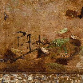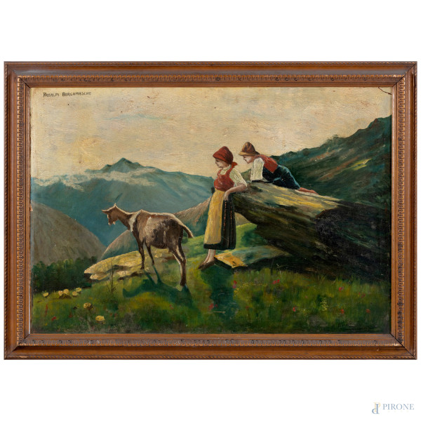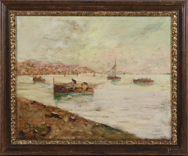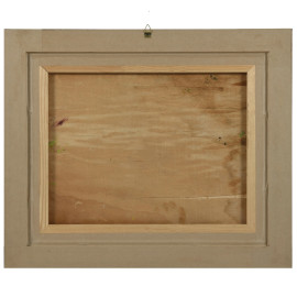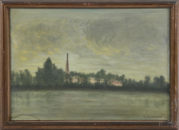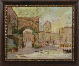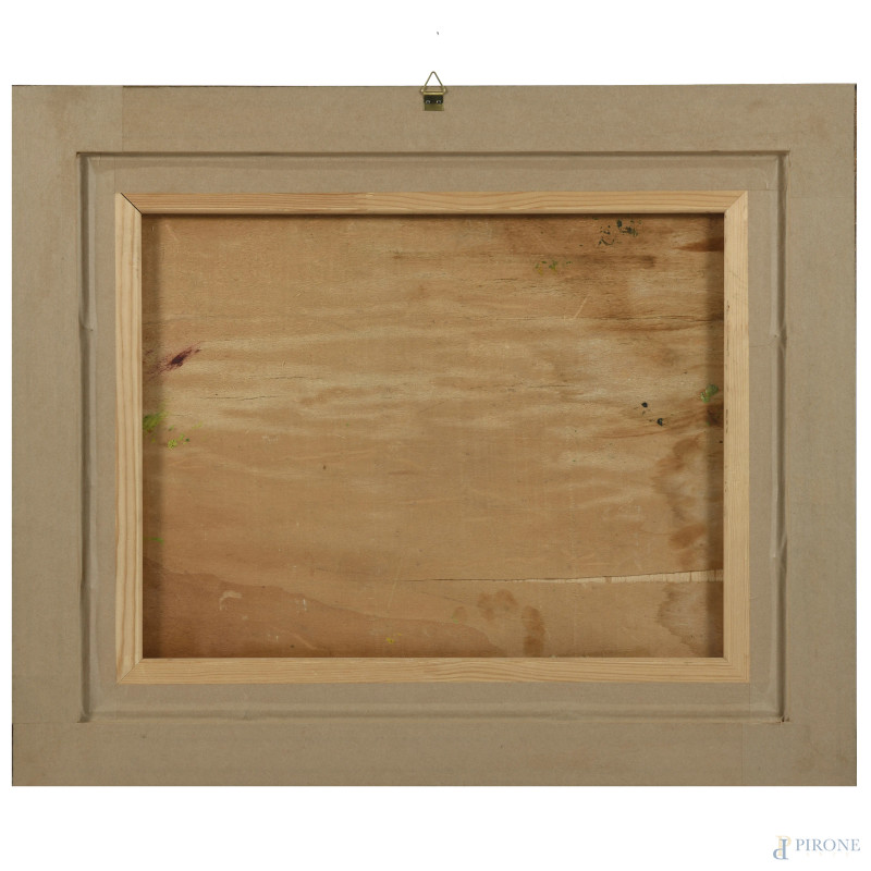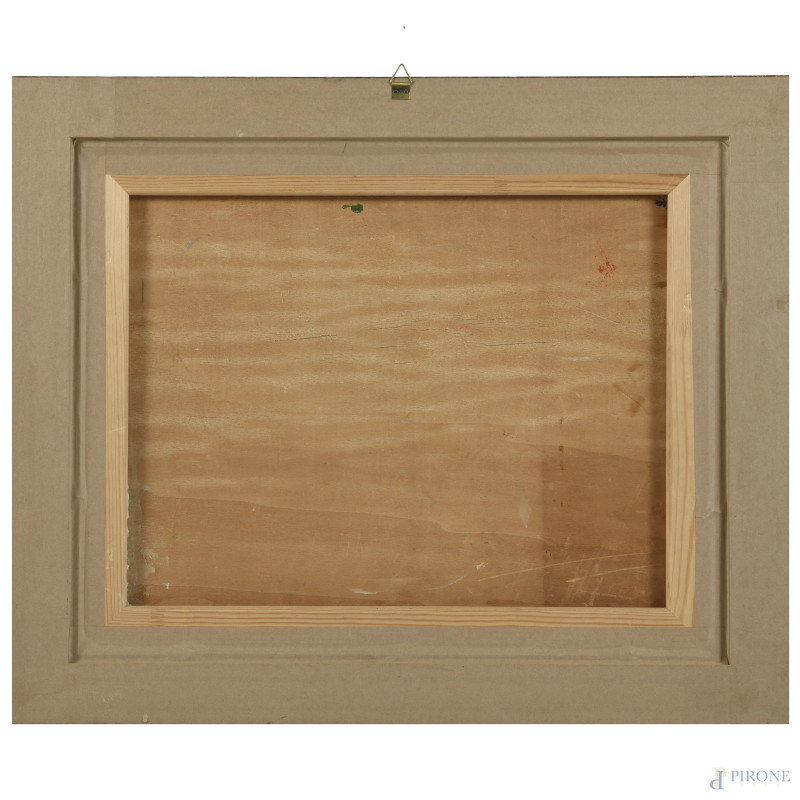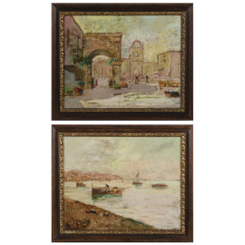 Coppia di vedute, XX secolo, olio su compensato, cm 32x42, entro cornice (supporti imbarcati, abrasioni)