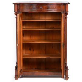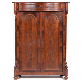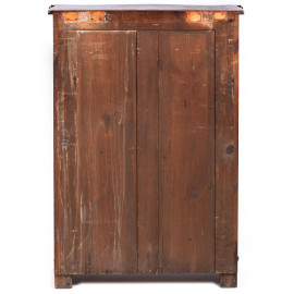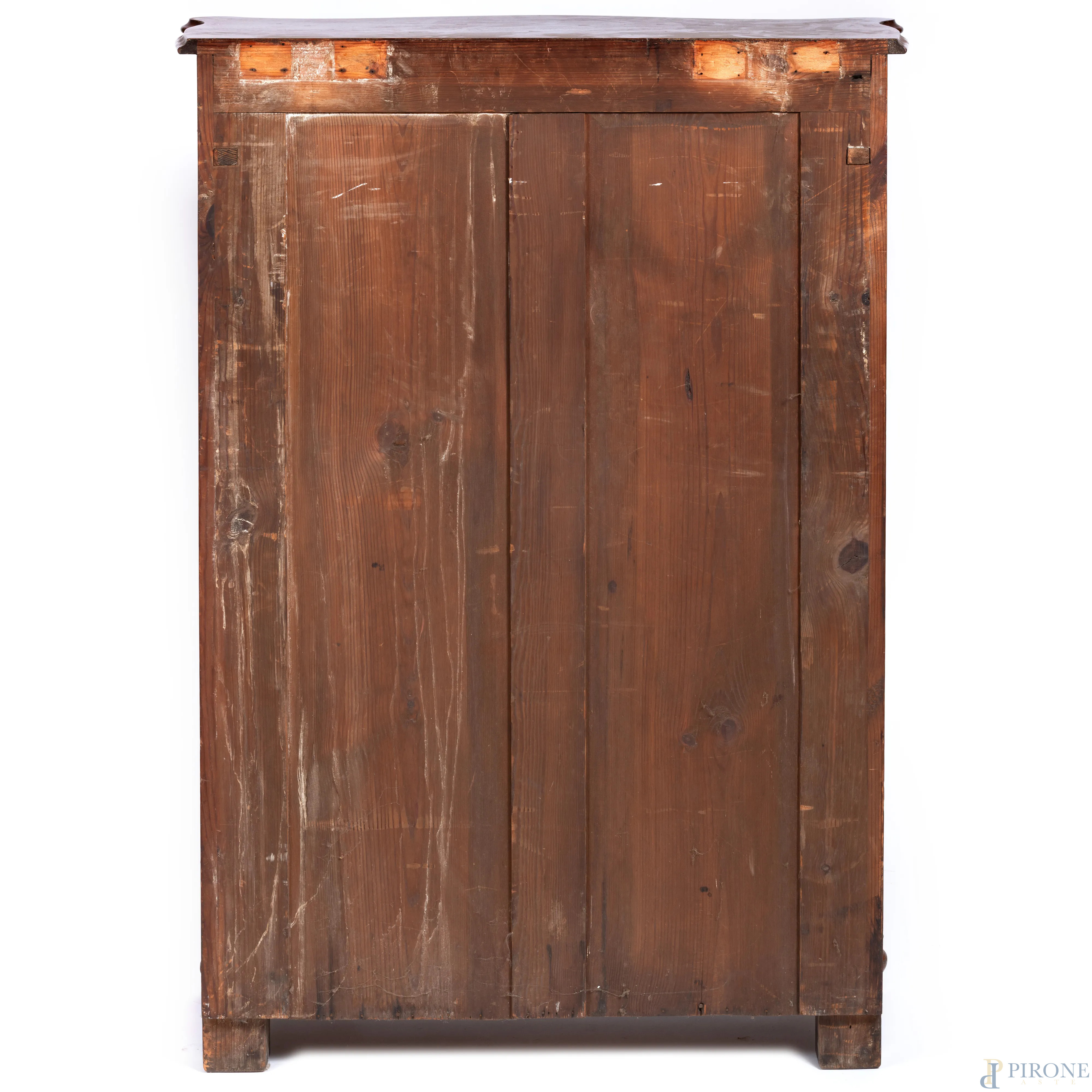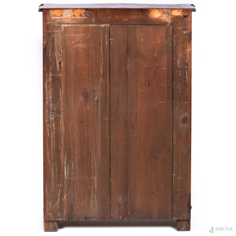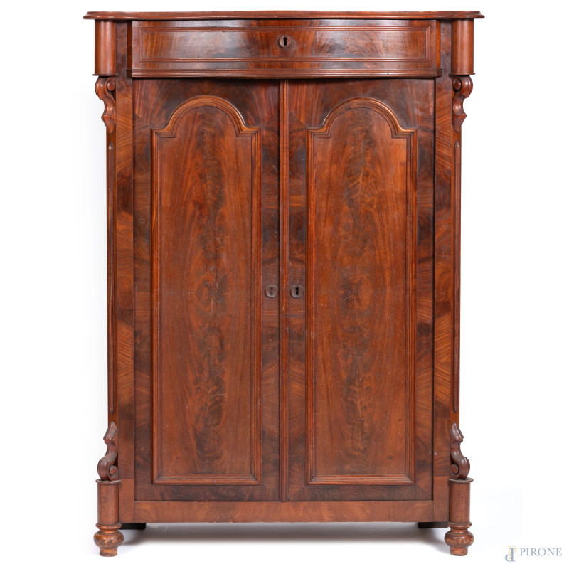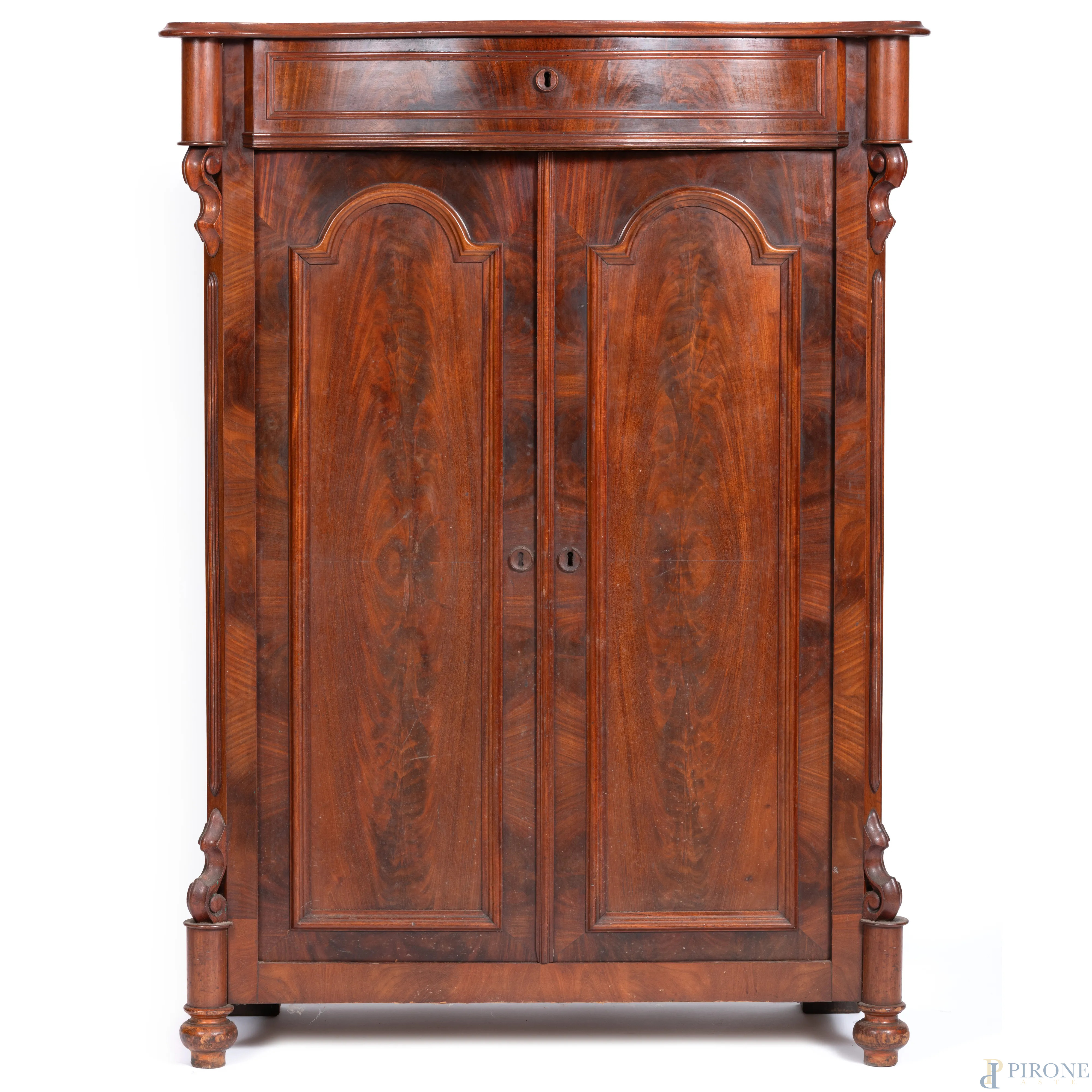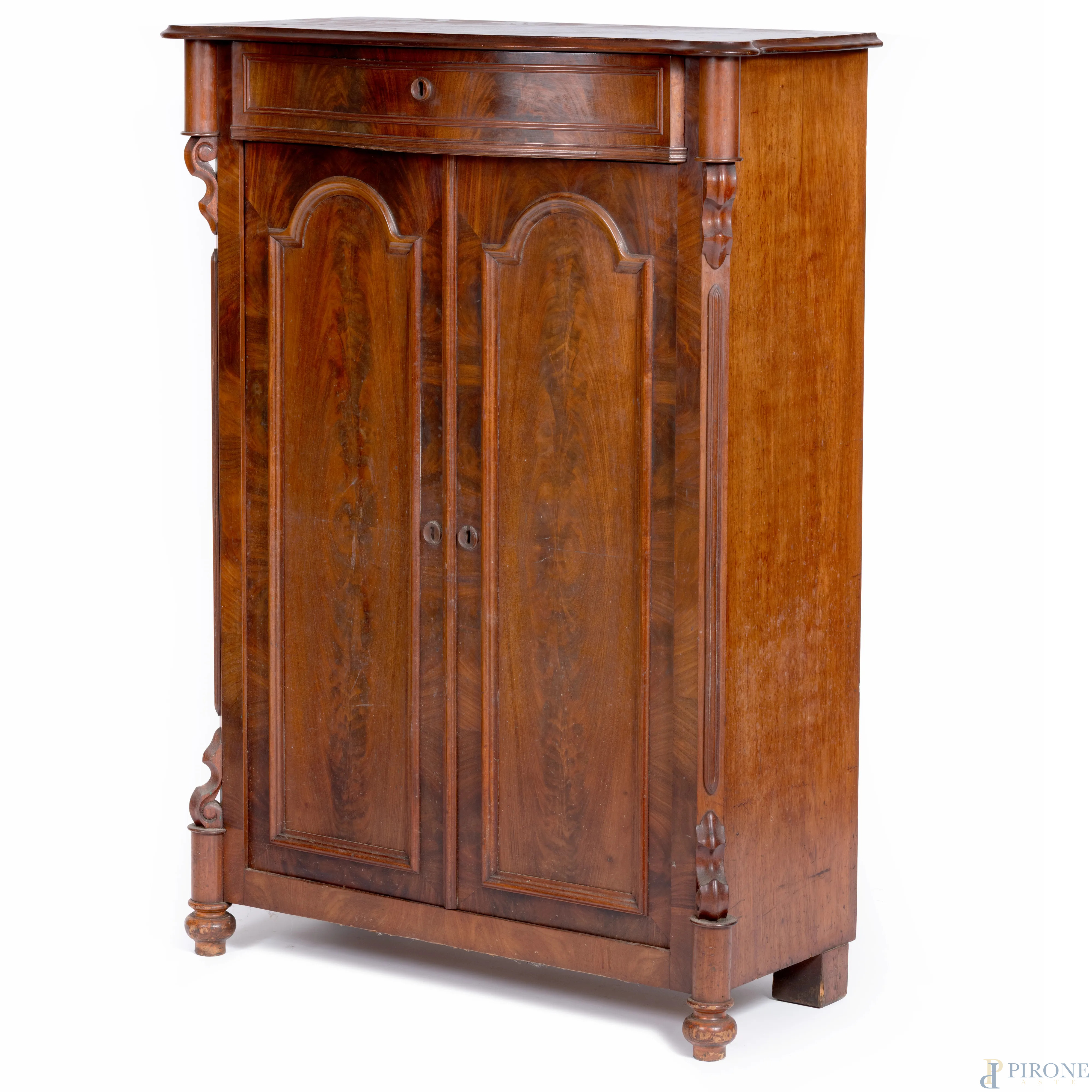 Credenza impiallacciata in piuma di mogano a doppia anta sormontata da cassetto dal fronte mosso, XIX-XX secolo, cm 134x98x42, (segni di usura, difetti, scalfiture)