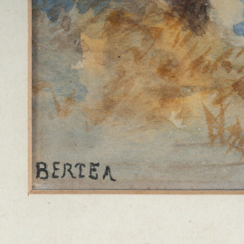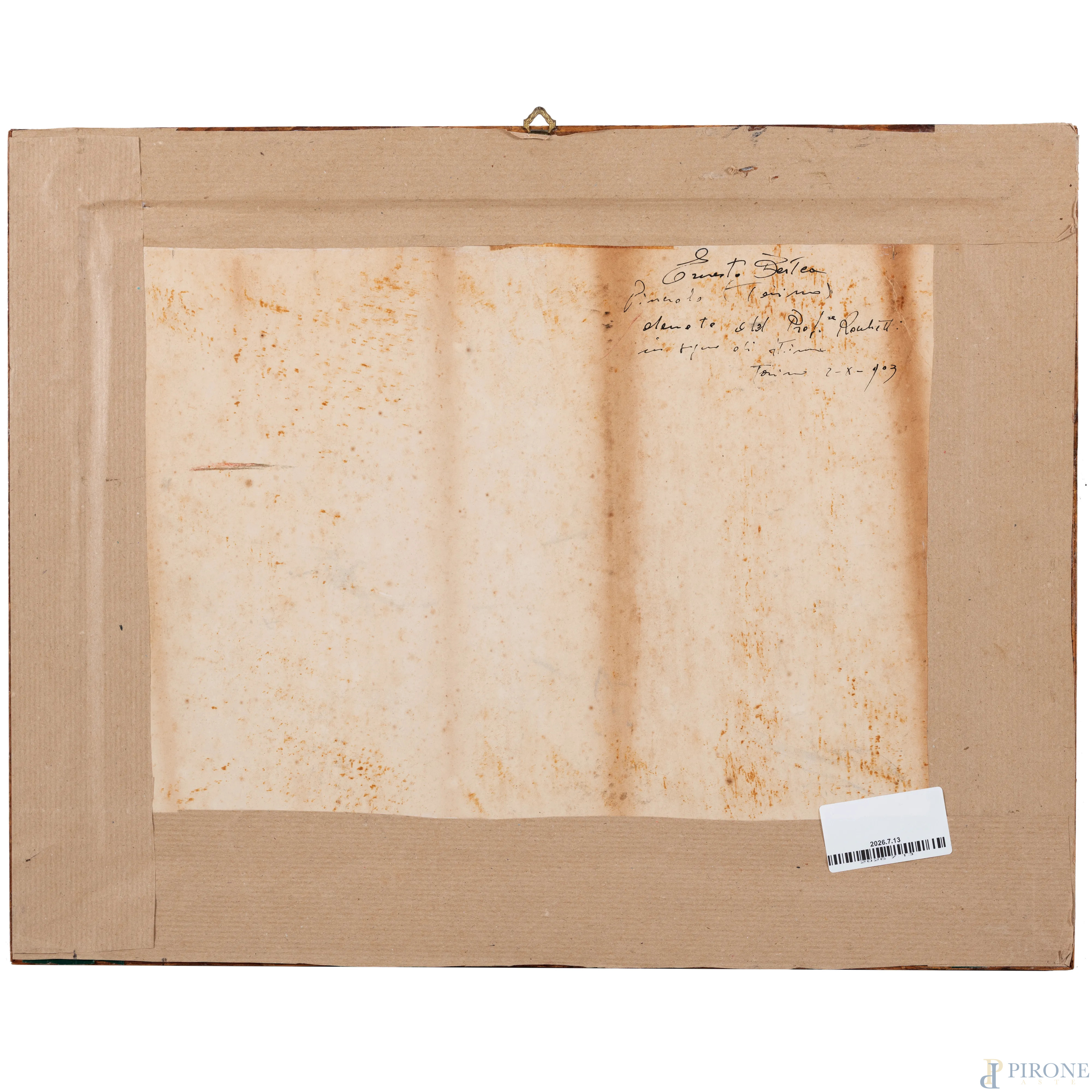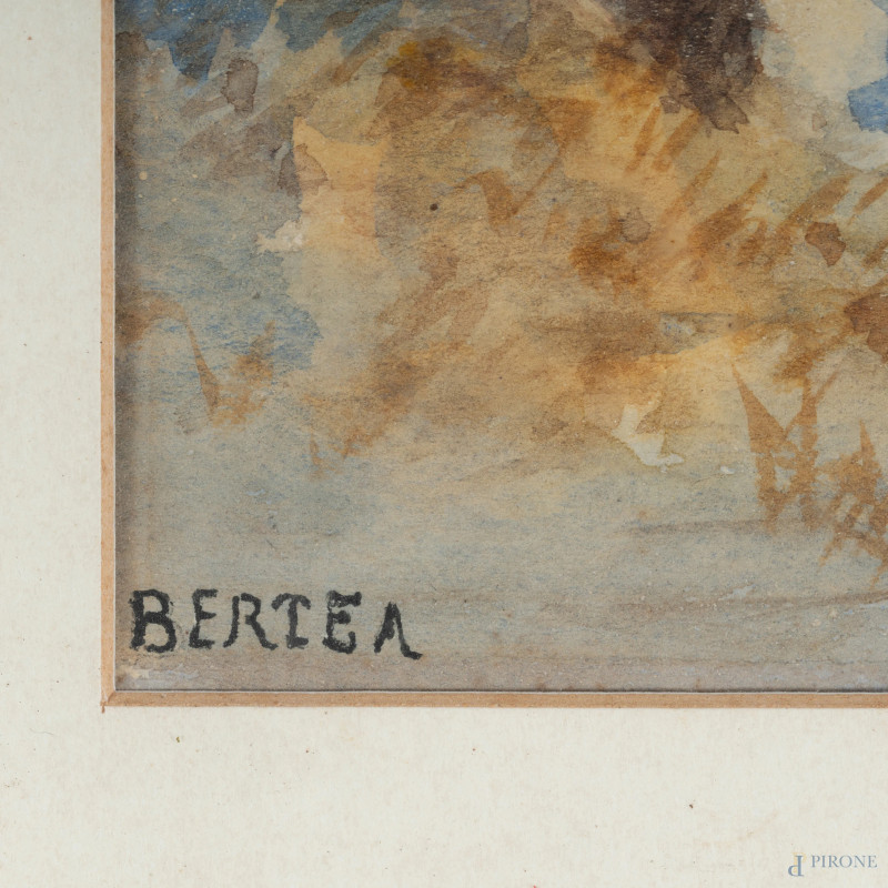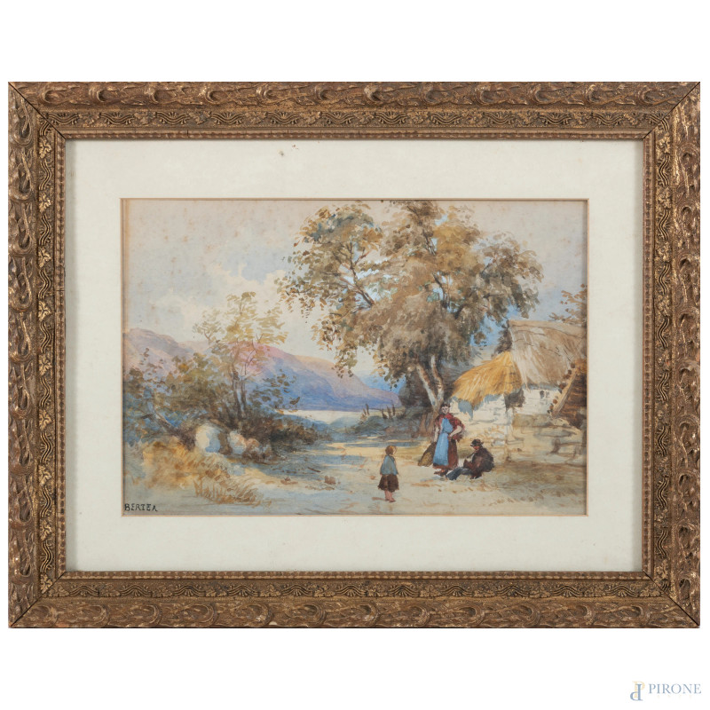Ernesto Bertea, Famiglia contadina,acquerello su carta, cm 31x41 compreso passepartout, firmato in basso a sinistra e firmato, dedicato e datato "Torino 2-X-903" al retro, entro cornice, (foxing, ondulazioni della carta)