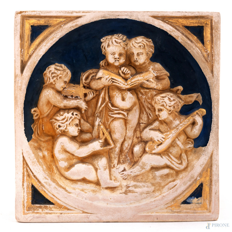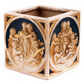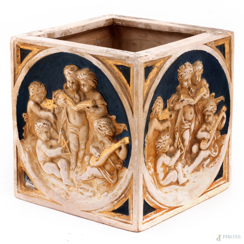 Fioriera quadrata in gesso con allegorie delle Arti a rilievo, XX secolo, cm 16,5x16x16, (segni di usura, scalfiture, difietti)