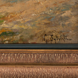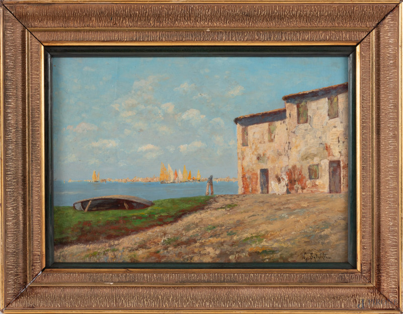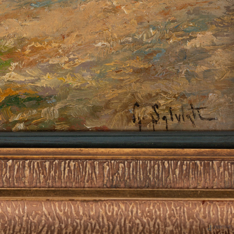 Giovanni Salviati (1881-1951), Scorcio di costa con casolare, XX secolo, olio su tavoletta, cm 22,5x32, firmato in basso a destra, entro cornice, (fessurazione del supporto)