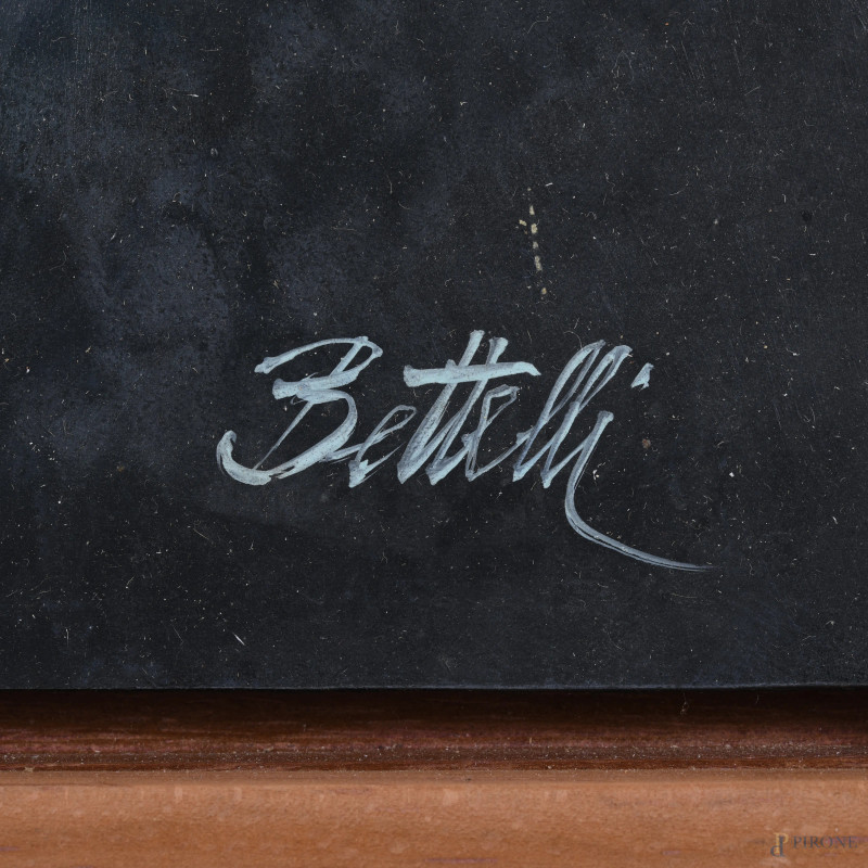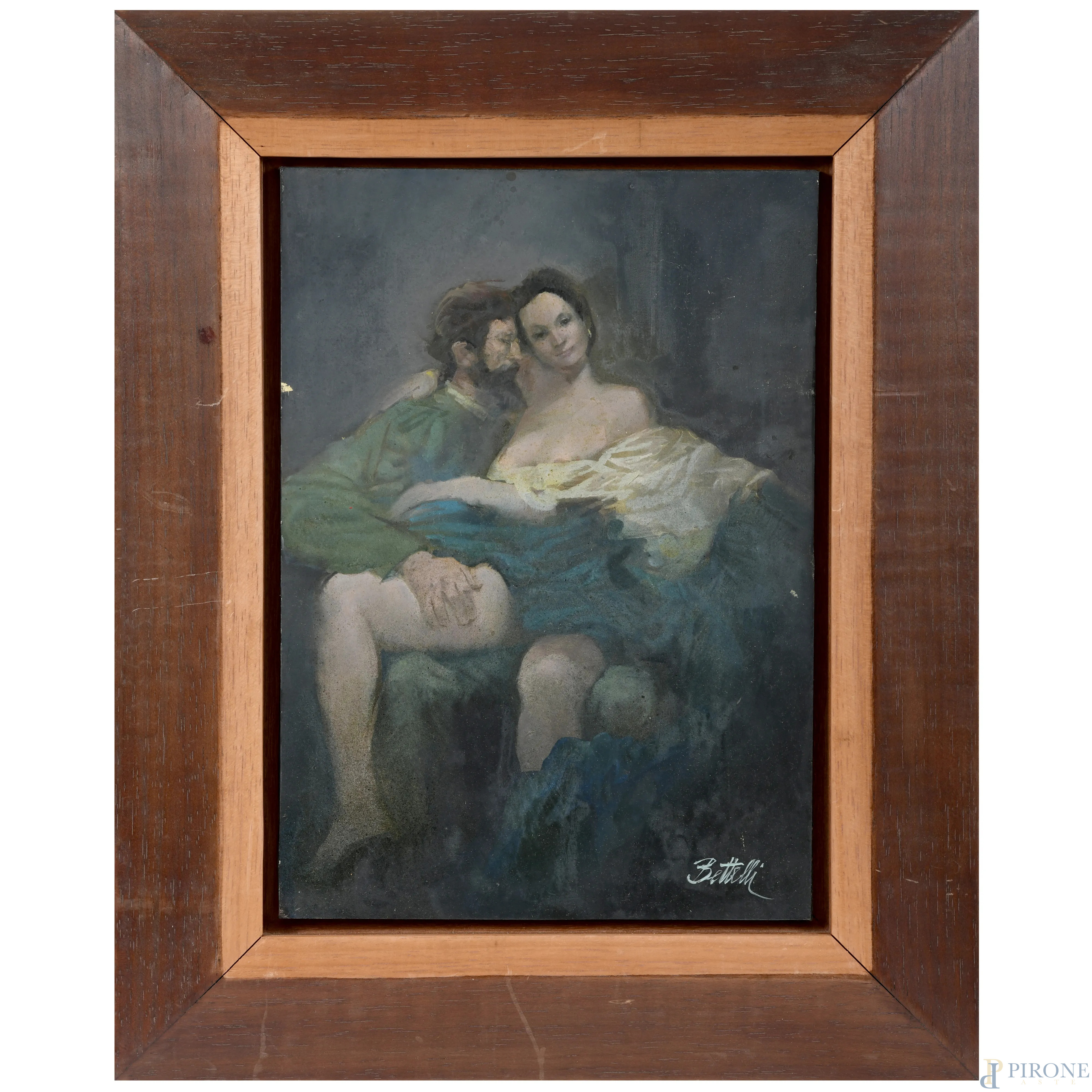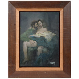 Gli amanti, XX secolo, olio su compensato, cm 35,5x25, firmato in basso a destra, entro cornice, (piccole abrasioni e cadute di colore)