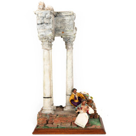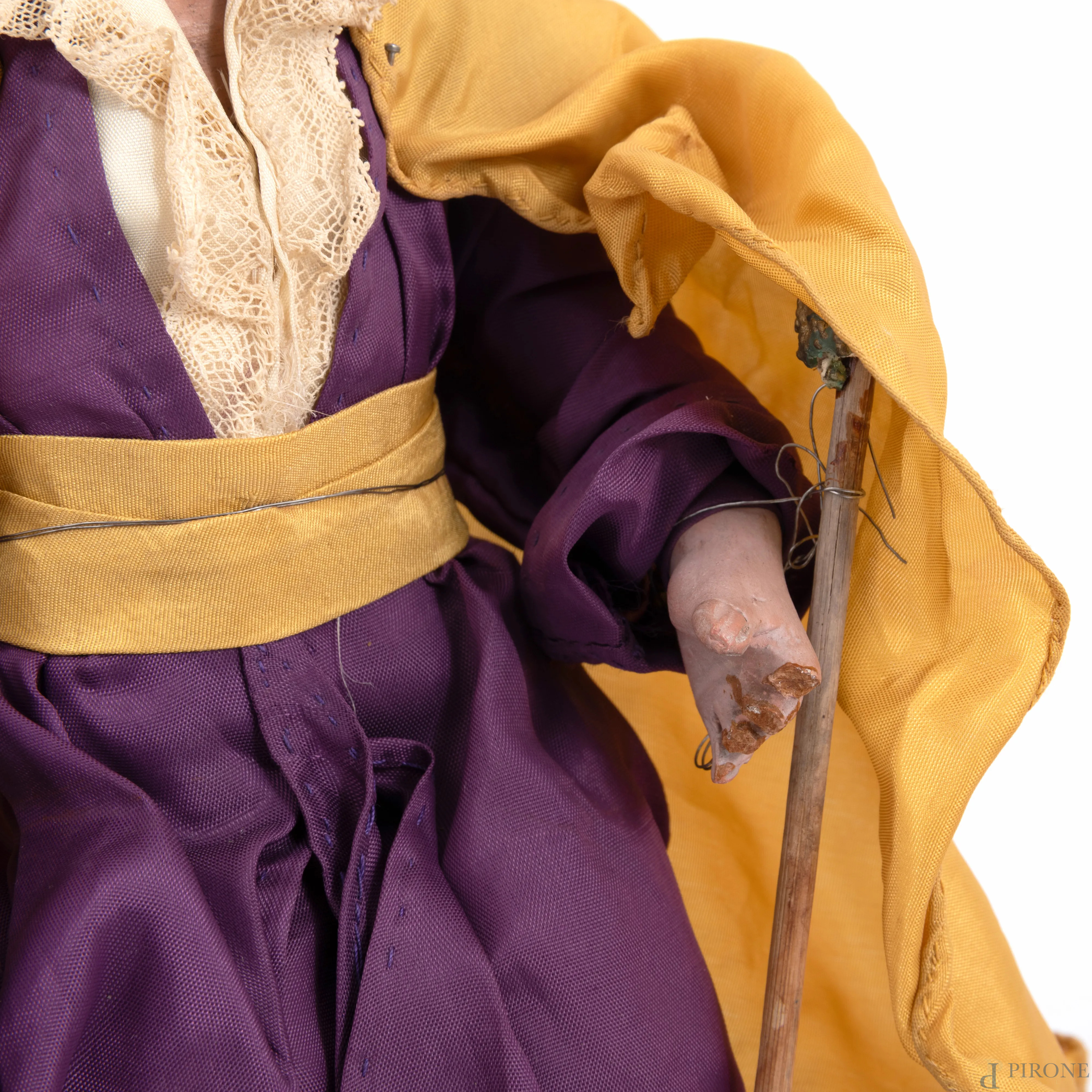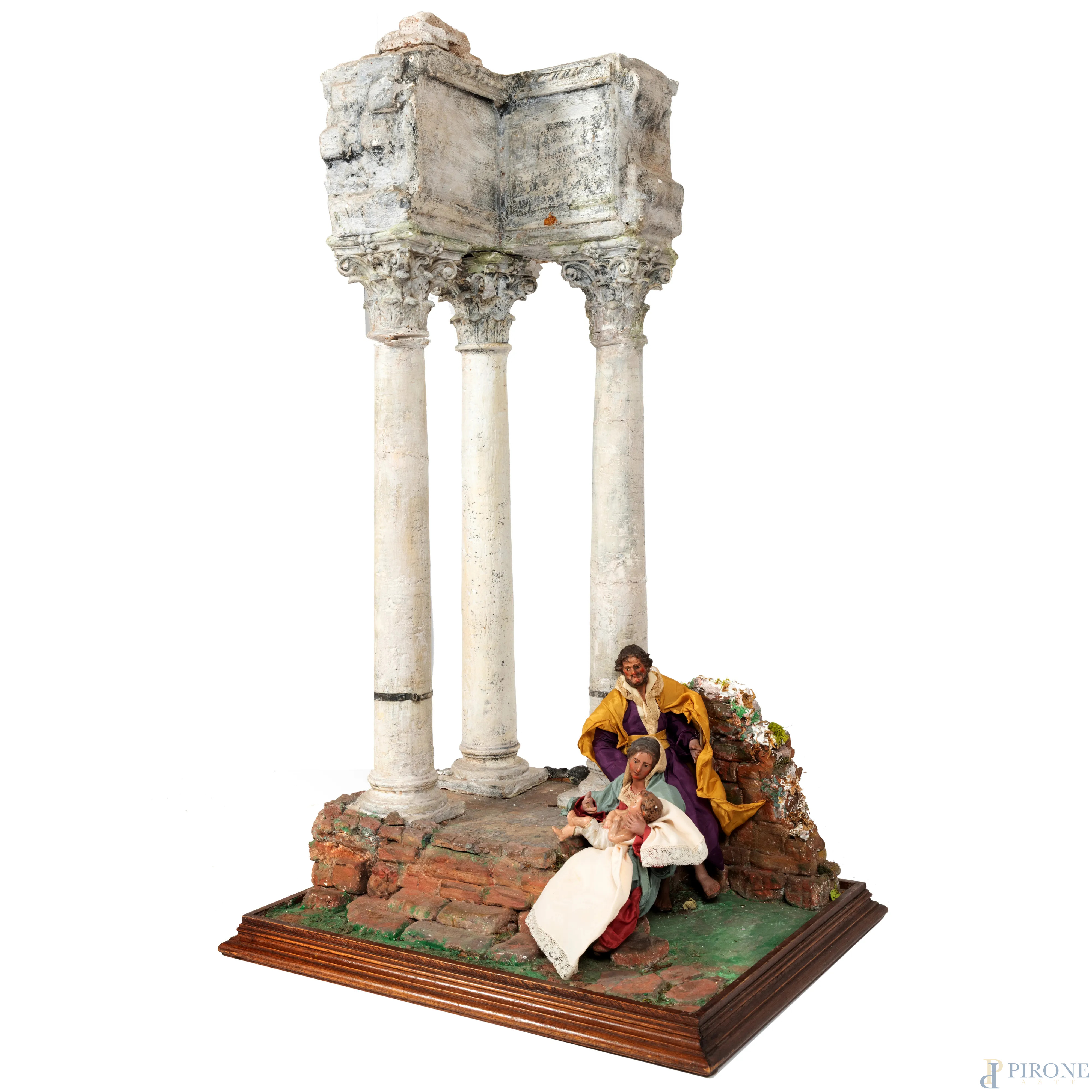 Gruppo da presepe in tessuto e terracotta con architettura in materiali diversi, XX secolo, altezza massima personaggi cm 31, misure struttura cm 108x60x50 (segni di usura, rotture, scalfiture, mancanze, restauri)