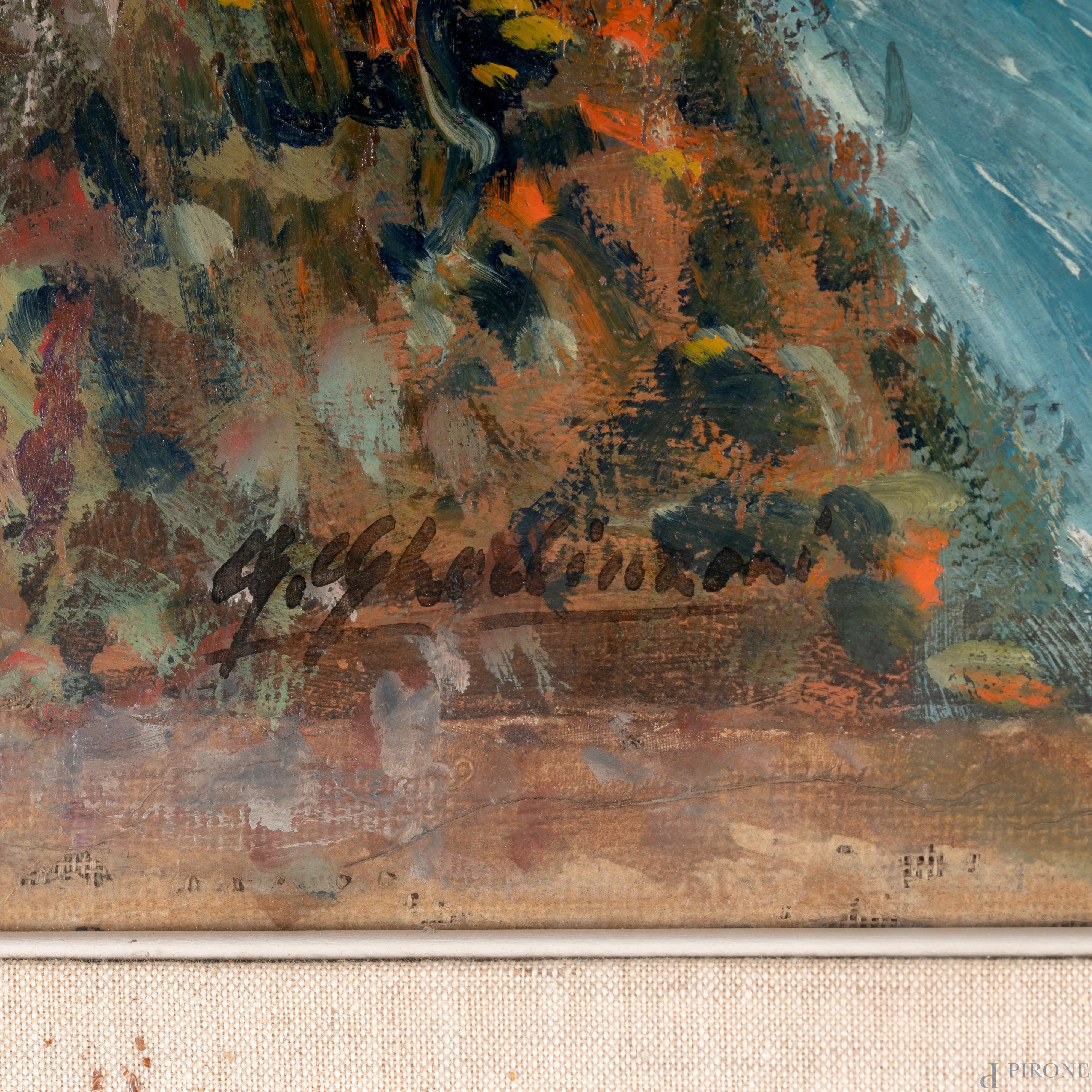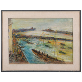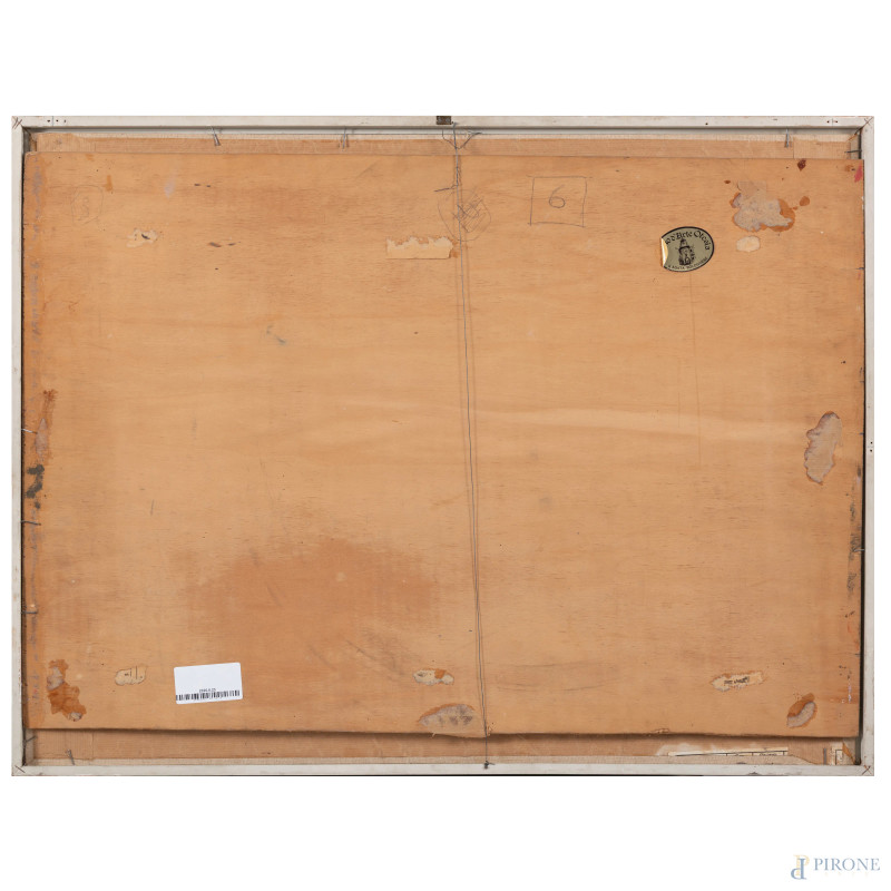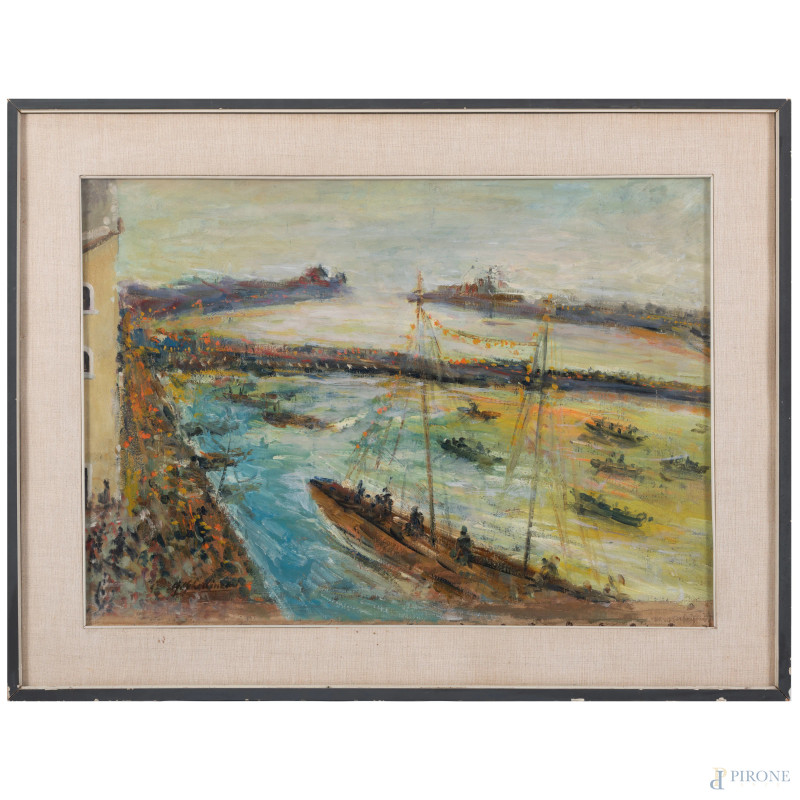 Guelfo Gherlinzoni (1906-1968), La regata, olio su tela applicata su compensato, cm 72,5x50, firmato in basso a sinistra, entro cornice
