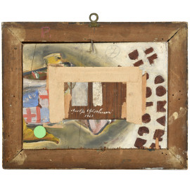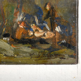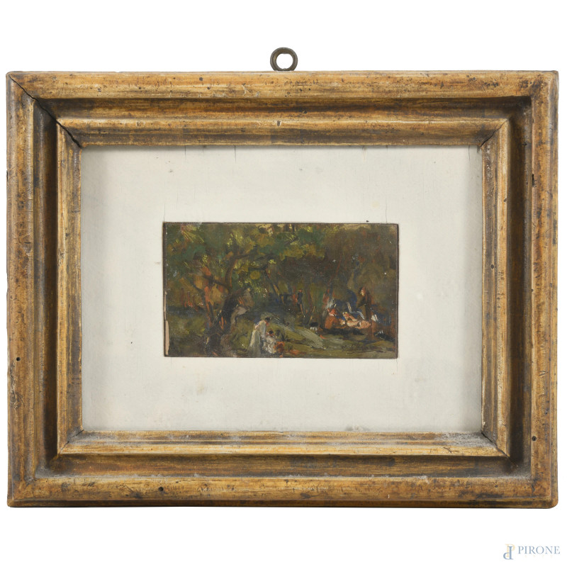 Guelfo Gherlinzoni (1906-1968), Paesaggio boschivo con figure, olio su tavoletta, cm 6x10, firmato e datato "1942" al retro, entro cornice