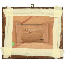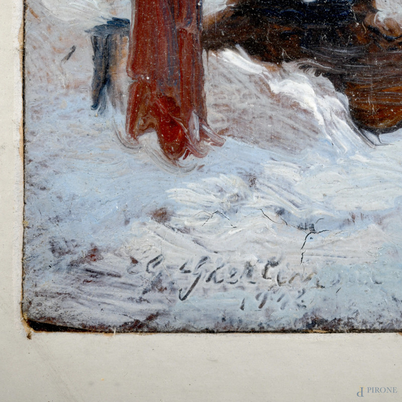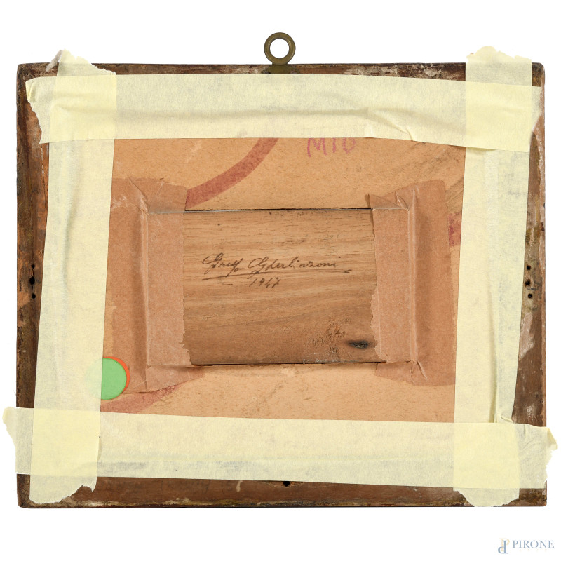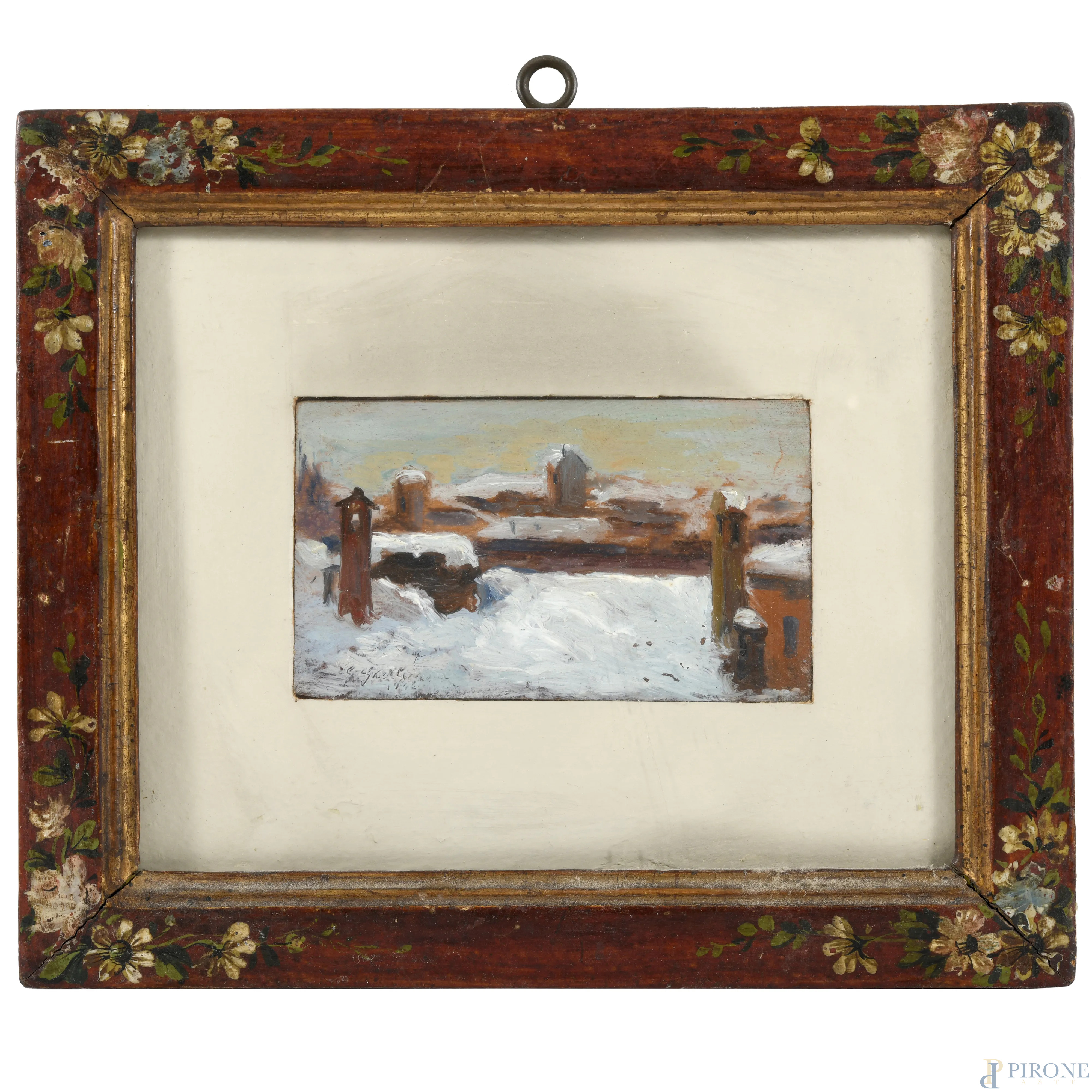 Guelfo Gherlinzoni (1906-1968), Paese innevato, olio su tavoletta, cm 6x10, firmato in basso a sinistra, firmato e datato al retro "1947", entro cornice