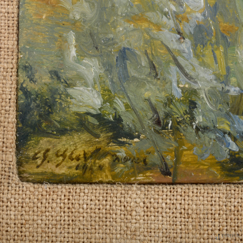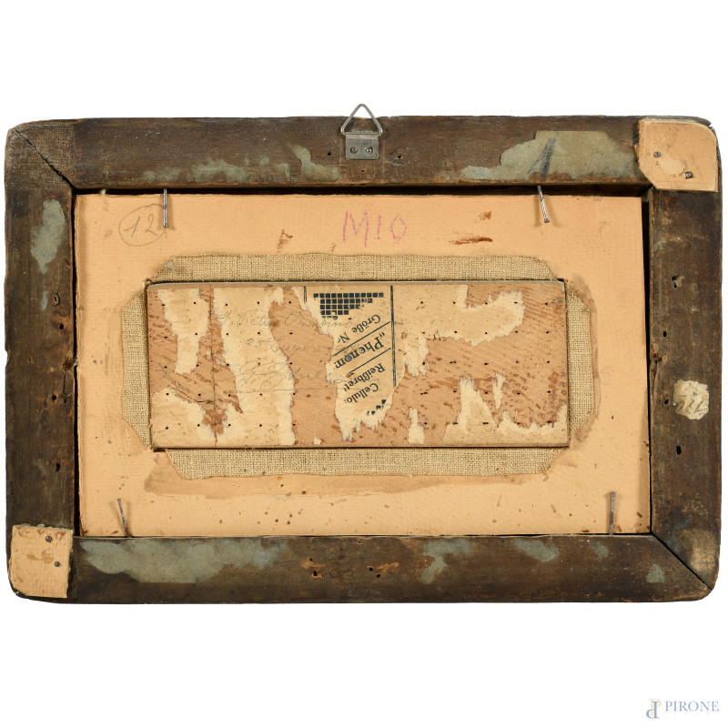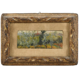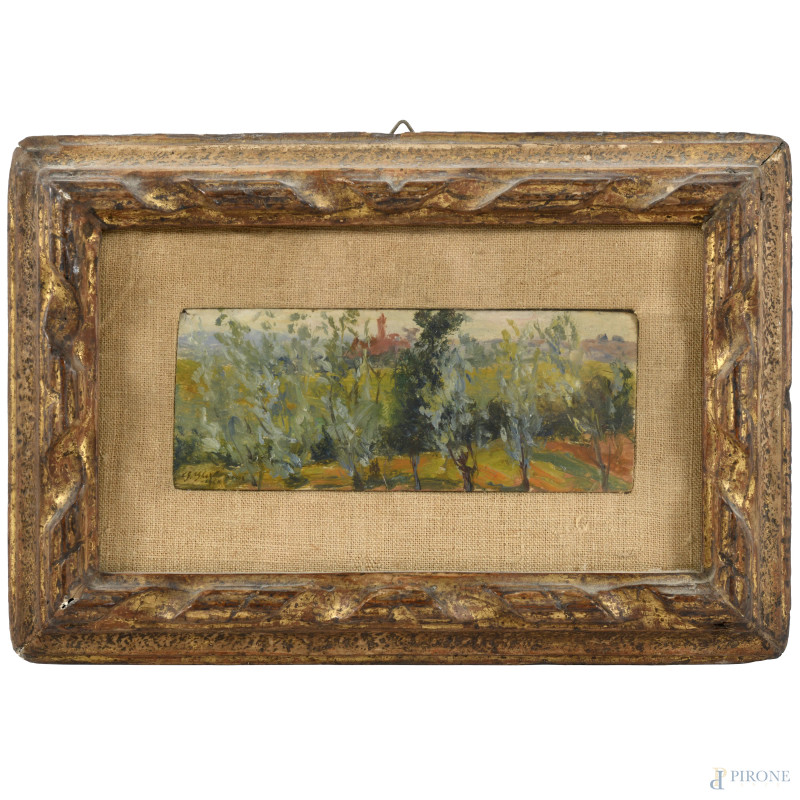 Guelfo Gherlinzoni (1906-1968), Scorcio campestre, olio su compensato, cm 6x16, firmato in basso a sinistra, entro cornice