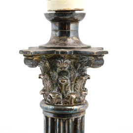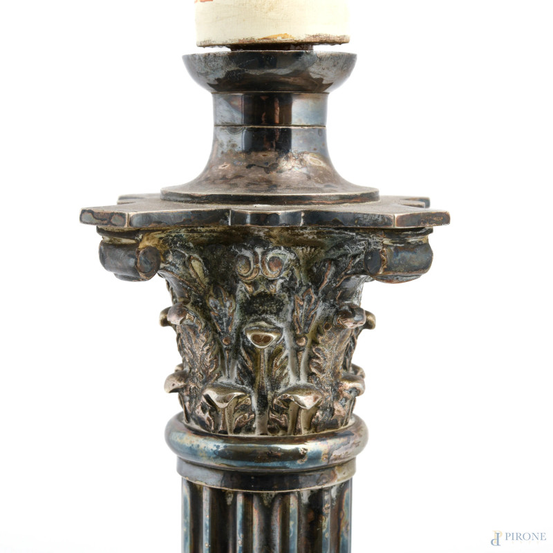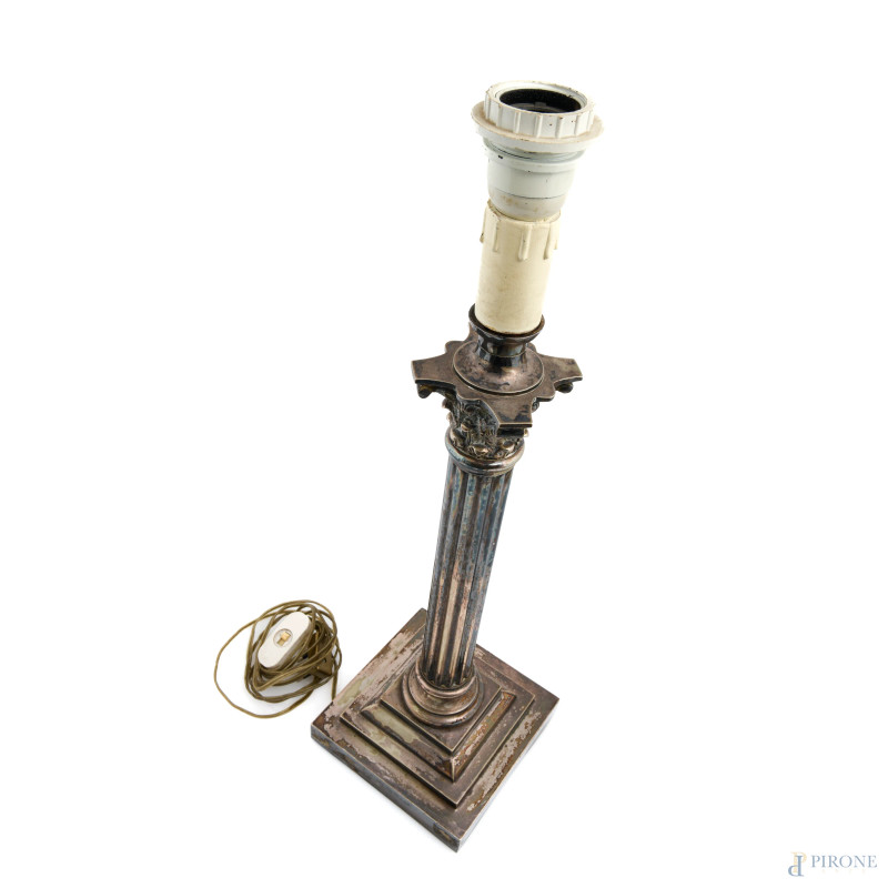 Lampada da tavolo con base in ferro e fusto a guisa di colonna in metallo argentato, XX secolo, altezza cm 42,5, (da revisionare, difetti, scalfiutre, graffi)