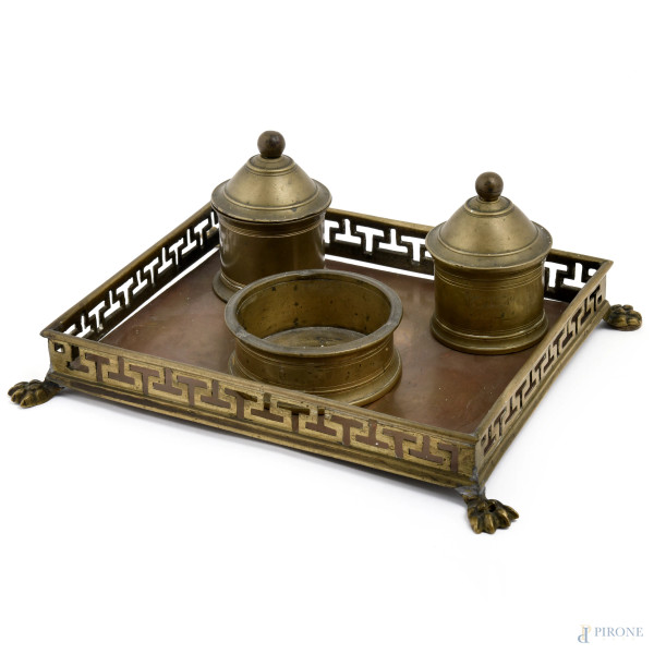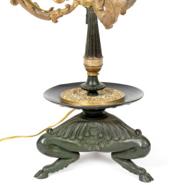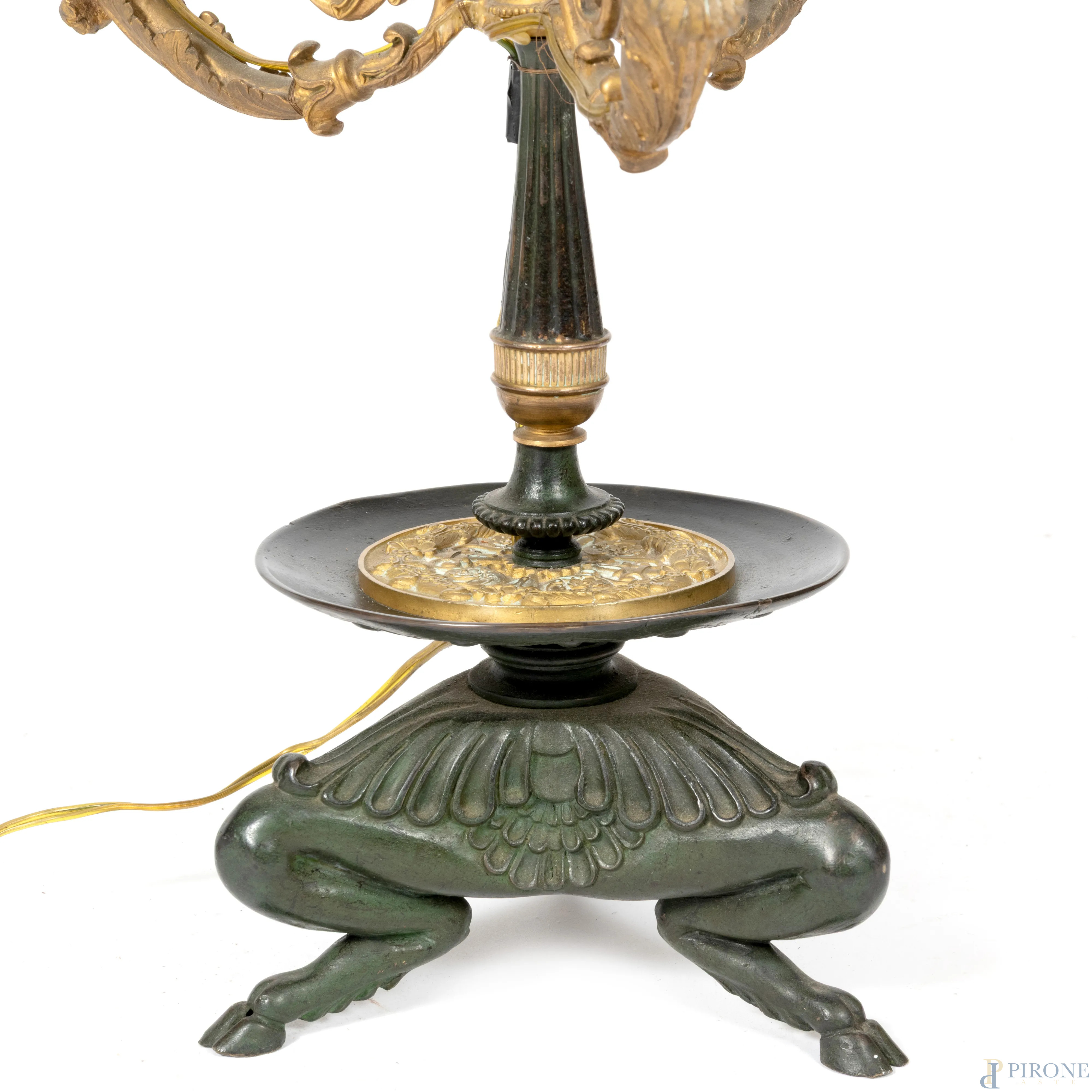 Lampada da tavolo Impero a tre luci con struttura in bronzo e bronzo dorato, poggiante su tre zampe di fauno, altezza cm 50, (segni di usura, da revisionare)