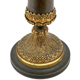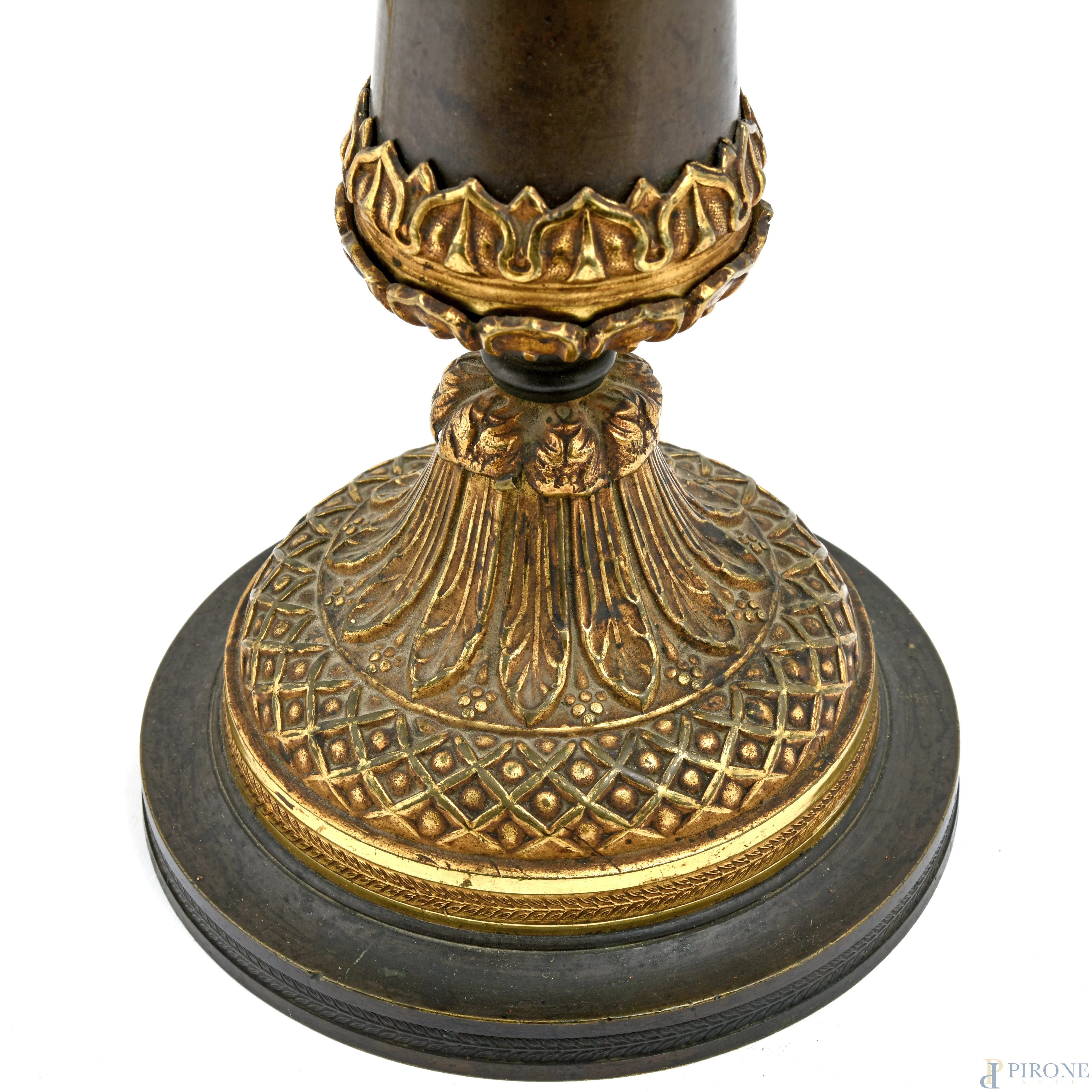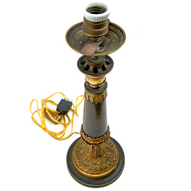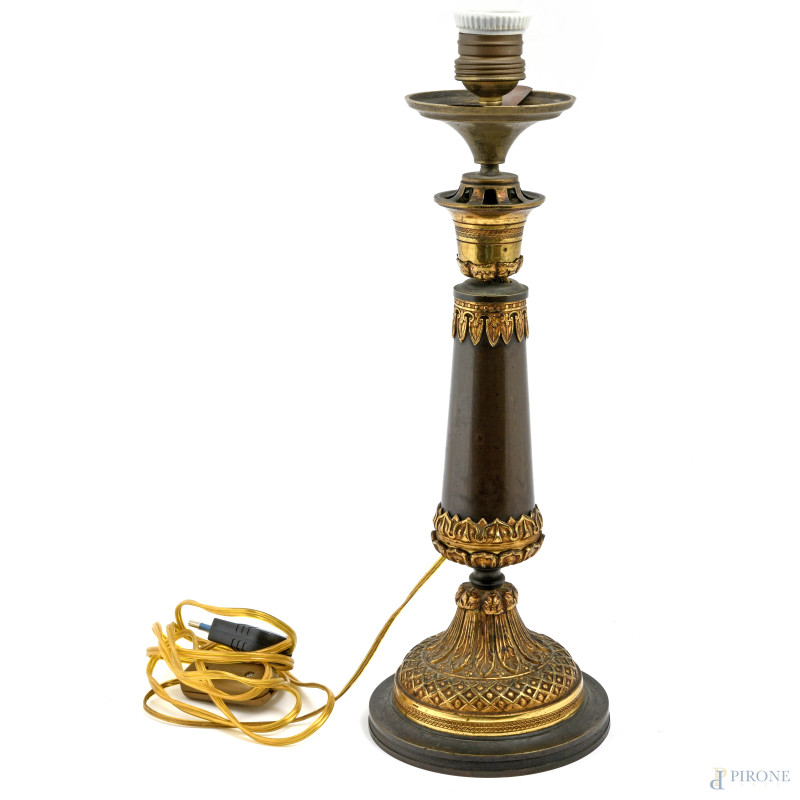 Lampada da tavolo in bronzo cesellato, patinato e dorato, XX secolo, altezza cm 40, (segni di usura, da revisionare)