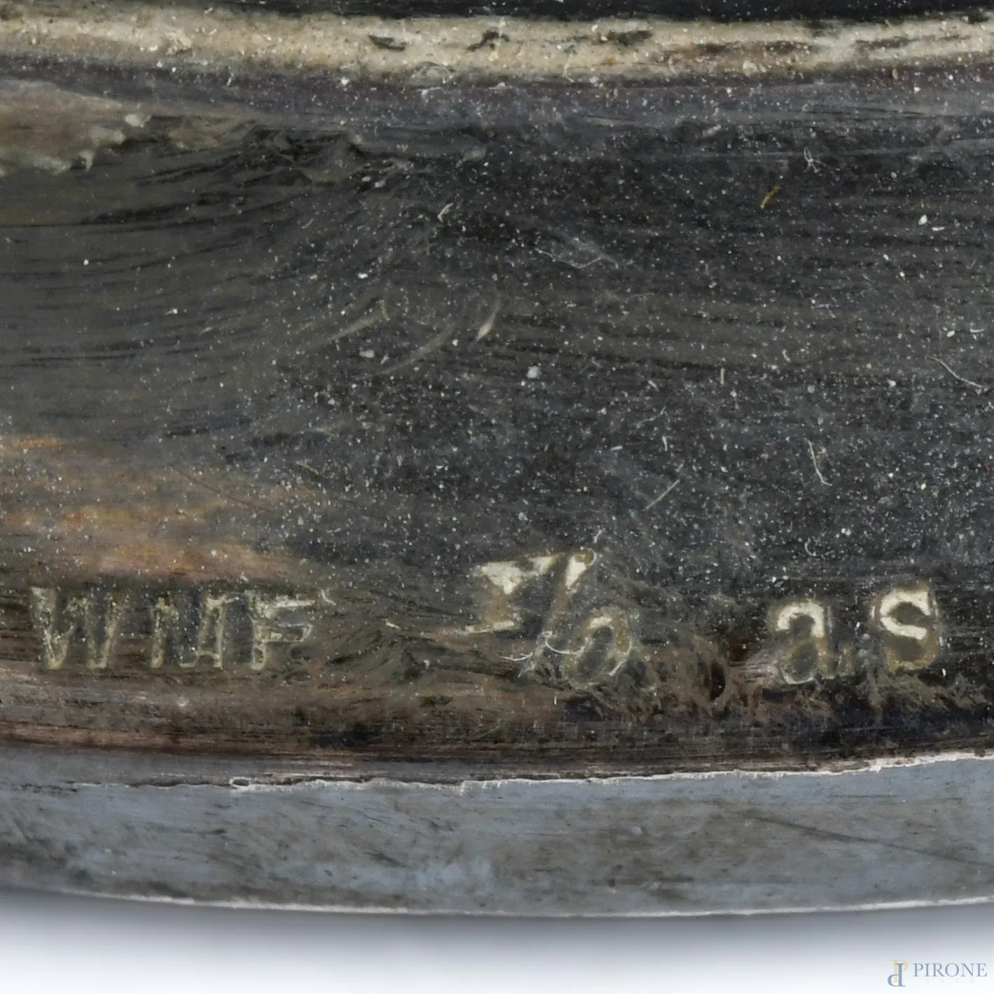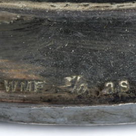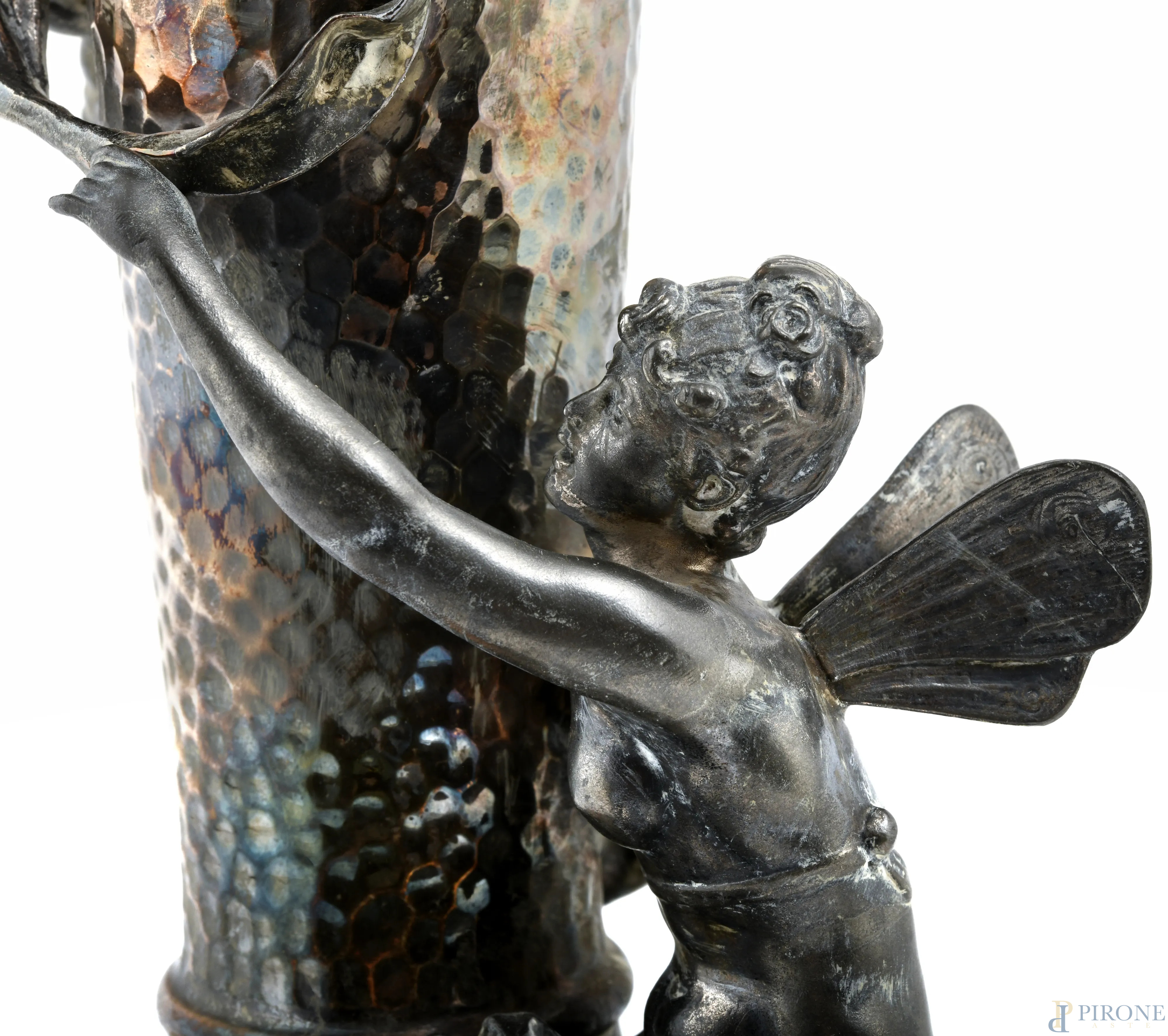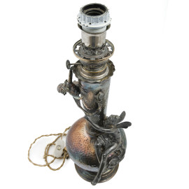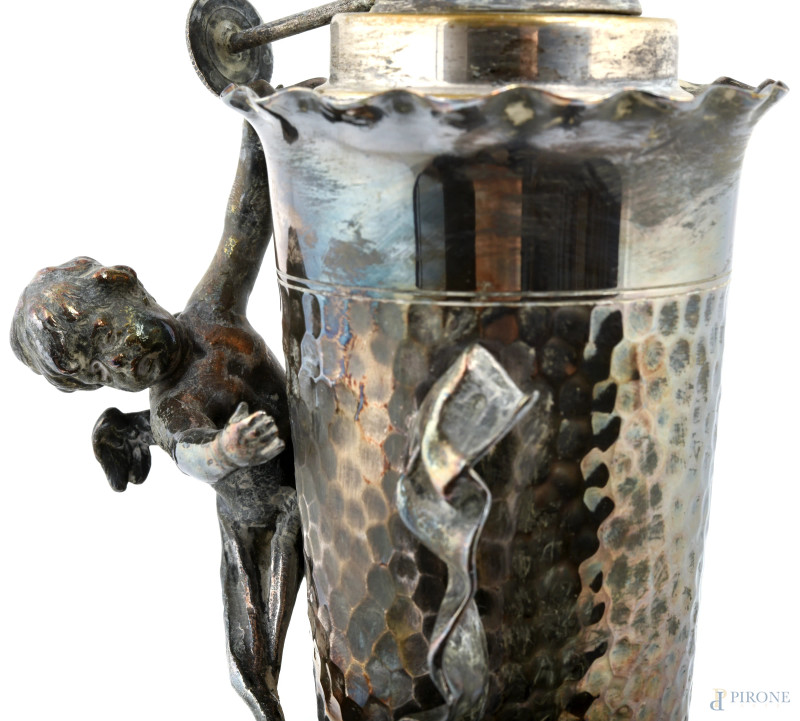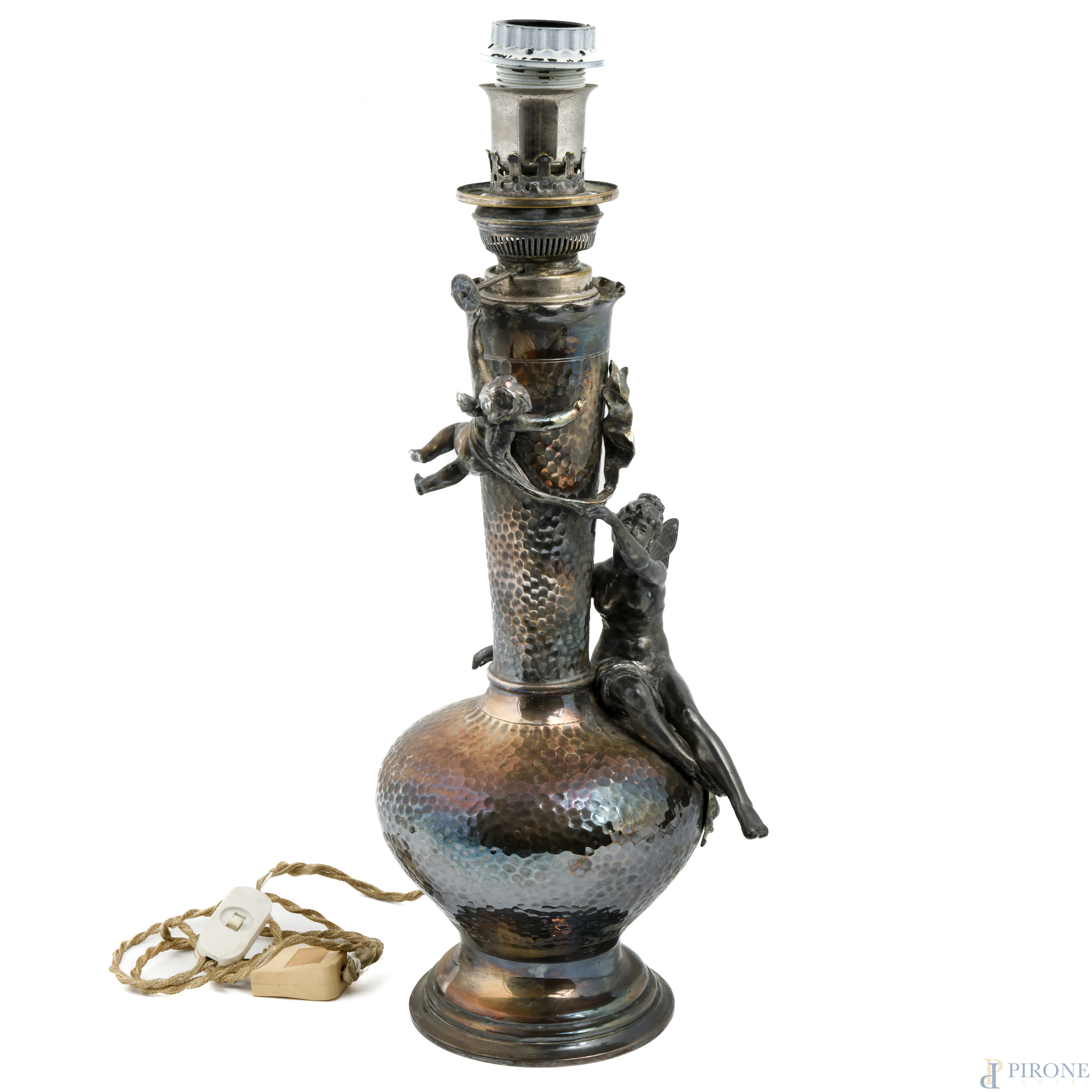 Lampada da tavolo WMF in stile Liberty con figura di ninfa e putto a rilievo, XX secolo, altezza cm 48, (segni di ossidazione, usura, difetti)