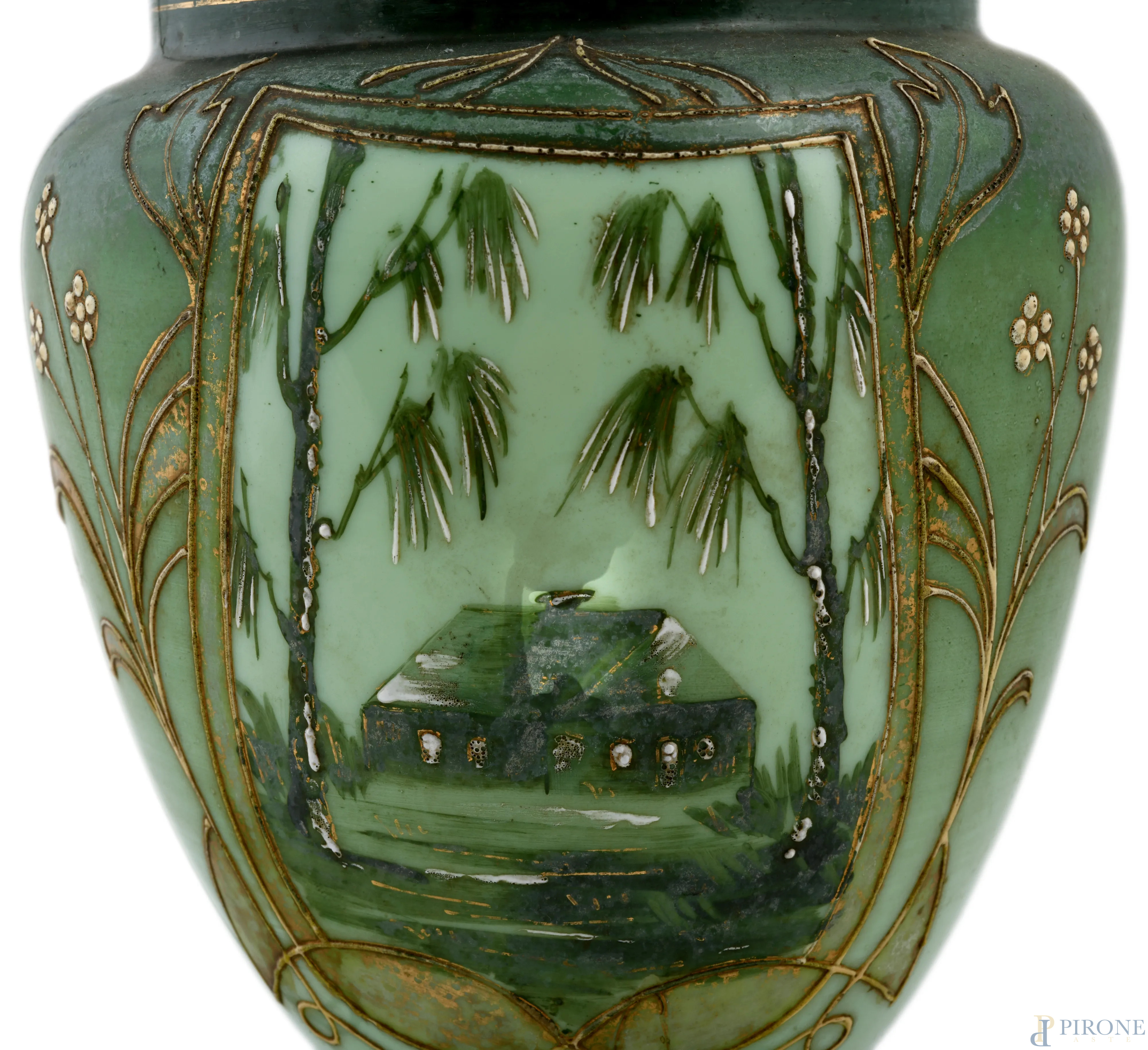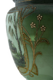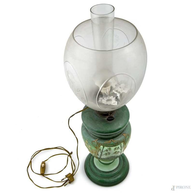 Lampada opalina nei toni del verde, XX secolo, altezza cm 60, (segni di usura, scoloriture, da revisionare)