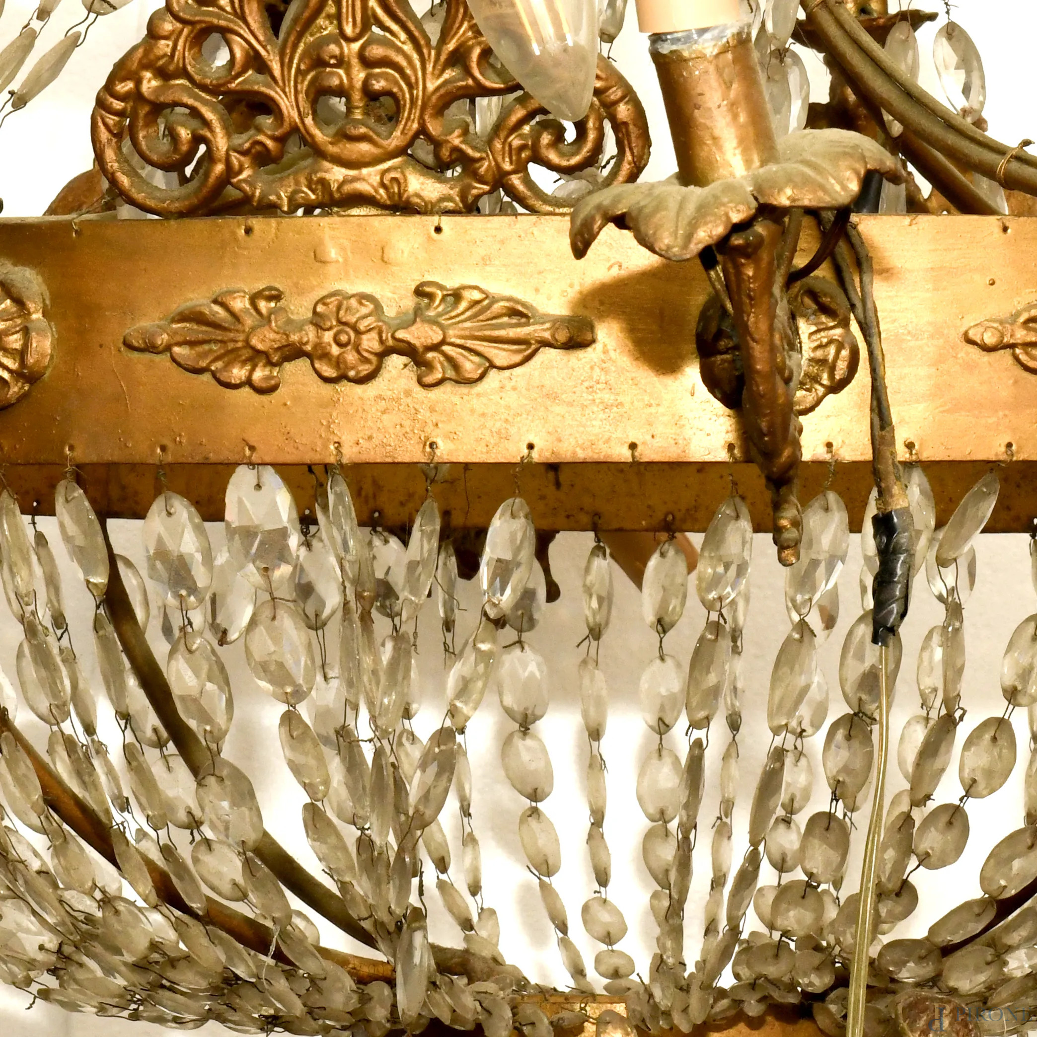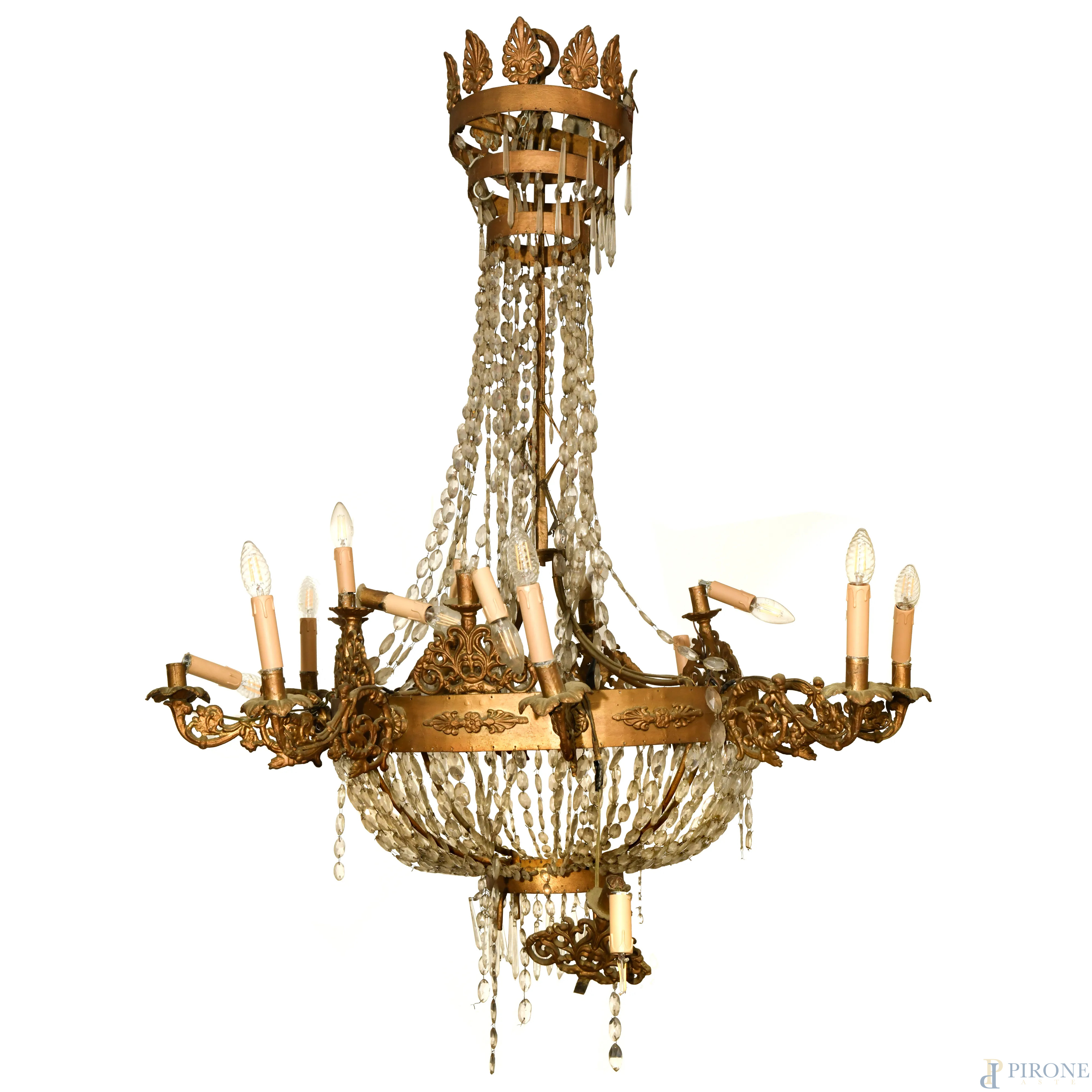 Lampadario a 16 luci in bronzo dorato e cesellato ed elementi e gocce di vetro, XX secolo, cm , (difetti, mancanze, rotture, da revisionare)