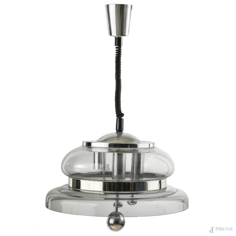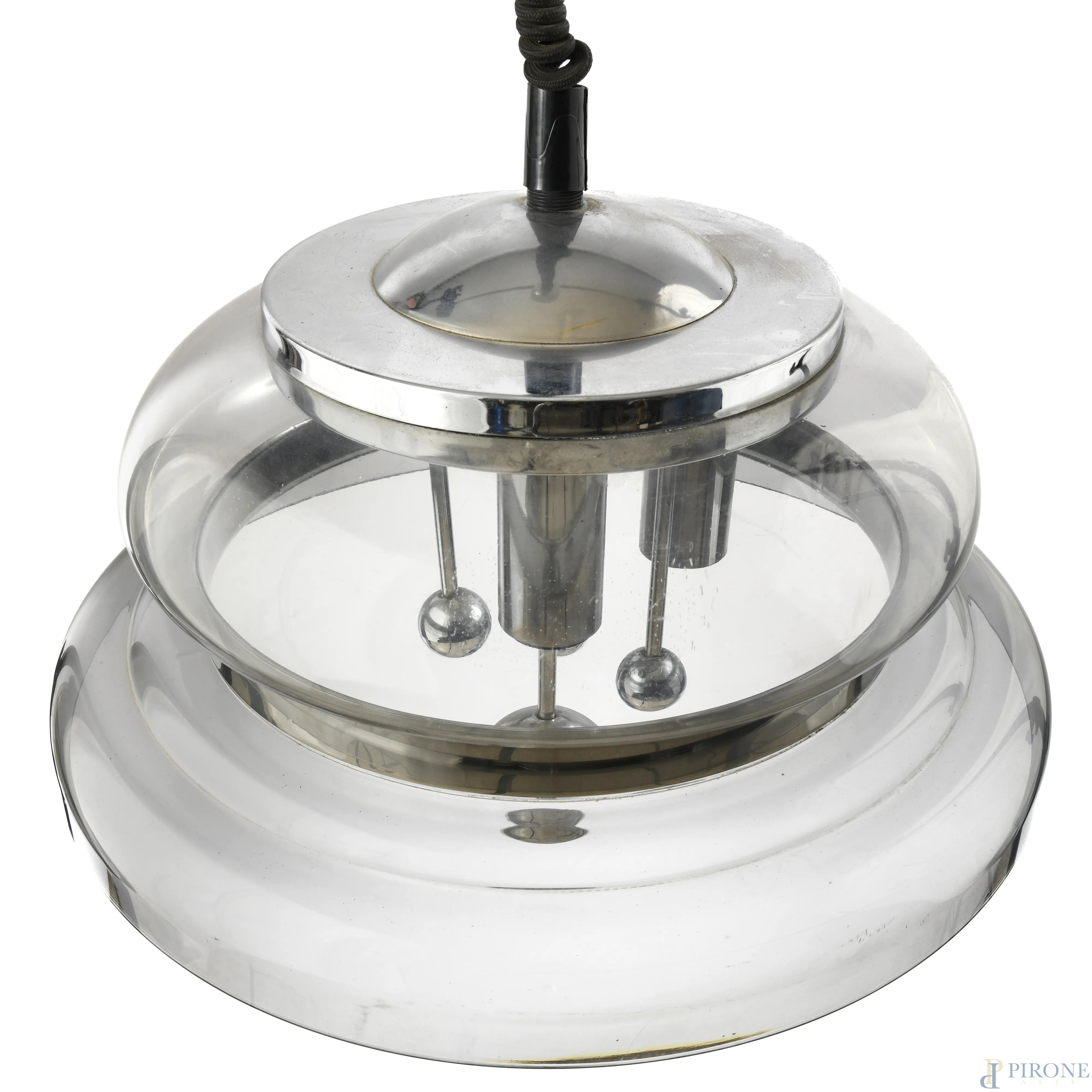 Lampadario con struttura in metallo cromato e plexiglass fumè, XX secolo, diametro diffusore cm 49, (segni di usura, graffi, da revisionare)