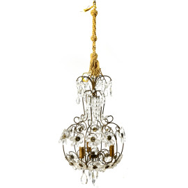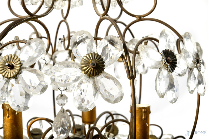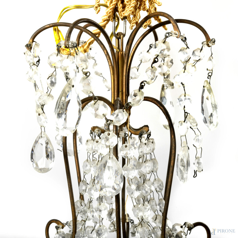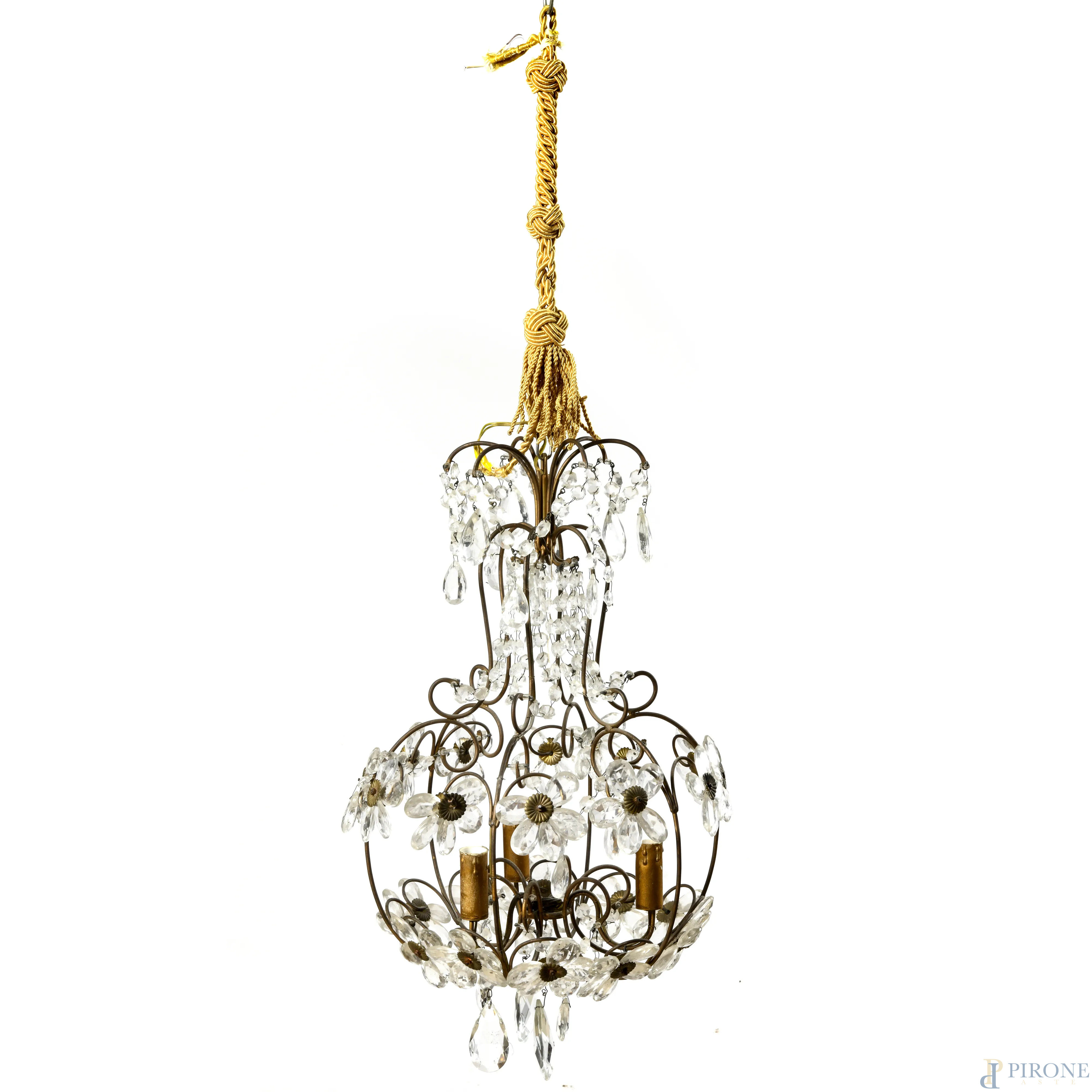 Lampadario in ferro battuto a tre luci con pendenti in cristallo, XX secolo, cm 70x34, (segni di usura del tempo, difetti)