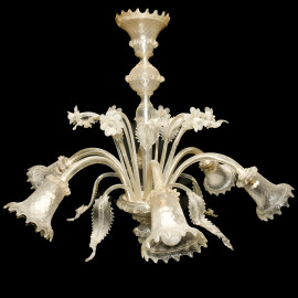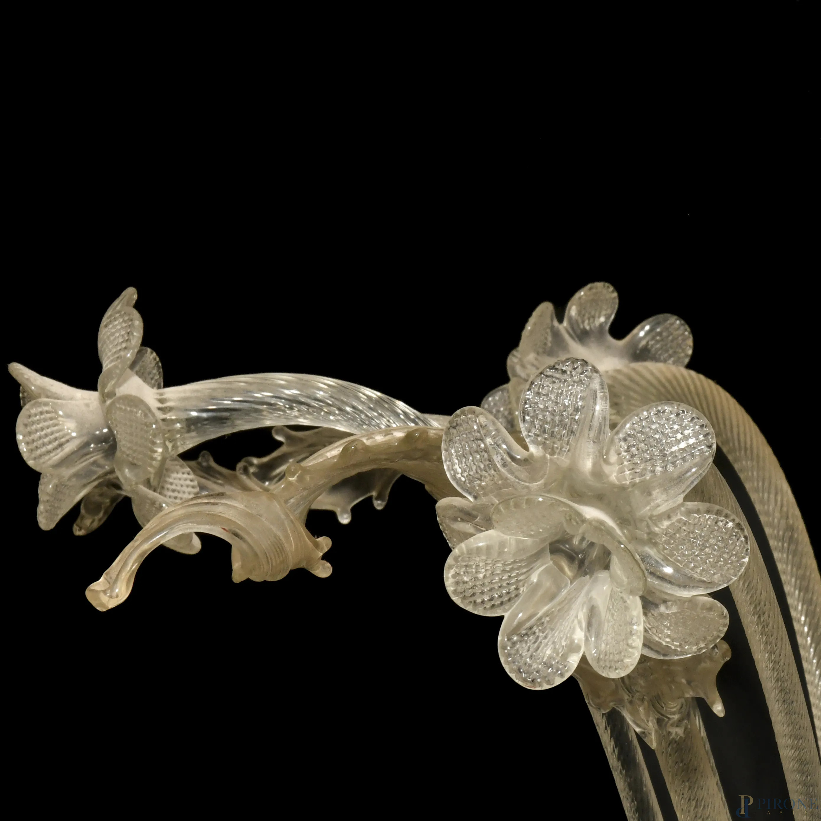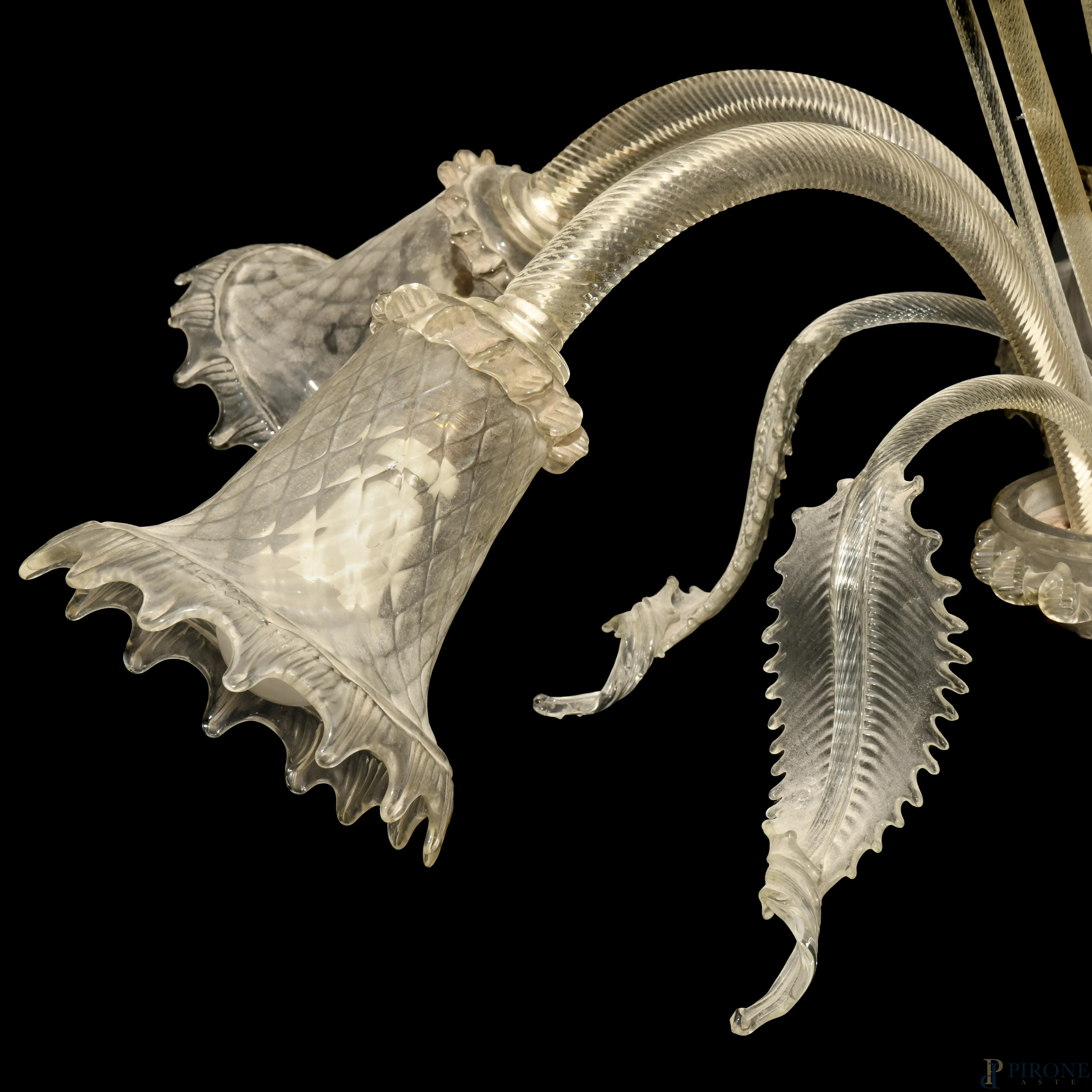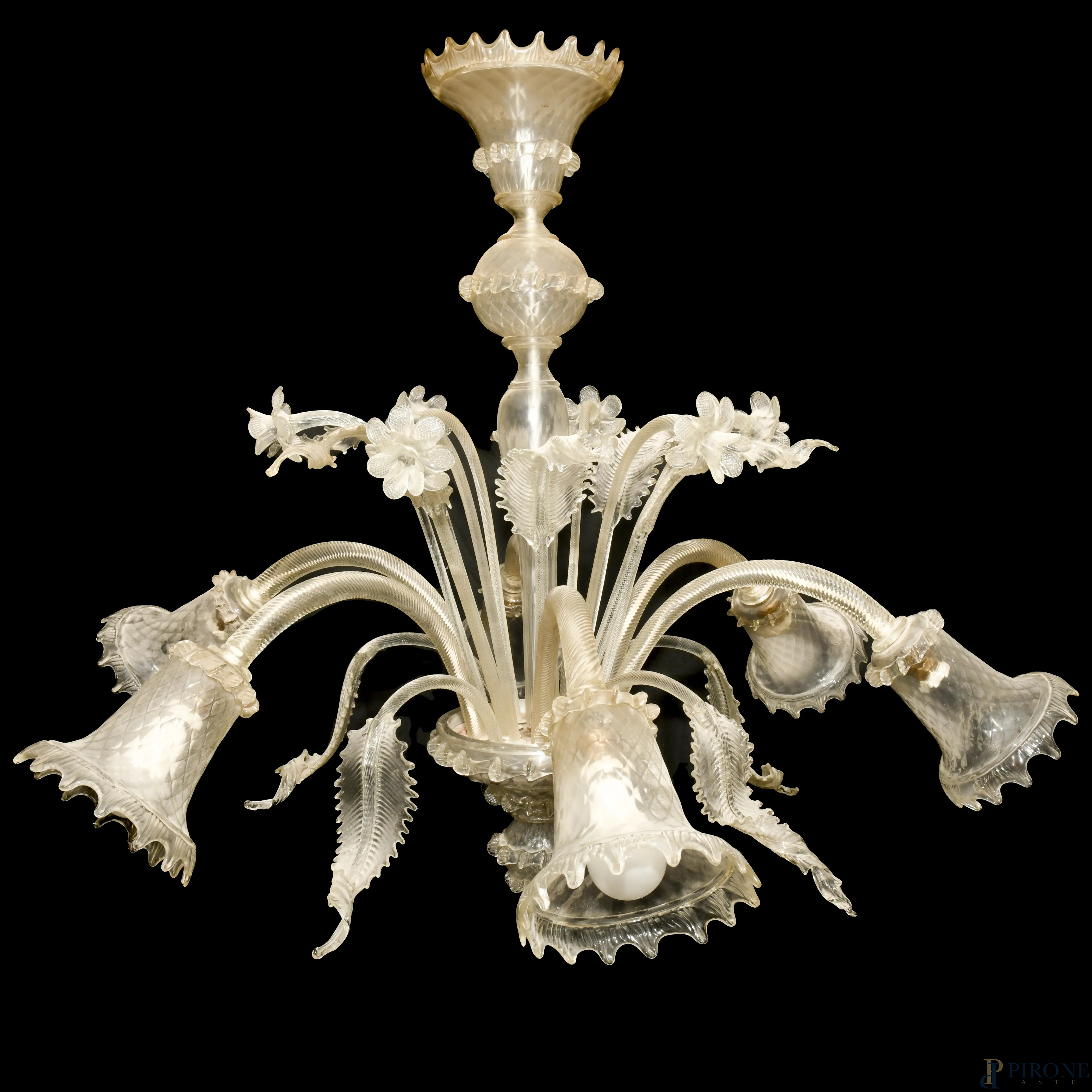 Lampadario in vetro di Murano a sei luci a foggia di corolle e racemi fogliati, XX secolo, cm 95x104 (circa)