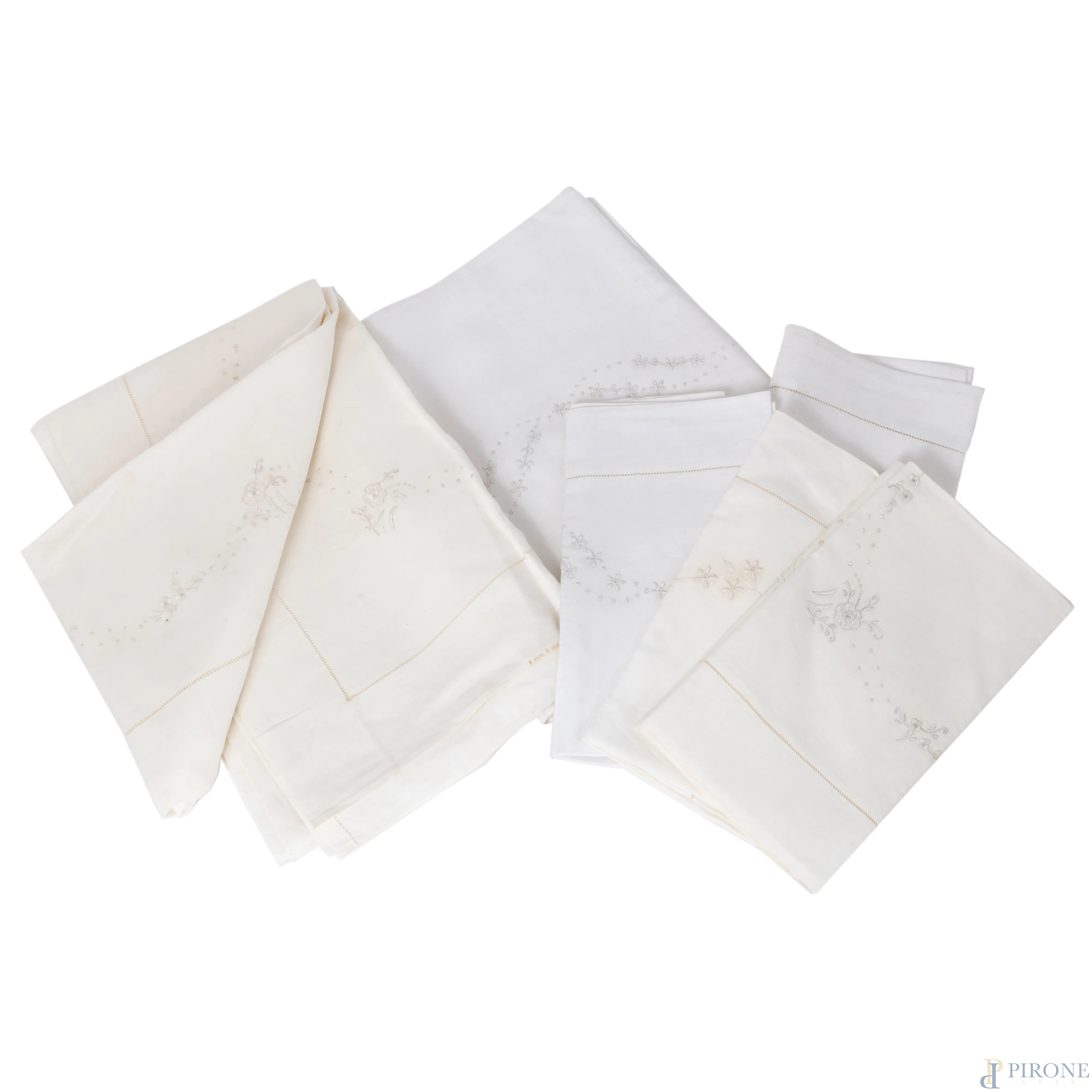 Lenzuola matrimoniali di lino ricamato e quattro federe da cuscino, XX secolo, (segni di usura)