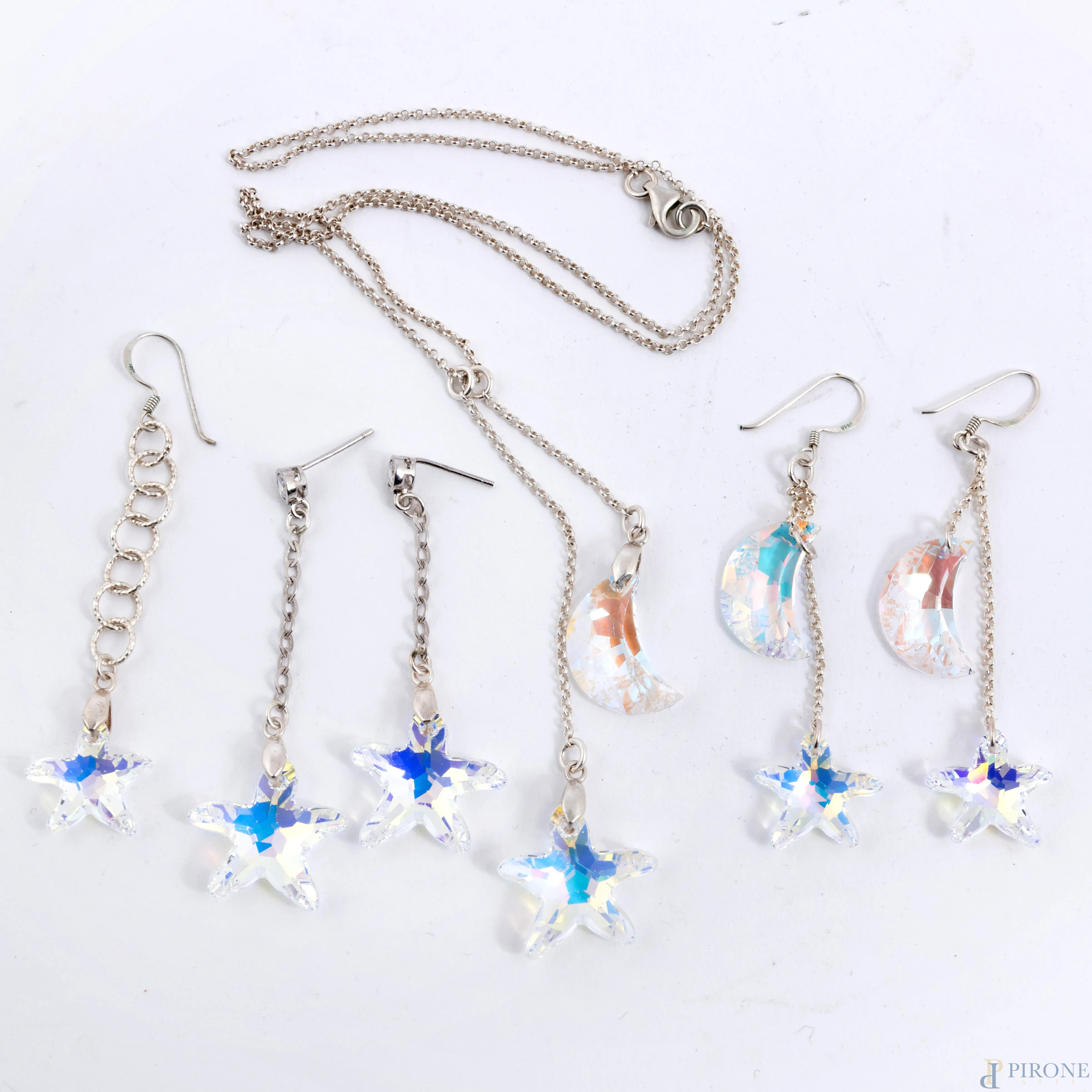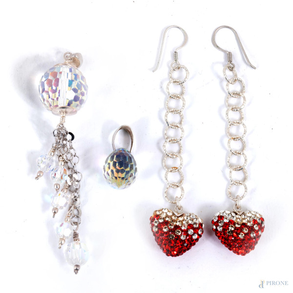 Lotto composto da catenina e due coppie di orecchini e un orecchino singolo in argento 925/000 ed elementi in resina, lunghezza massima orecchini cm 7, lunghezza catenina cm 45, peso lordo complessivo gr 21