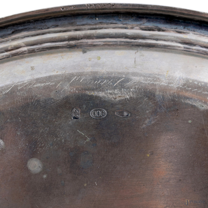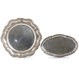Lotto composto da due vassoi polilobati in argento 800, XX secolo, peso totale gr. 720, misure massime diametro cm 33,5, (segni di usura del tempo)