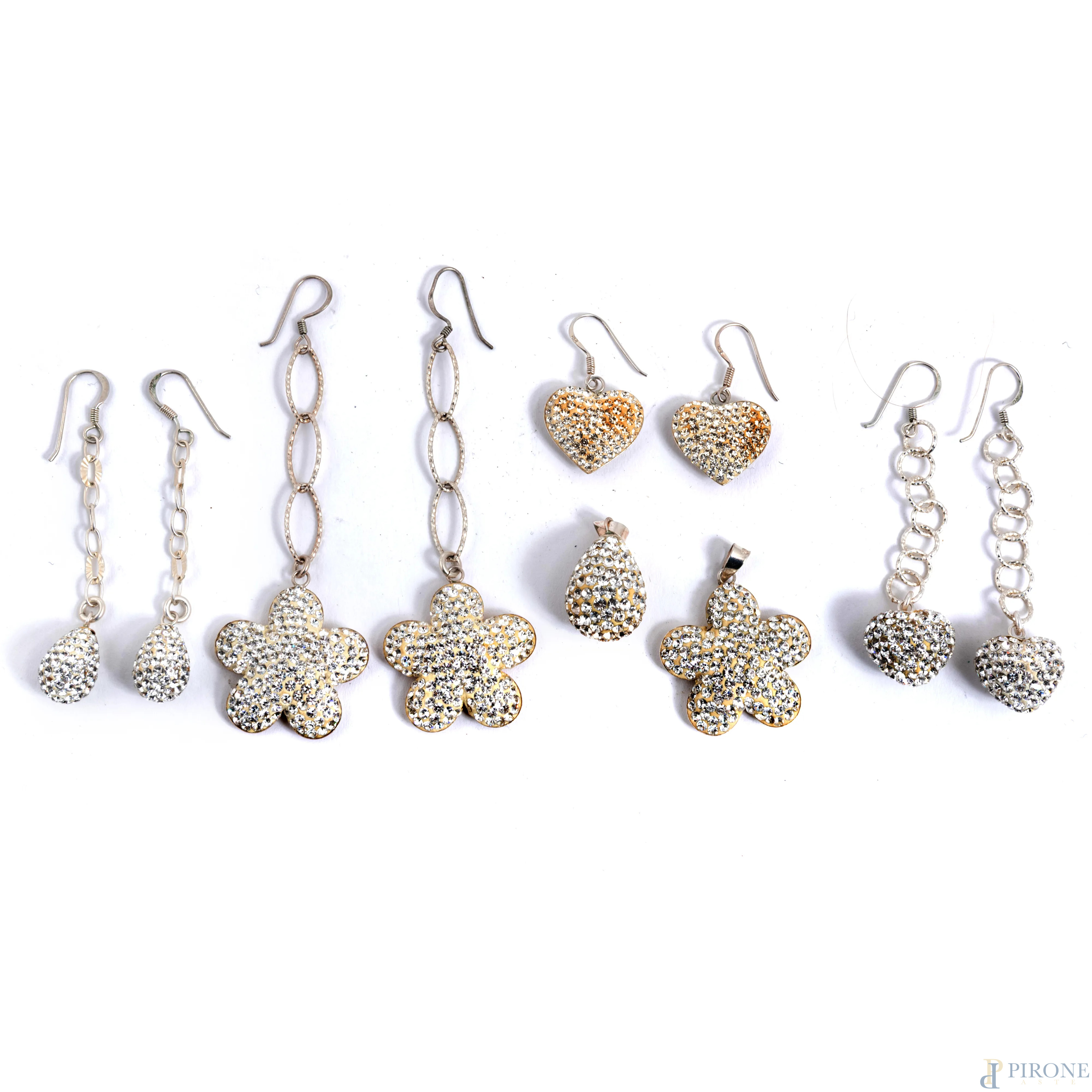 Lotto composto da quattro coppie di orecchini e due ciondoli in argento e brillantini, lunghezza massima cm 8,5, peso lordo complessivo gr 38
