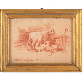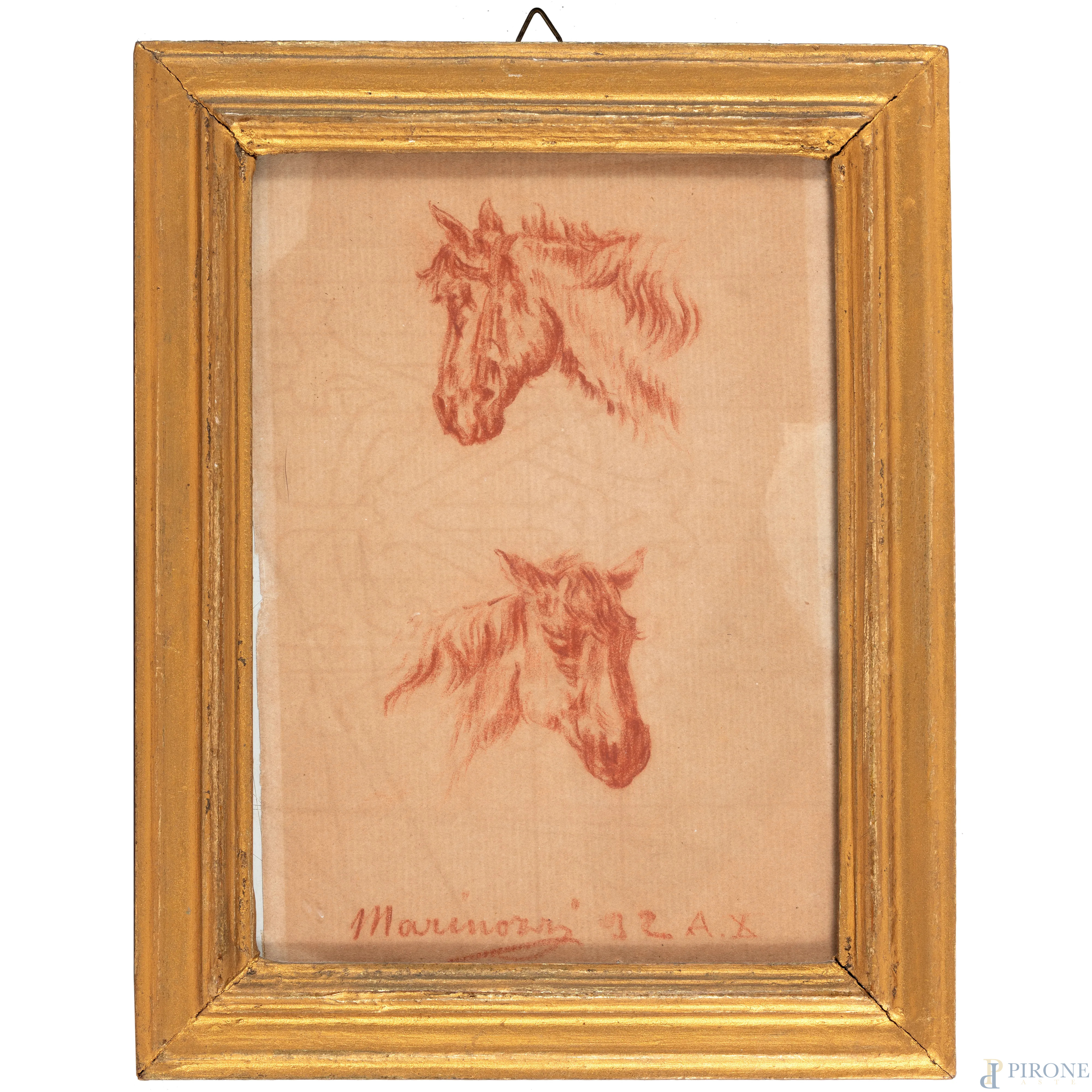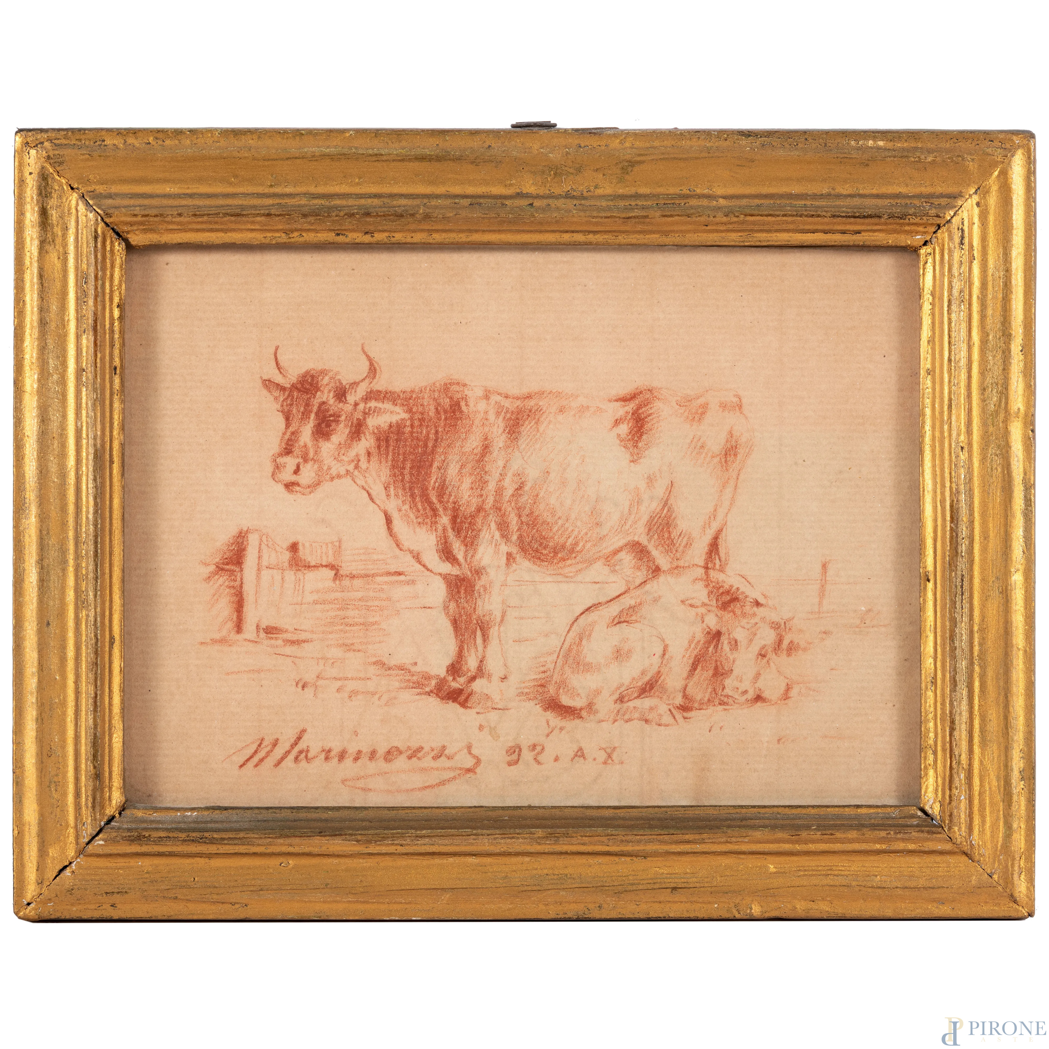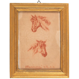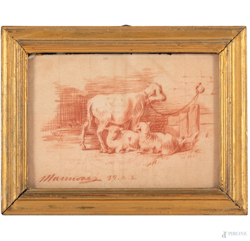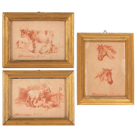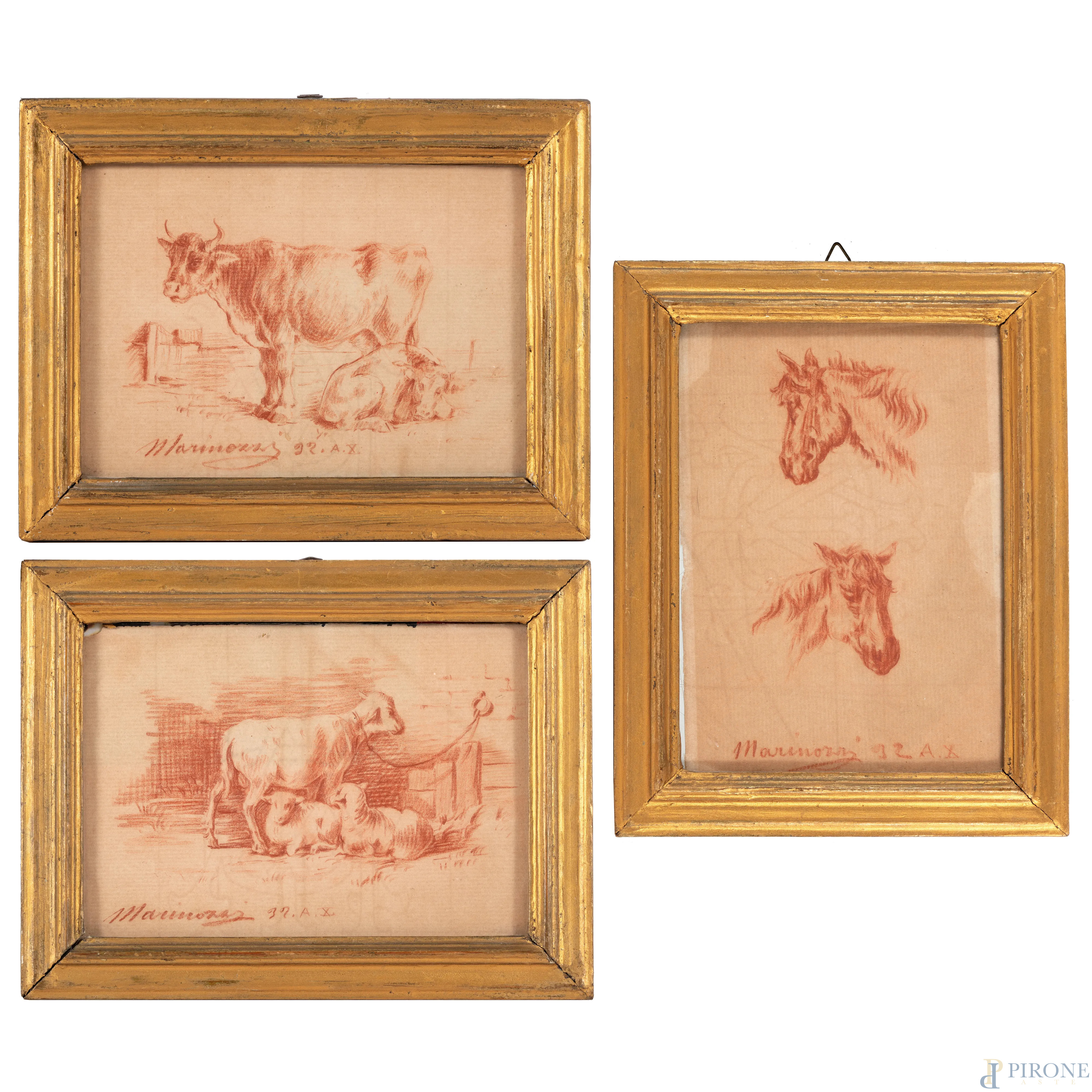 Lotto composto da tre disegni a sanguigna raffiguranti animali, XX secolo, misure massime cm 18x14, firmate in basso, entro cornice, (tracce di umiidtà, piegature, bruniture, foxing)