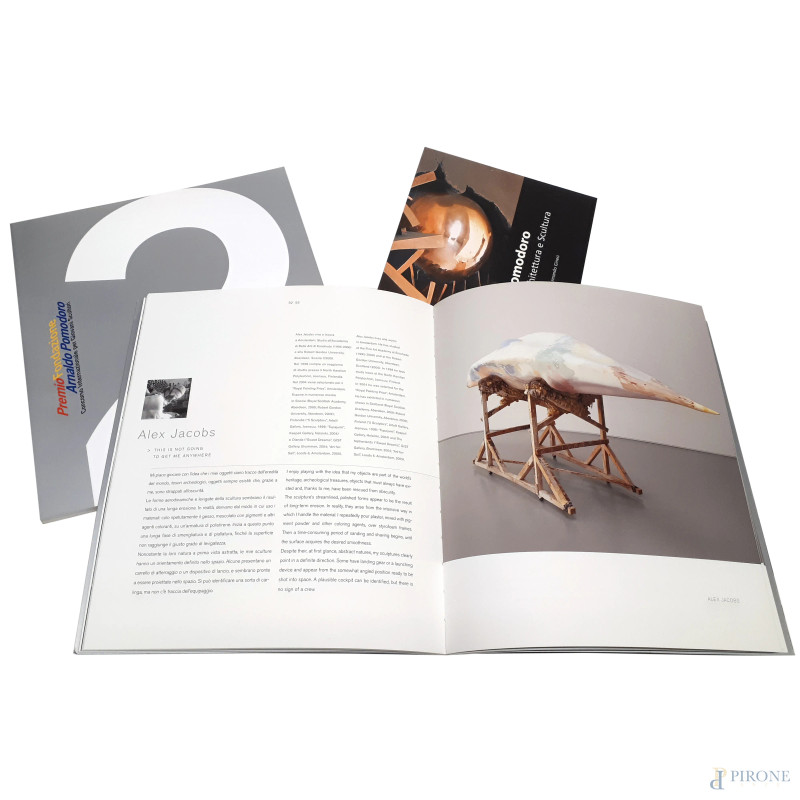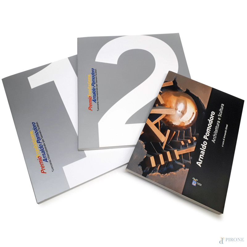 Lotto composto da tre volumi: “Premio Fondazione Arnaldo Pomodoro opere giovani scultori” volumi 1 e 2 (90 pagine ciascuno illustrate a colori) e “Arnaldo Pomodoro architettura e scultura” a cura di Armando Ginesi (80 pagine illustrate a colori)