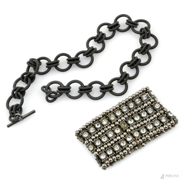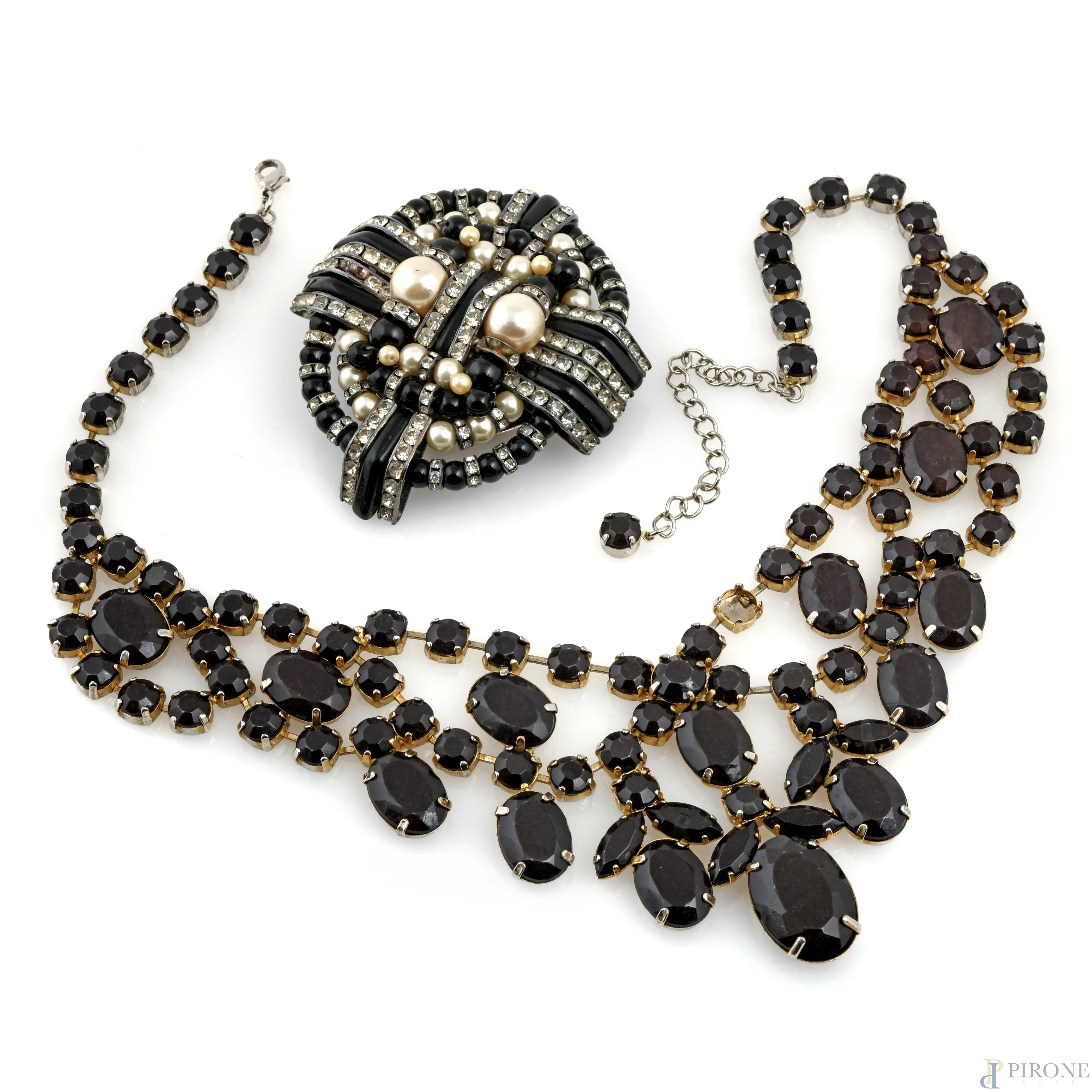 Lotto composto da una collana e da una spilla di bigiotteria, lunghezza cm 50, (segni di usura, difetti, mancanze)