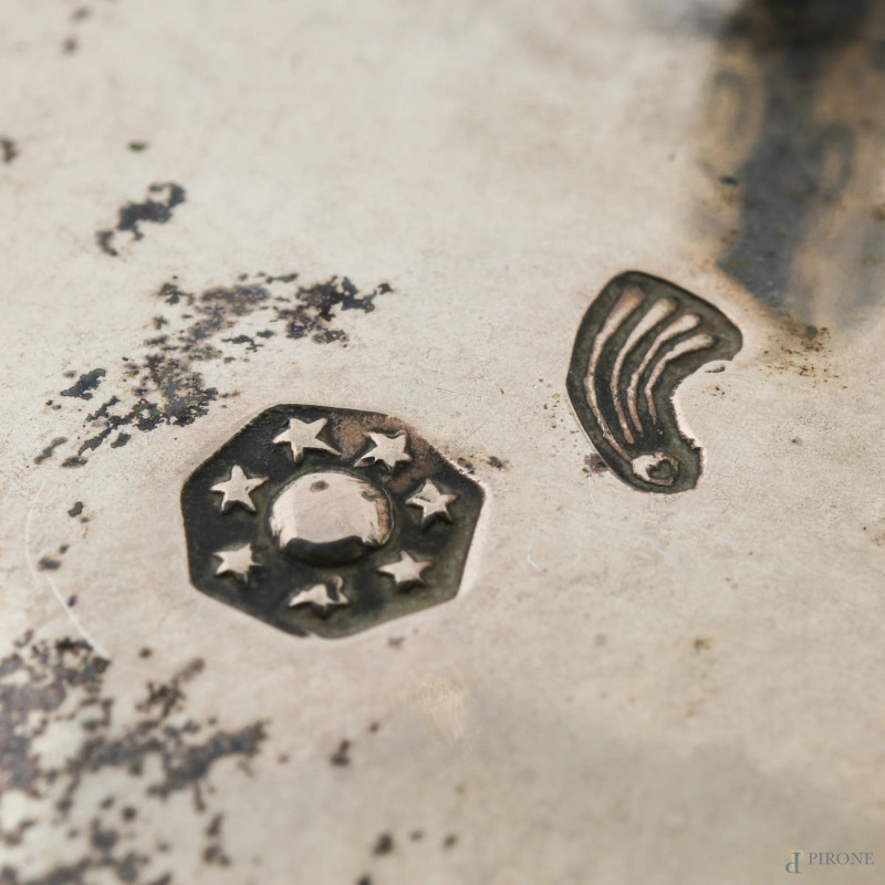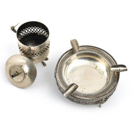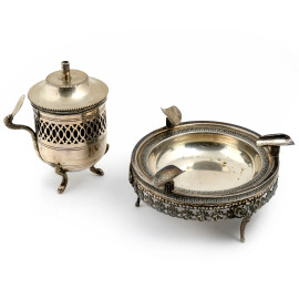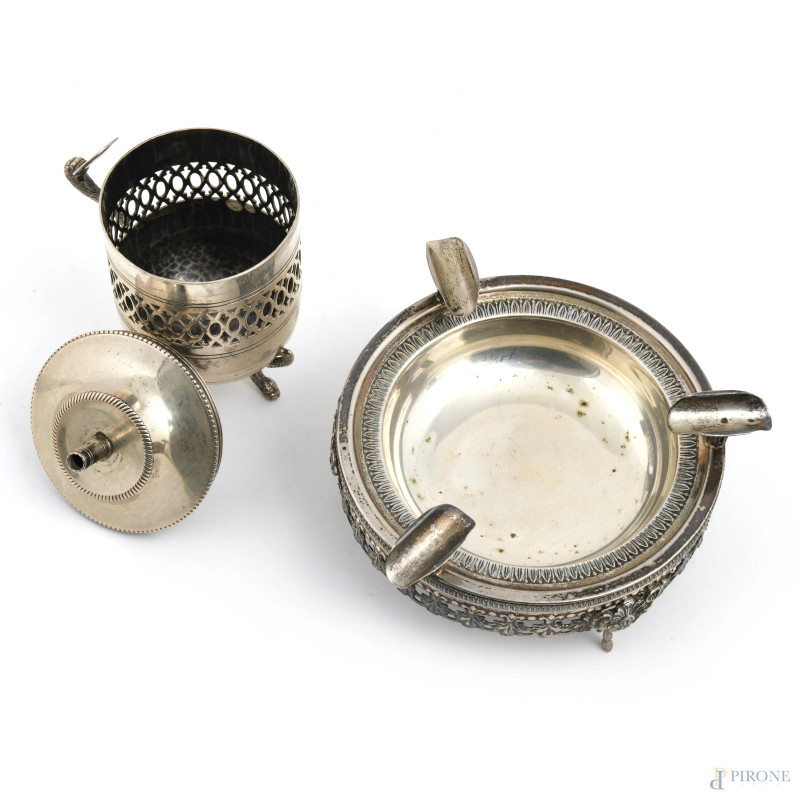 Lotto composto da zuccheriera monoansata e da posacere in argento 800/000 finemente cesellati poggianti su piedini, misure massime cm 12x13,5, peso complessivo gr 320, (segni di usura)