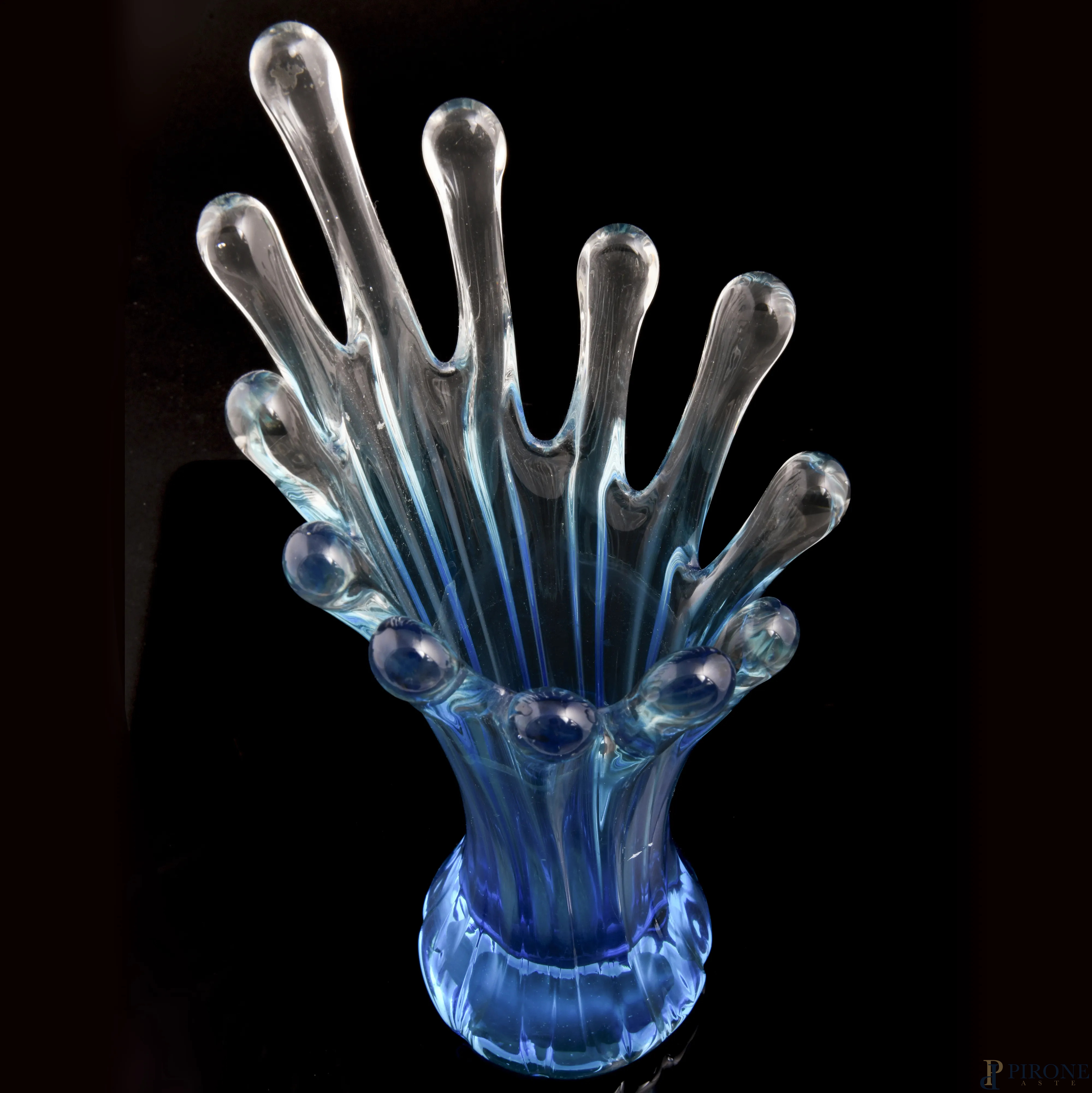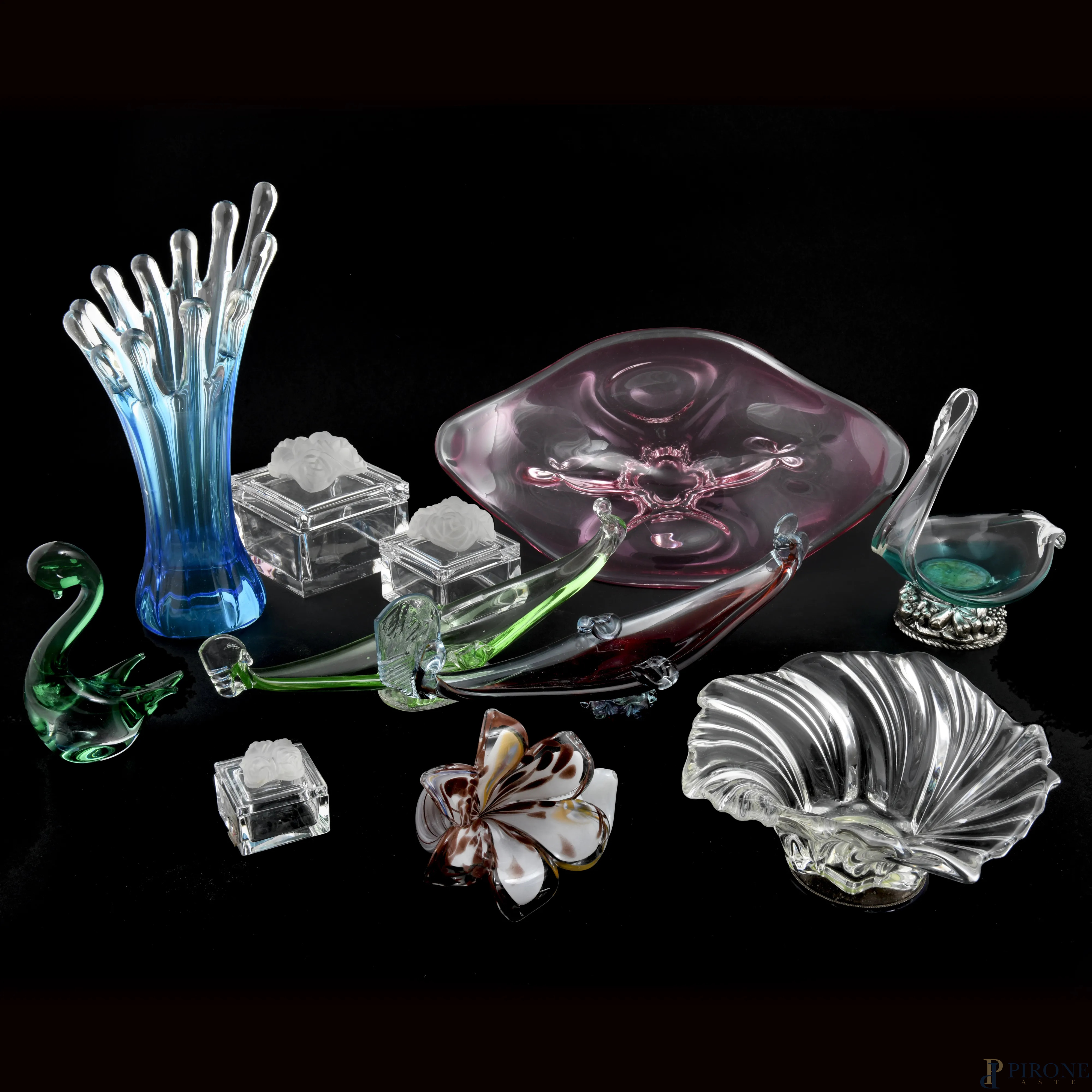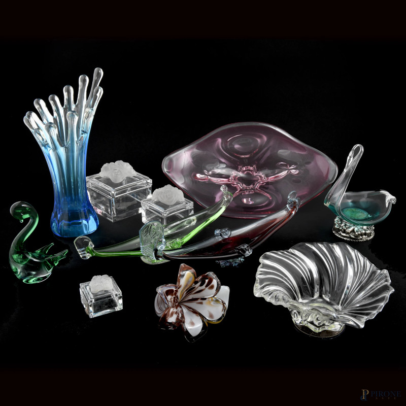 Lotto di 11 oggetti in vetro soffiato e cristallo, XX secolo, altezza massima cm 31, (rotture, scalfiture, segni di usura)