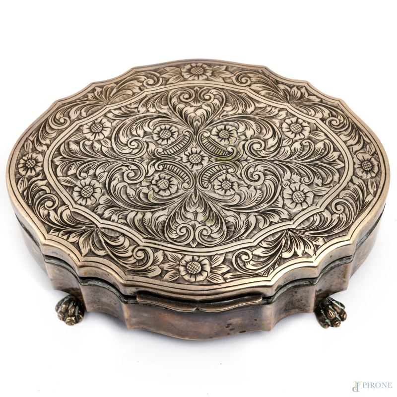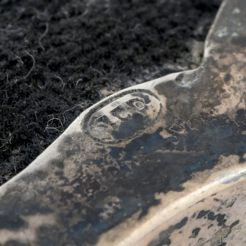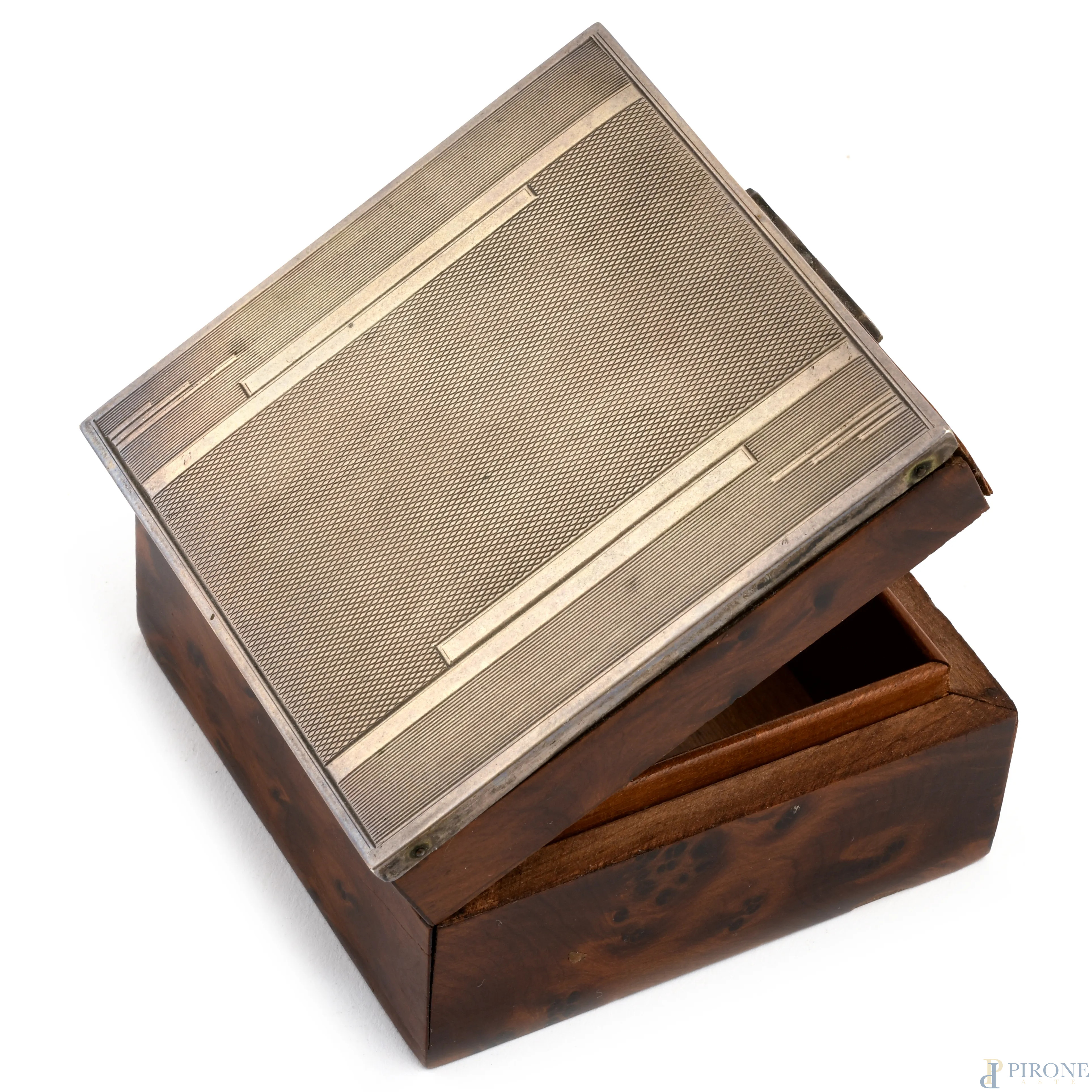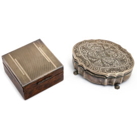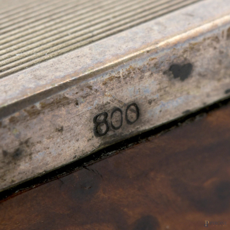 Lotto di due cofanetti, uno in legno con coperchio rivestito in argento 800/00 e l'altro in argento 800/000 con interno in velluto, XX secolo, misure massime cm 5x13,5x9,5, peso lordo complessivo gr 330, (segni di usura)
