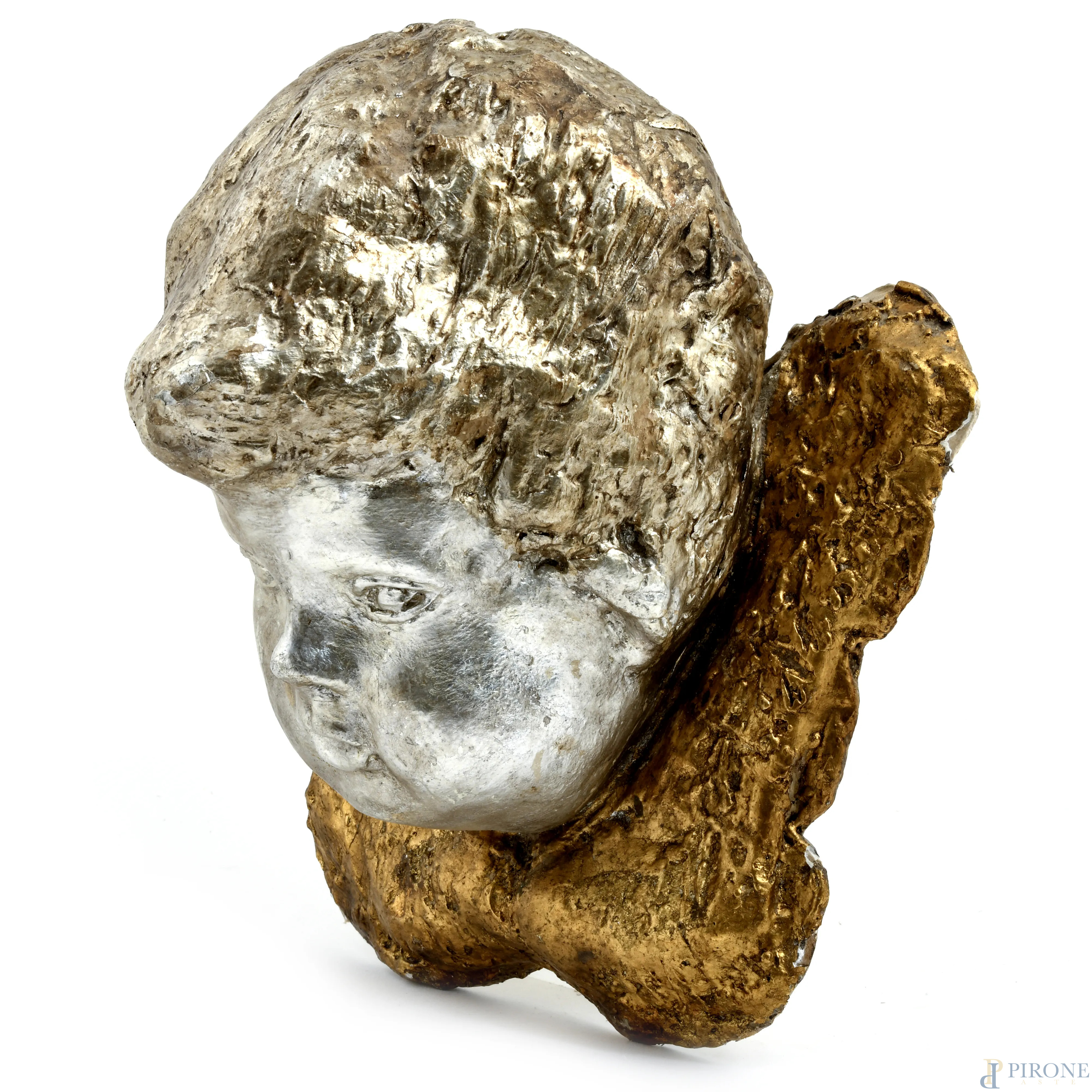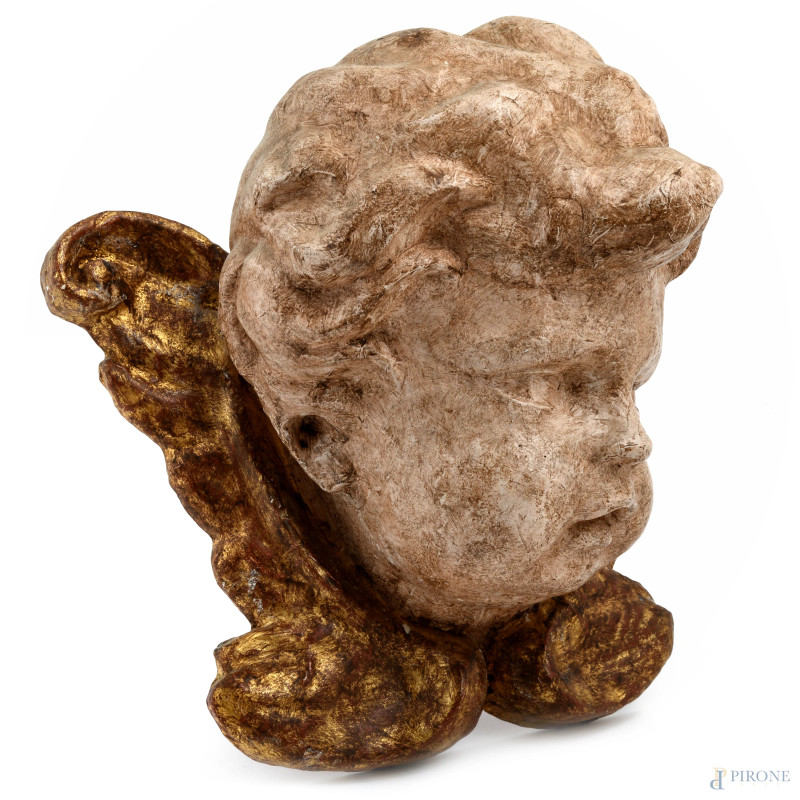 Lotto di due teste di cherubino in cartapesta, XIX e XX secolo, cm 29x28, (segni di usura, difetti)