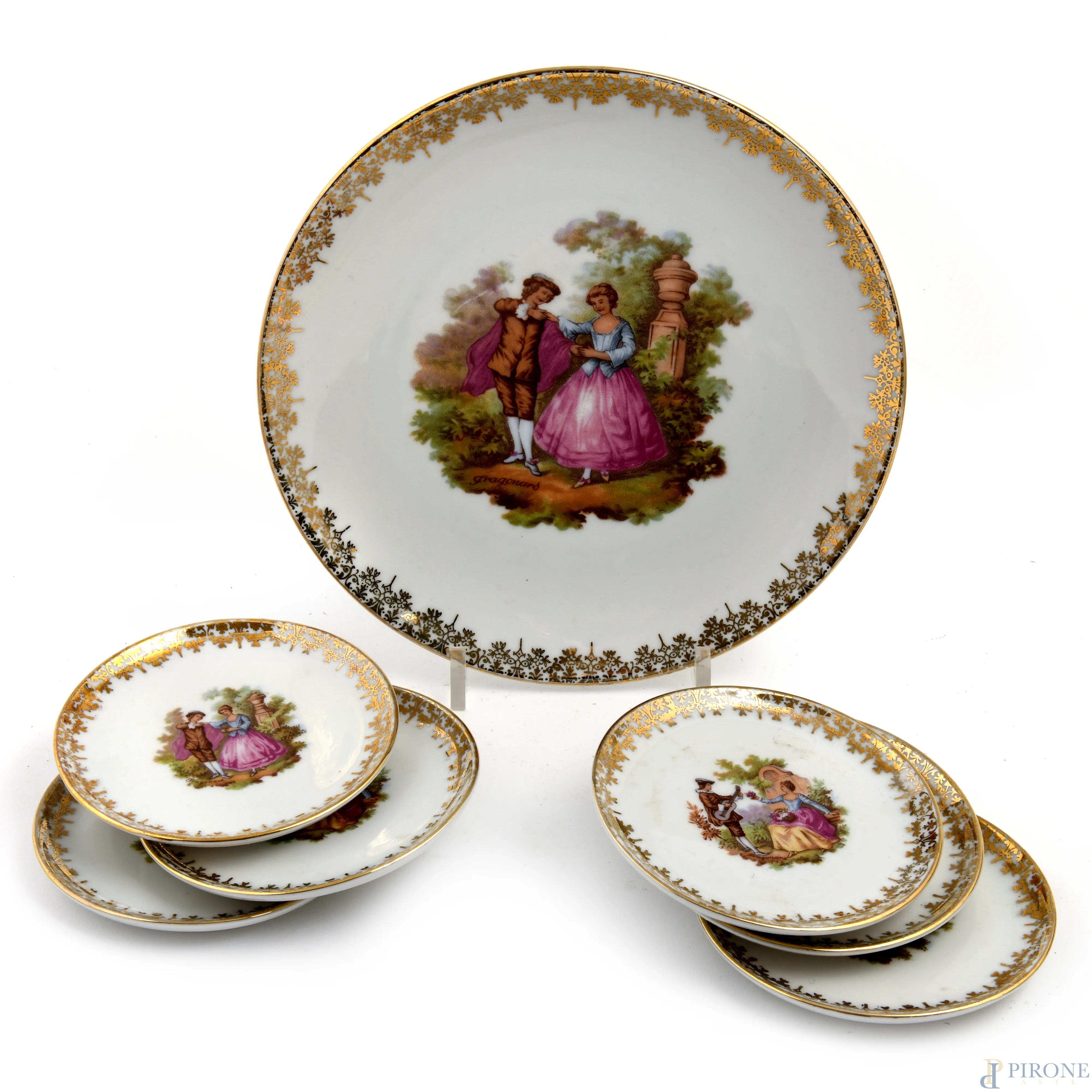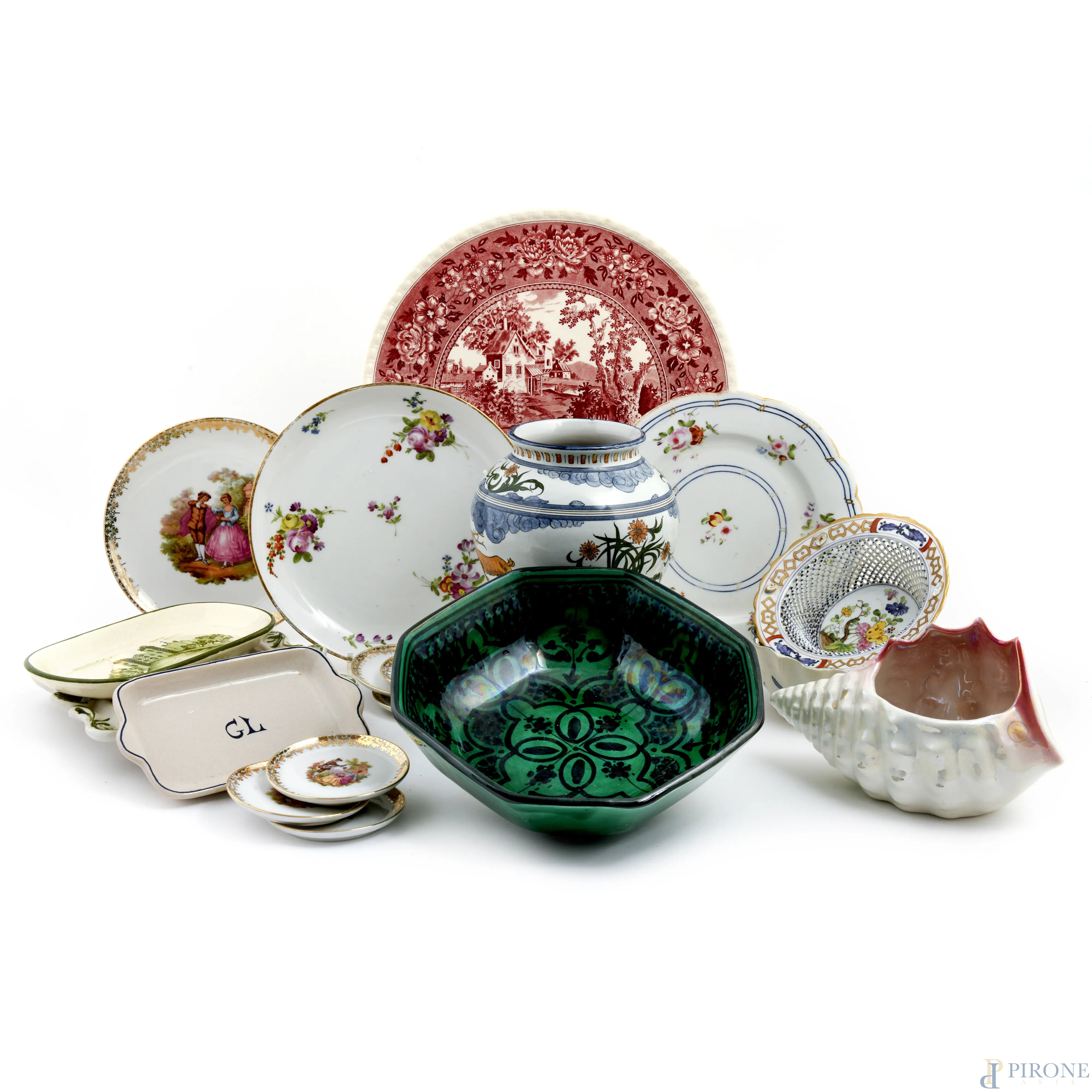 Lotto di oggetti di varia manifattura in porcellana e ceramica, XX secolo, altezza massima cm 16, diametro massimo cm 32,5 (segni di usura, difetti, scalfiture, rotture, restauri)