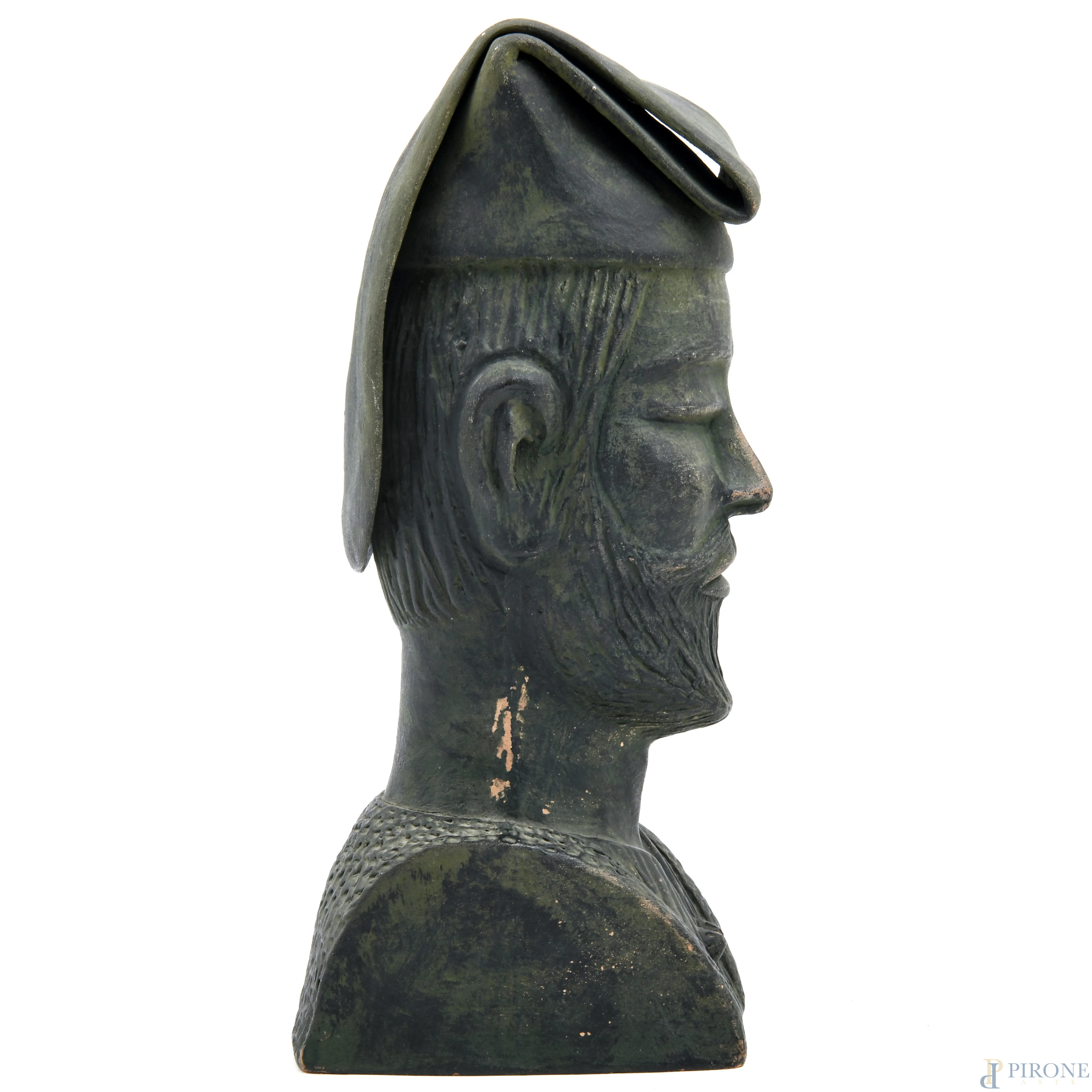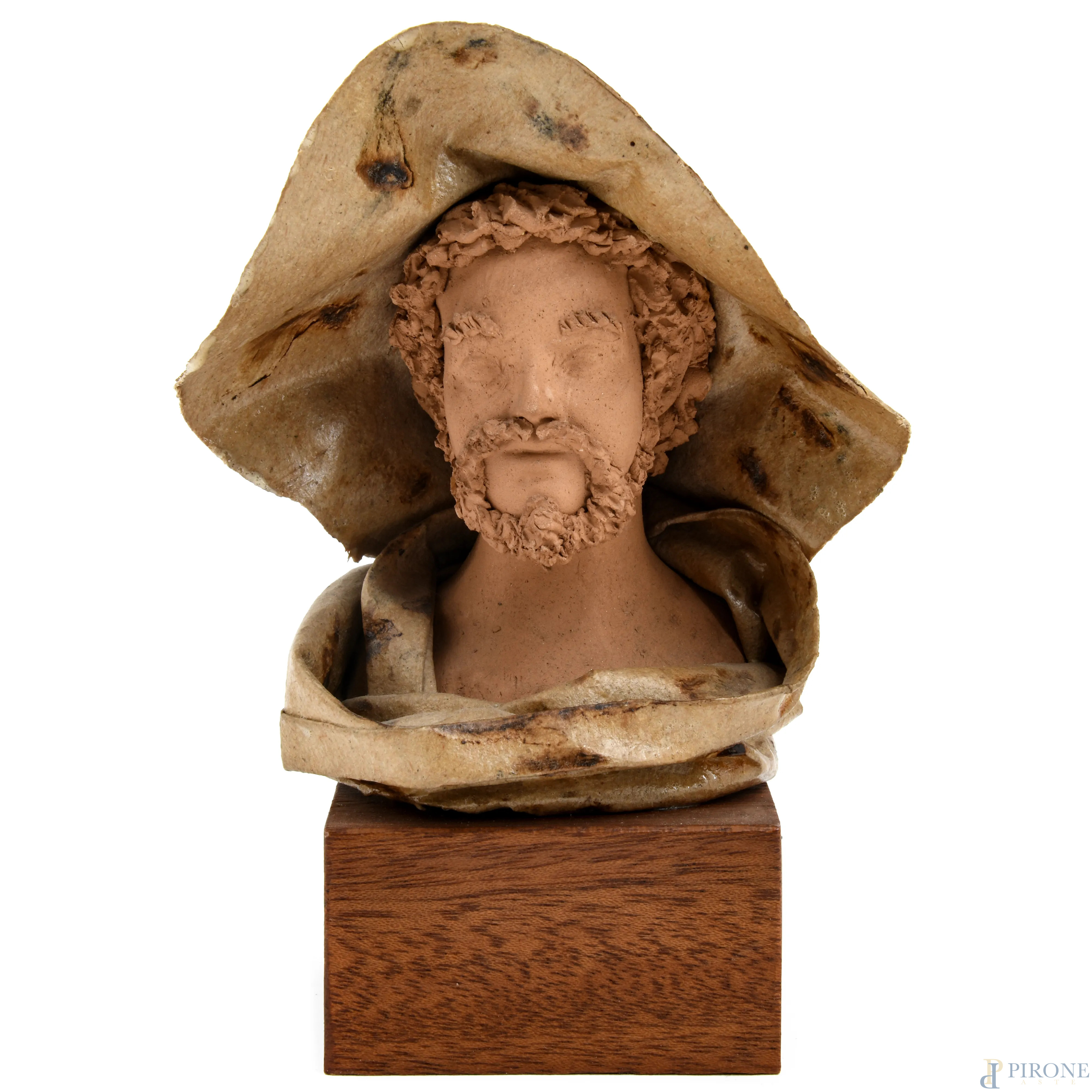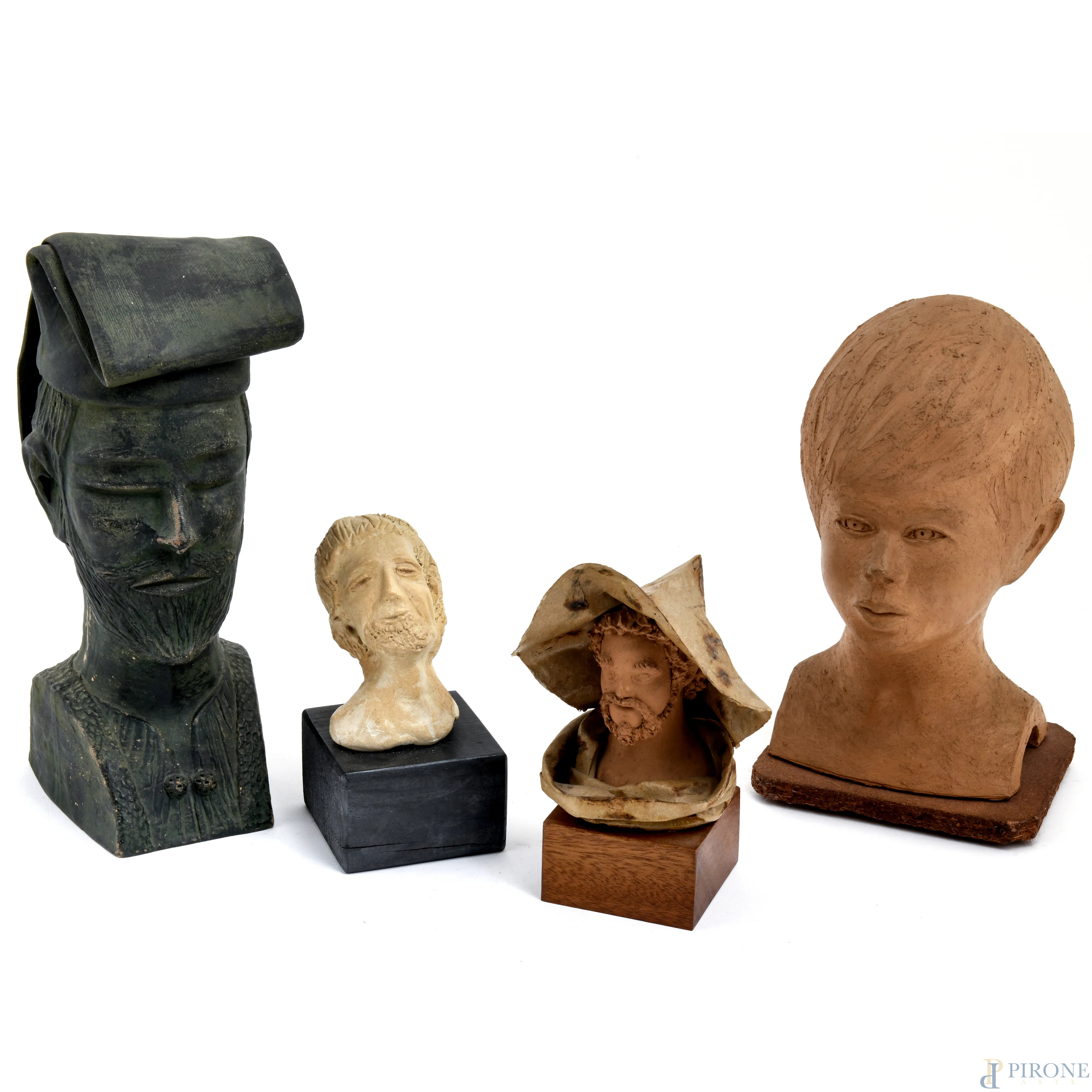 Lotto di quattro busti in terracotta e in materiali vari, XX secolo, altezza massima cm 24,5, (segni di usura, difetti, scalfiture)