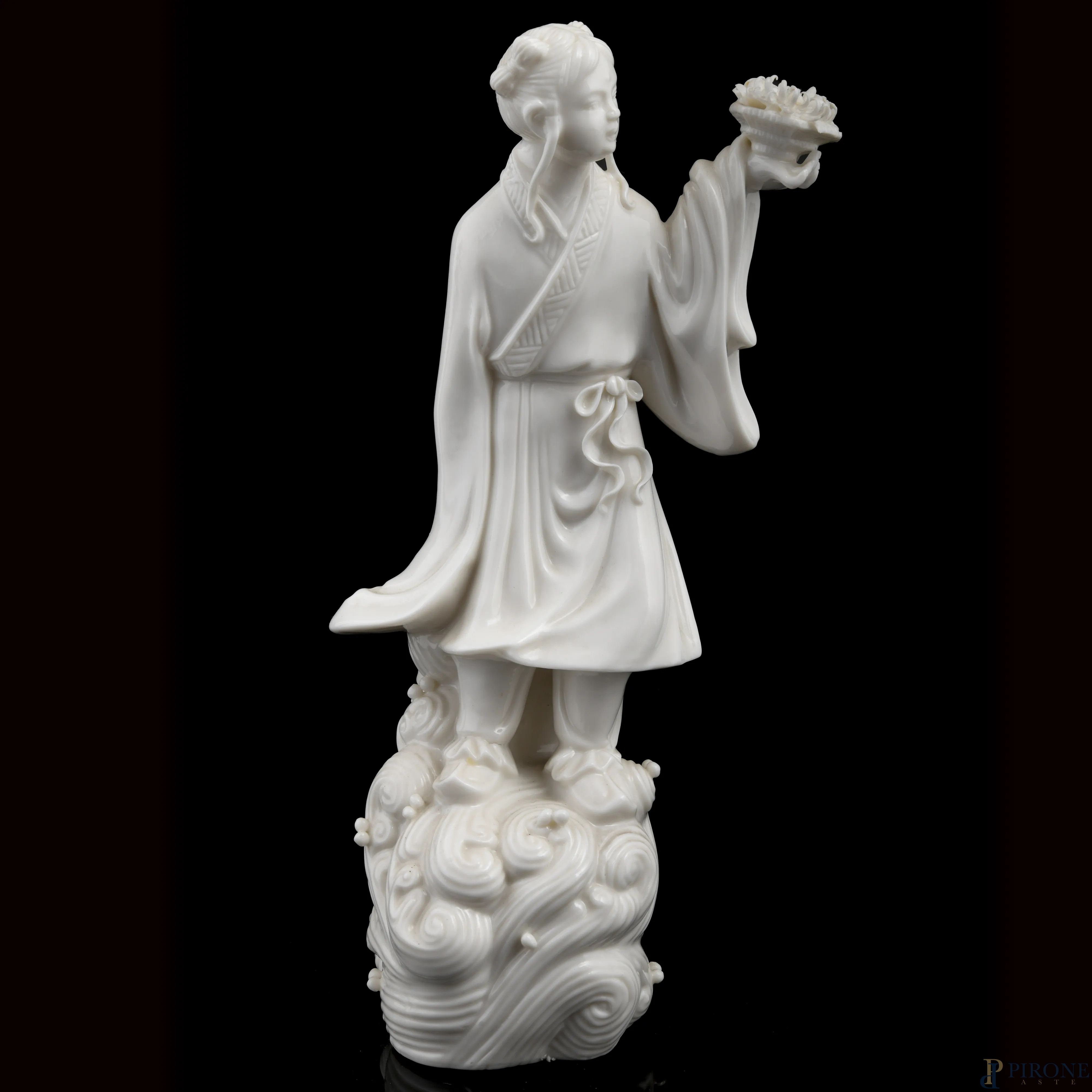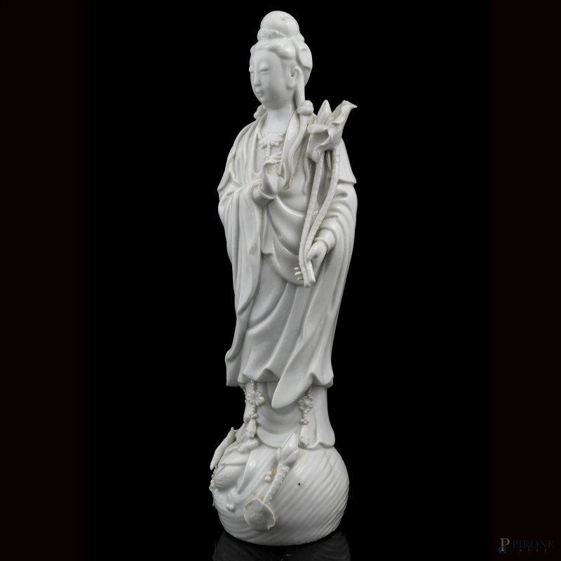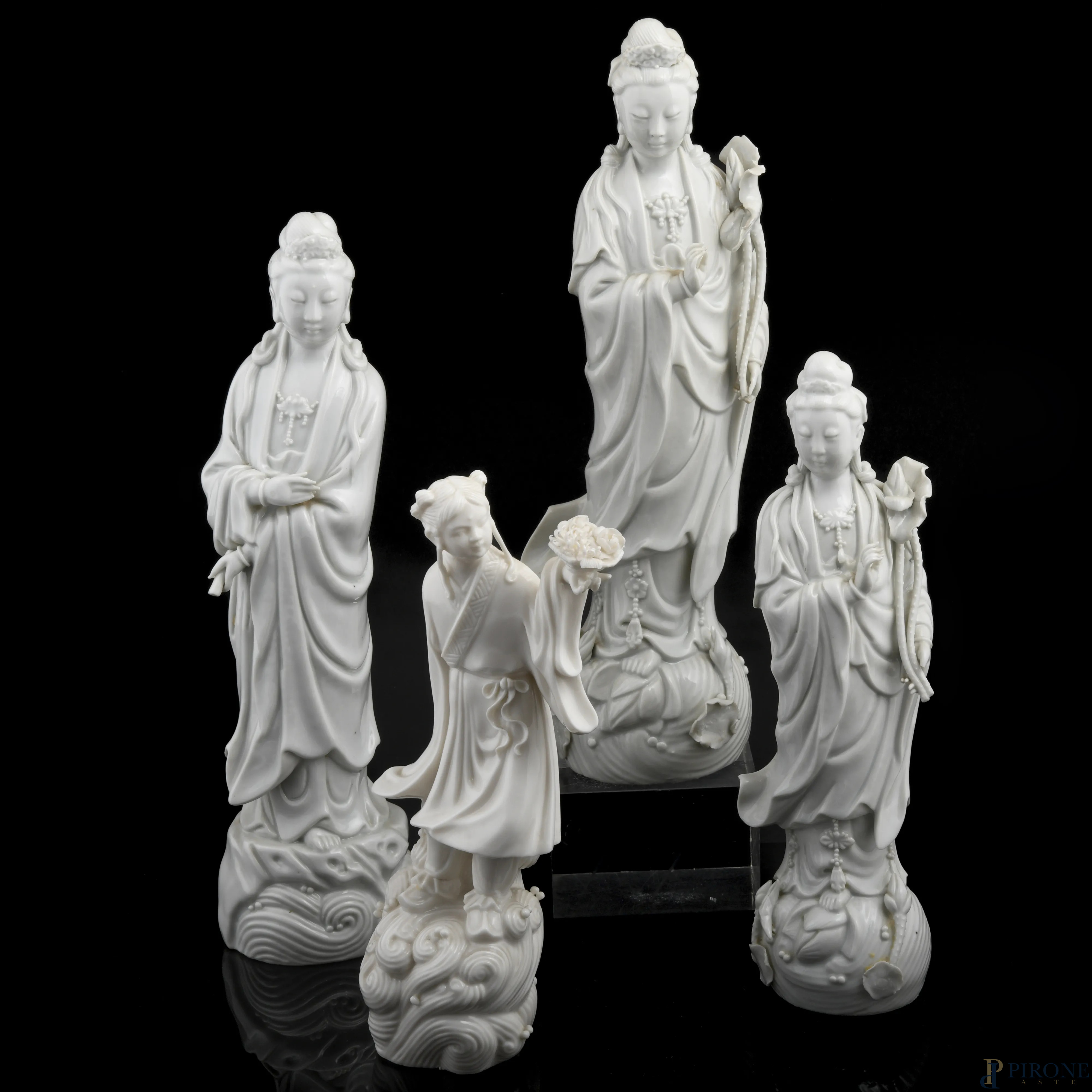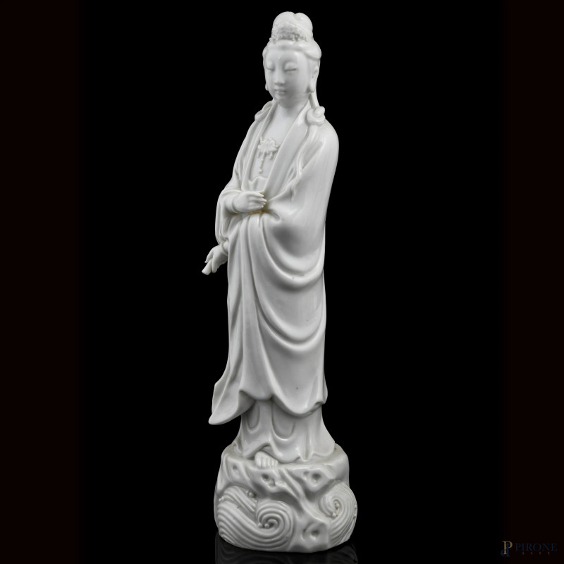 Lotto di quattro guanyn in porcellana bianca, XX secolo, altezza massima cm 32, ( segni di usura, difetti di cottura, felature, piccoli difetti)