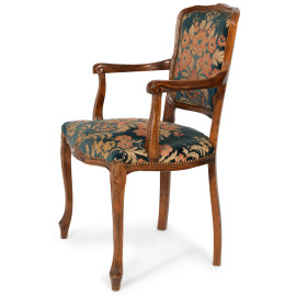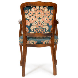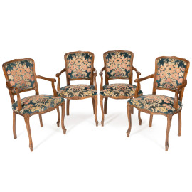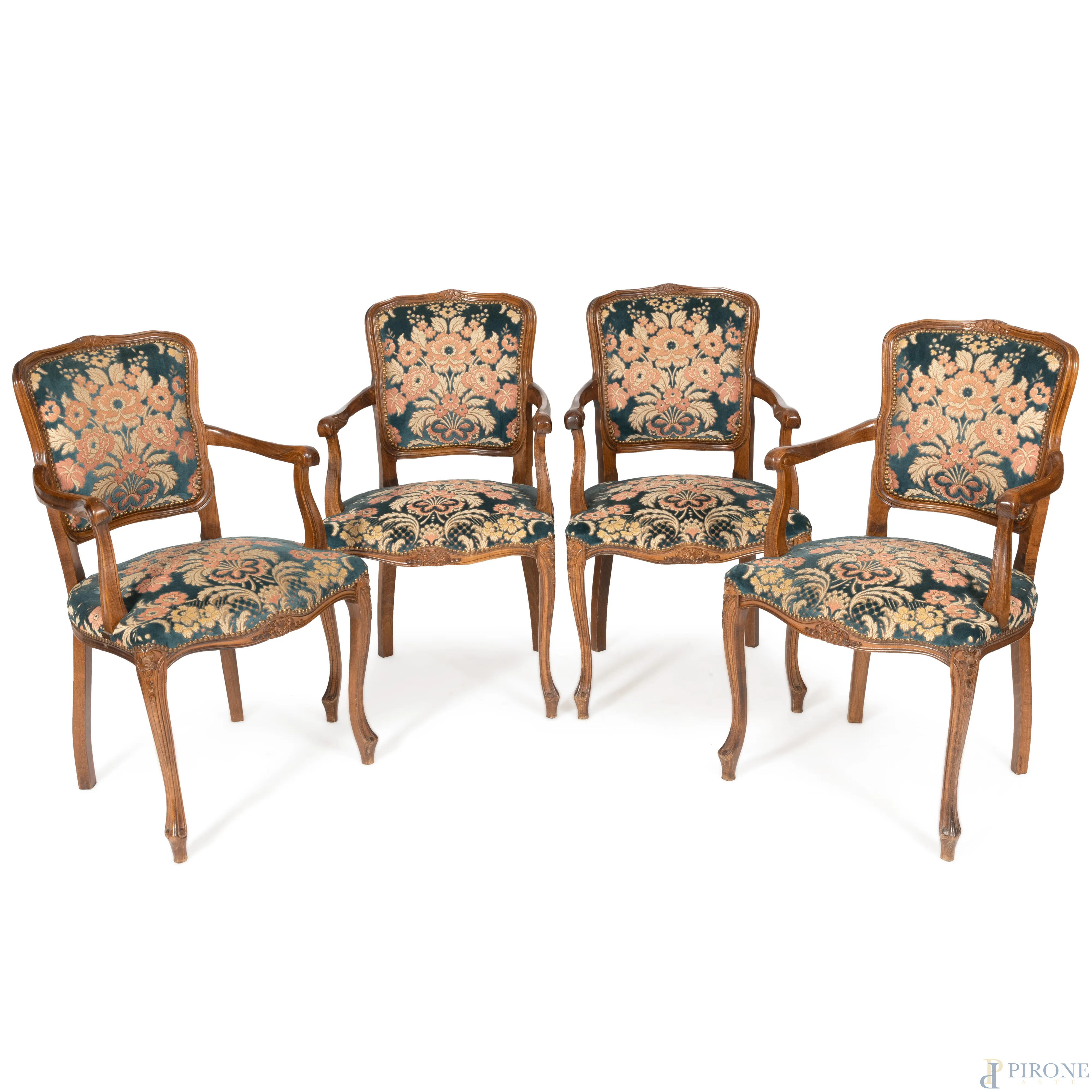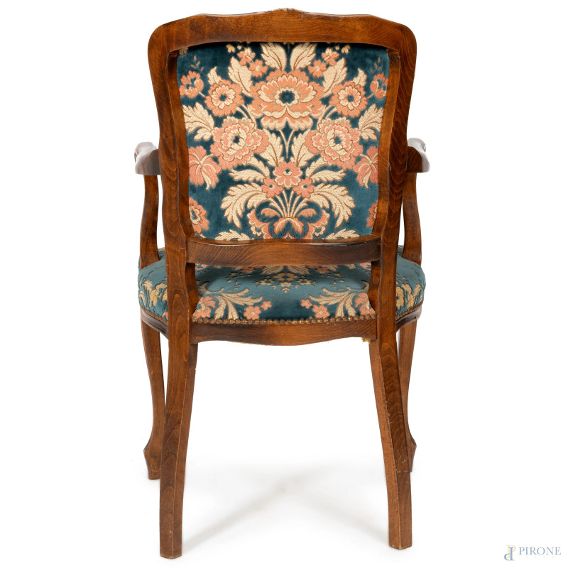 Lotto di quattro poltroncine con struttura in noce, schienale e seduta imbottiti e rivestiti in velluto con decori floreali e vegetali, XX secolo, cm 92x54x50, (segni di usura, difetti, graffi, scalfiture)