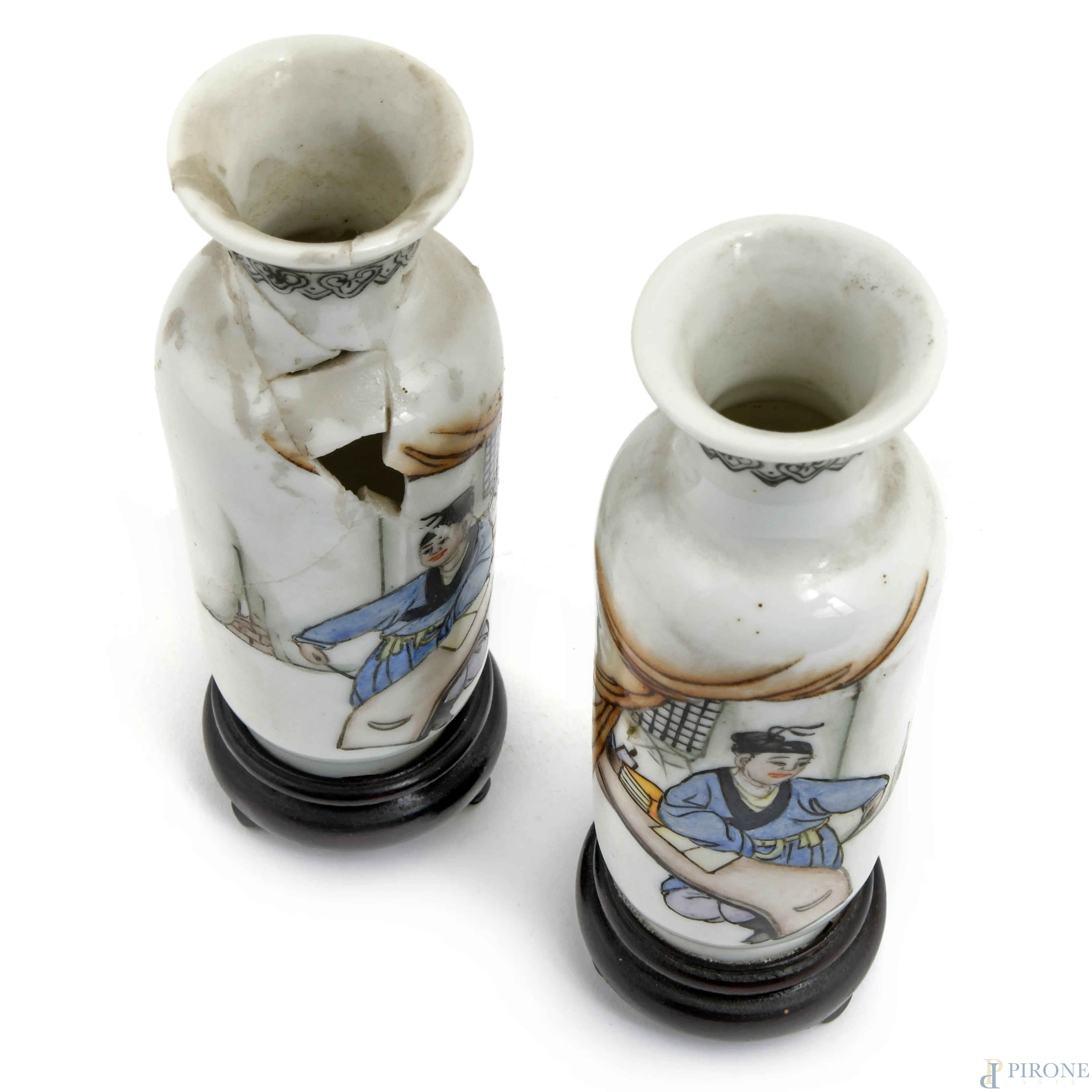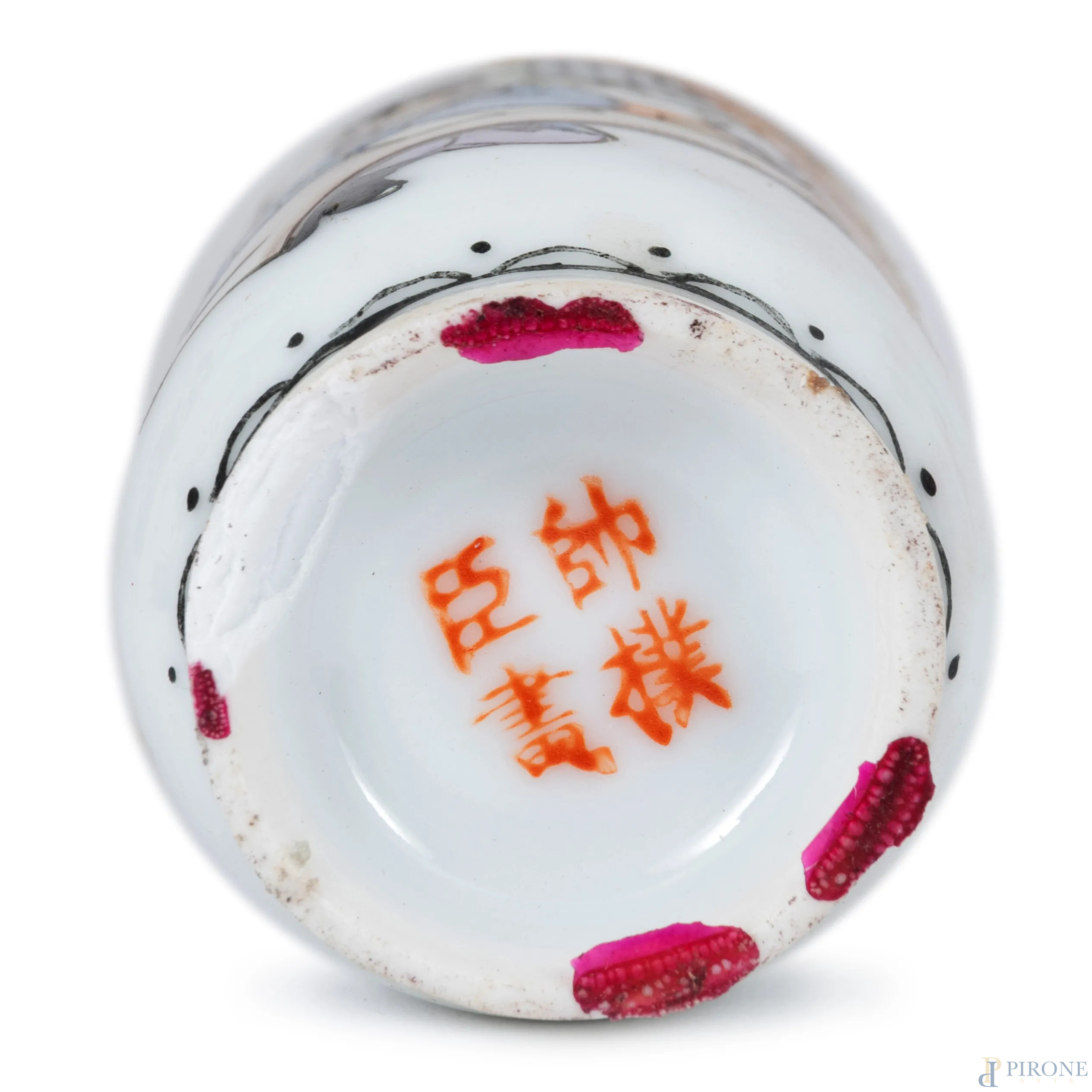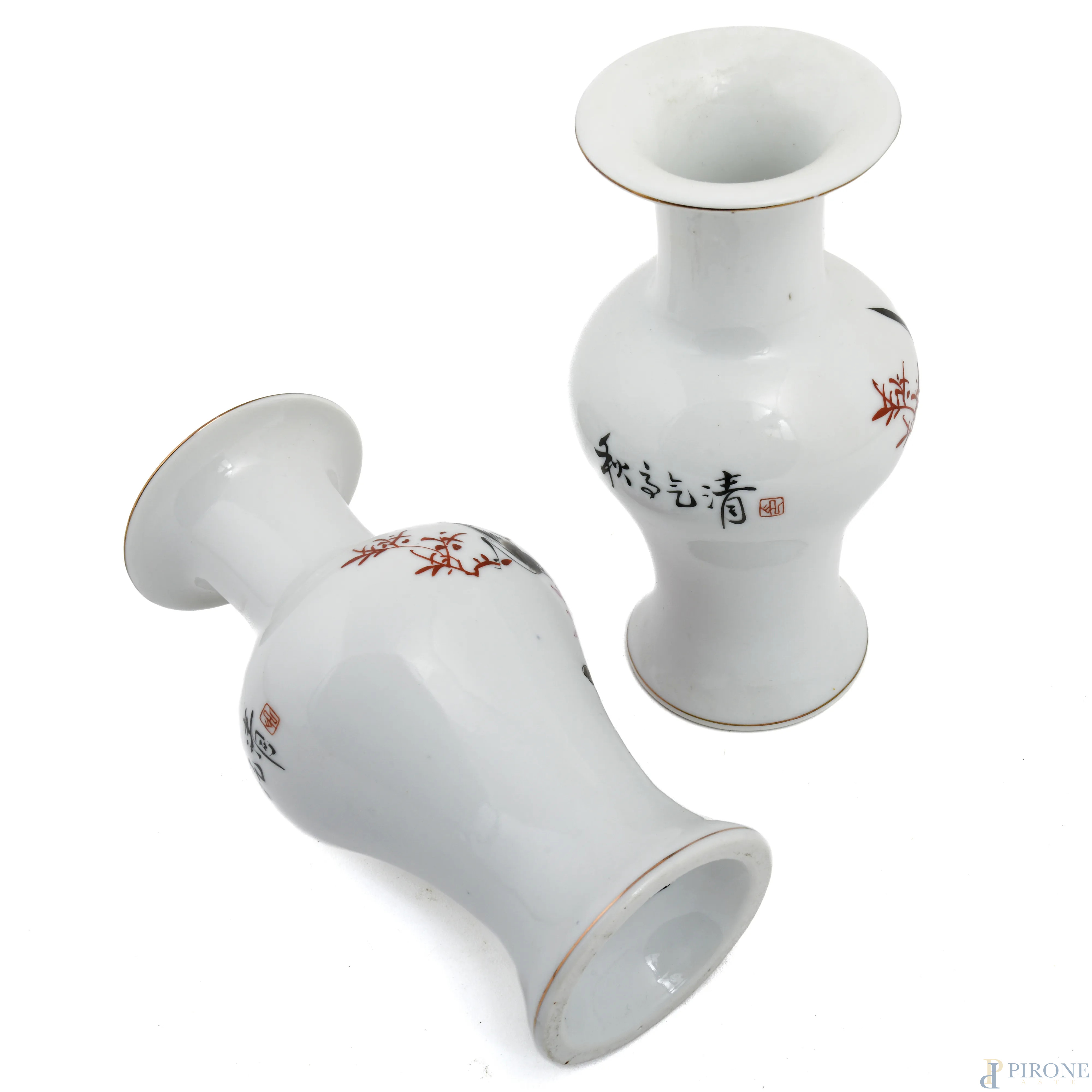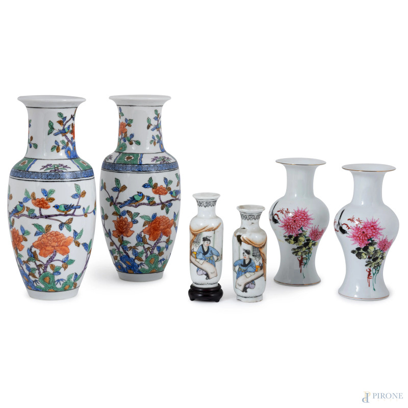 Lotto di sei vasi orientali di varia manifattura e foggia in porcellana, XX secolo, altezza massima cm 26,5, (felature, restauri, difetti, scalfiture)