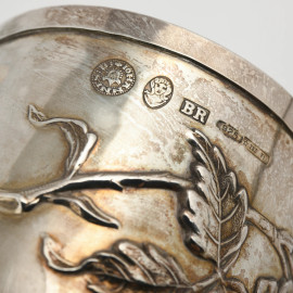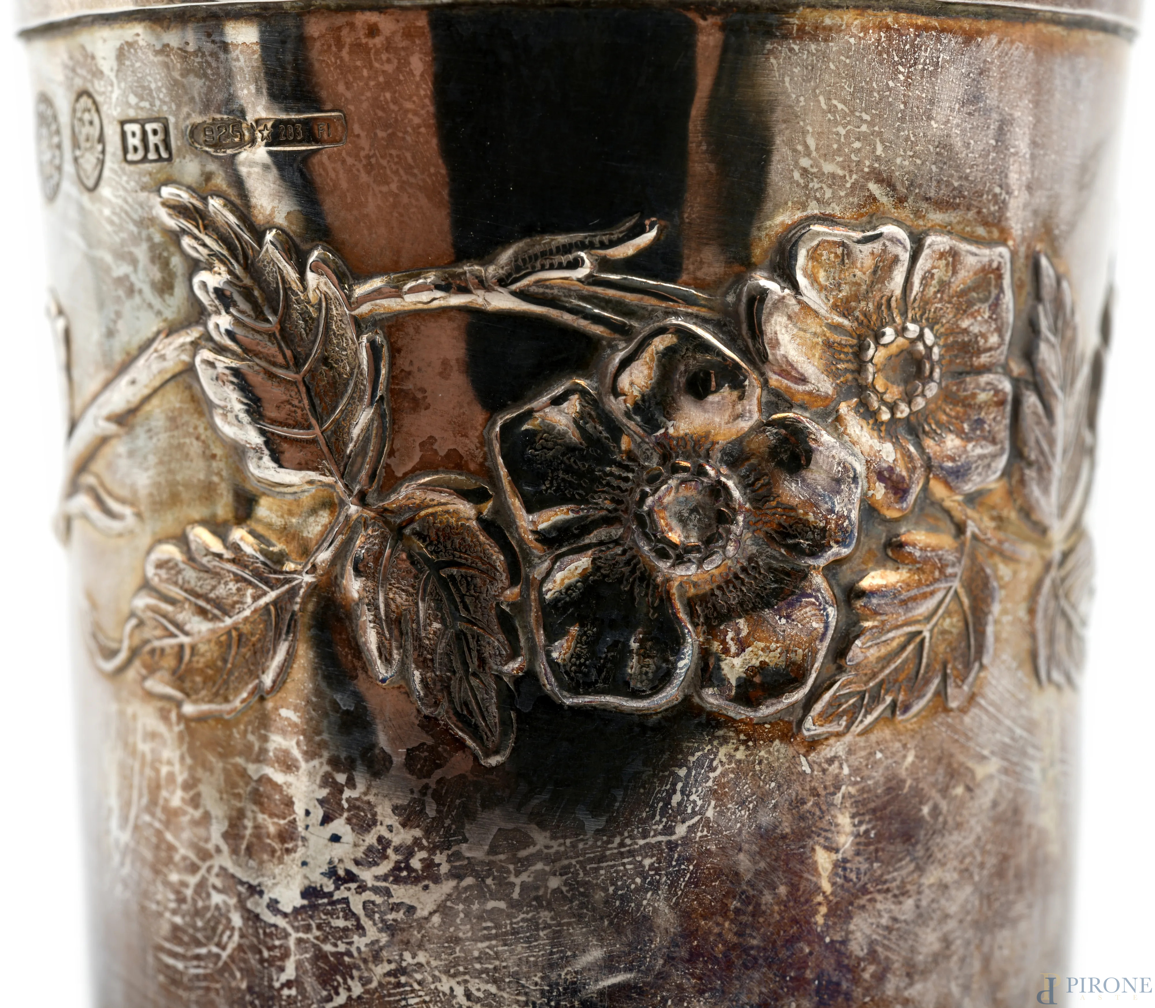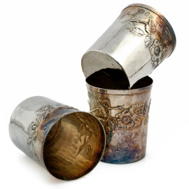 Lotto di tre bicchieri in argento 925/000 con decoro a sbalzo di fiori. Argentiere Brandimarte, altezza cm 8, peso gr 240