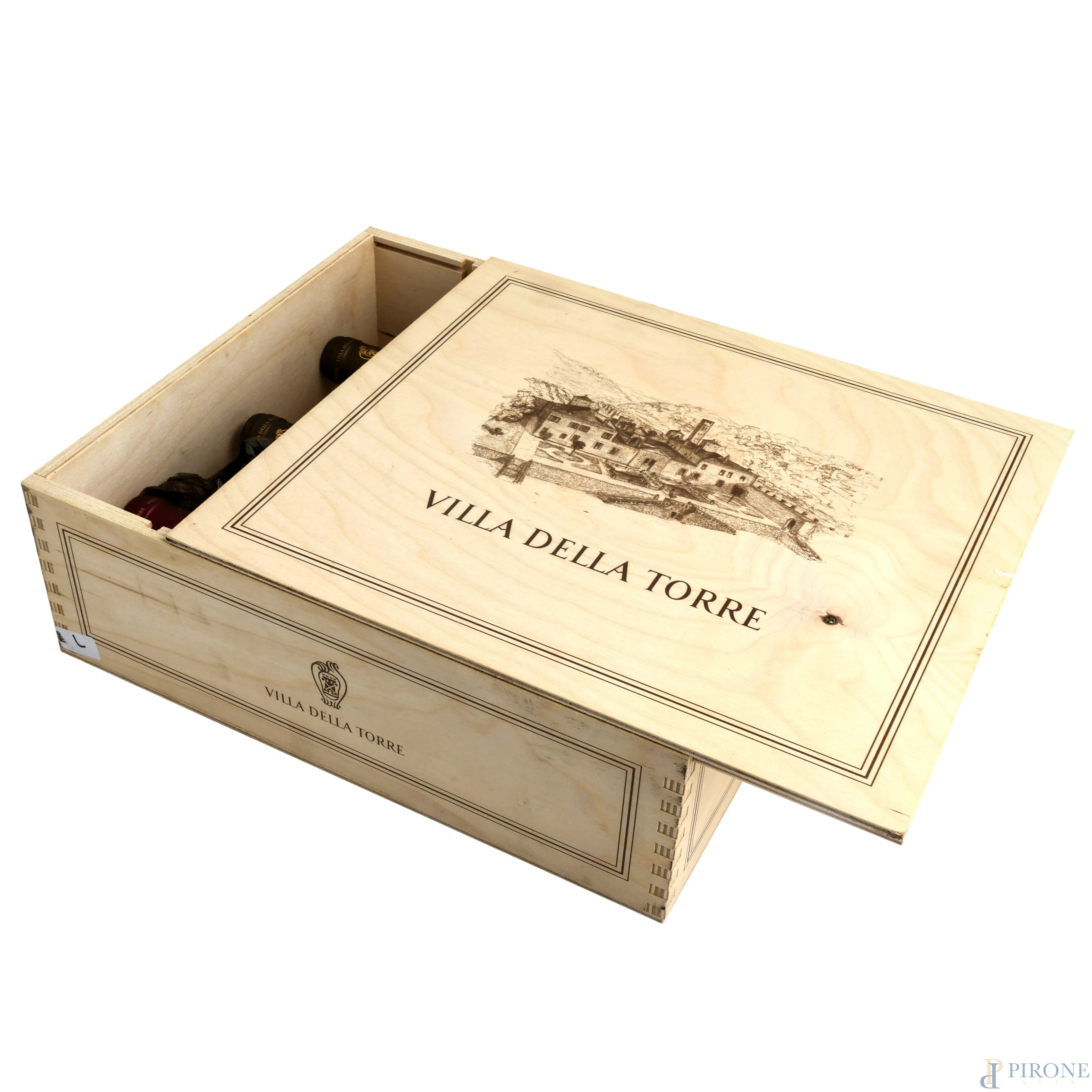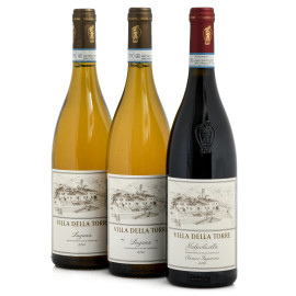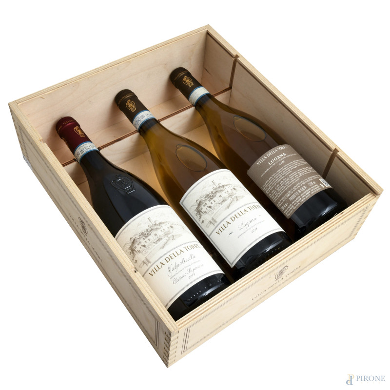 Lotto di tre bottiglie 0,75 cl Villa della Torre 2019 composto da due bianchi Lugana DOC e un rosso Valpolicella Classico Superiore DOC, entro cassetta lignea